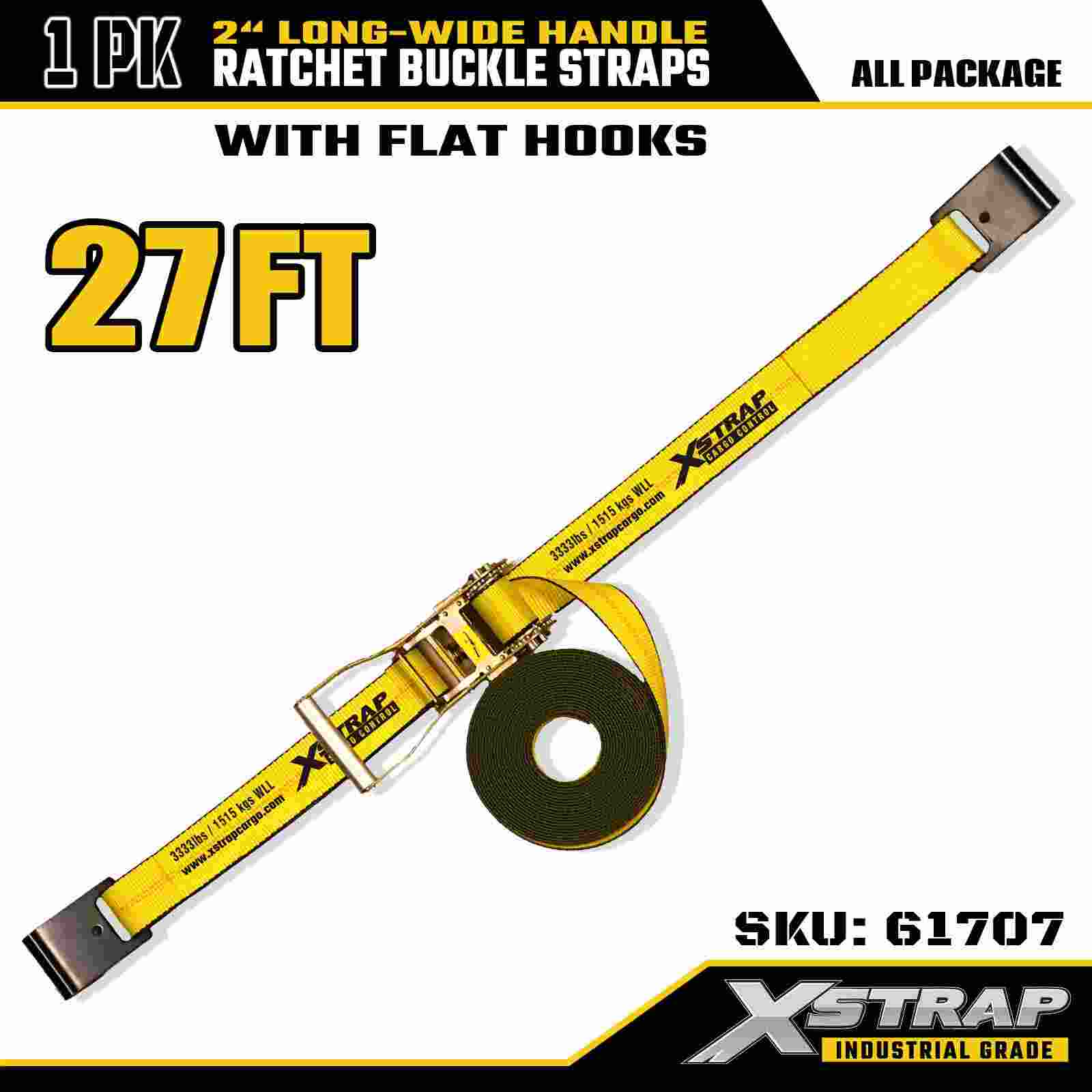 Xstrap 61707 Hosszú, széles fogantyús racsnis hevederek 2" x 27 láb (1 csomag) - Lapos horgok, 10 000 font törési szilárdság, nagy teherbírású rögzítőpánt a biztonságos szállításhoz