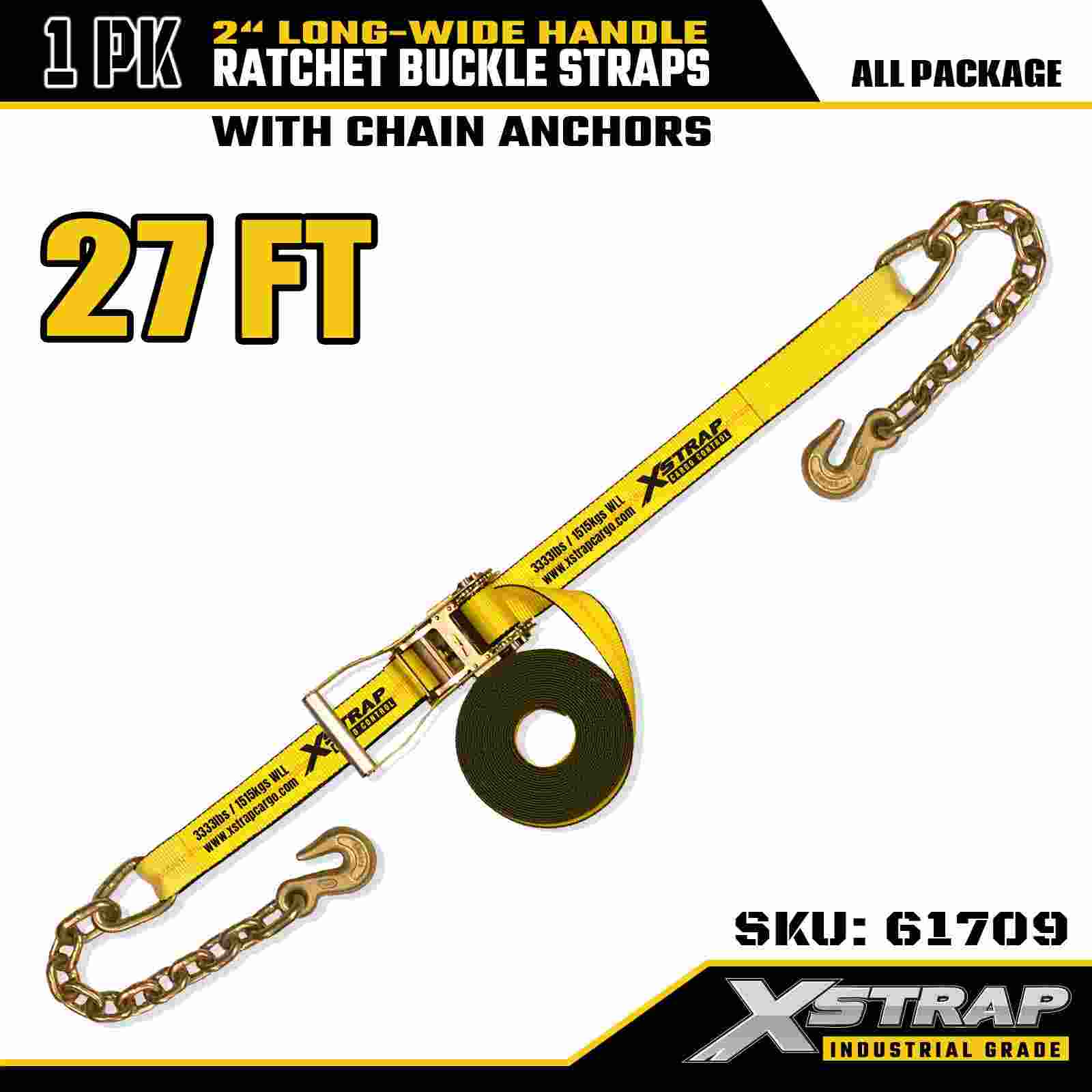 Xstrap 61709 Hosszú, széles fogantyú racsnis csatszíjak 2" x 27 láb (1 csomag) -val Lánchorgok, 10 000 font törési szilárdság, nagy teherbírású rögzítőszíj a biztonságos szállításhoz