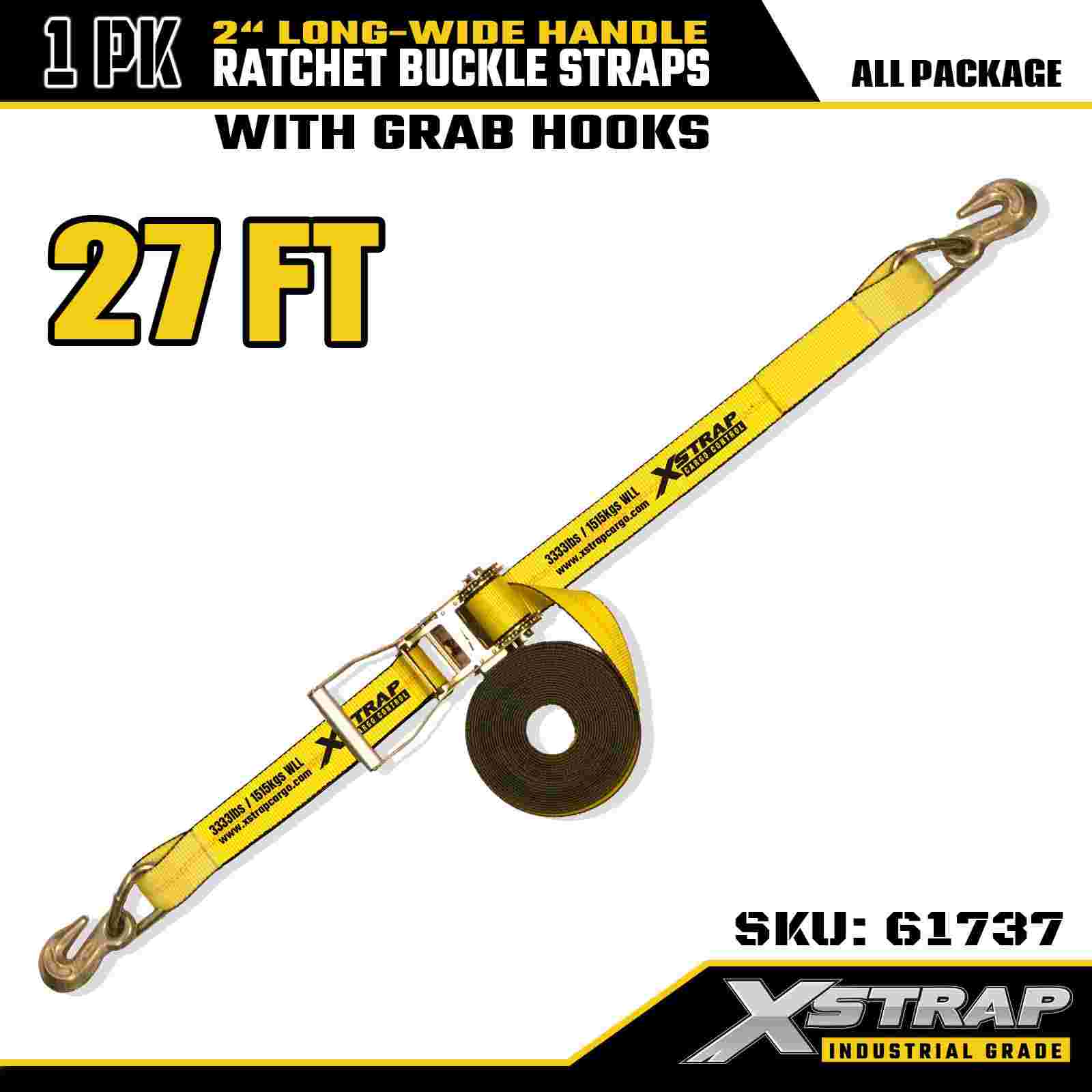 Xstrap 61737 Heavy Duty 2" x 27" 1PK racsnis heveder kapaszkodóhorgokkal, sárga, WLL 3333 lb, hosszú, széles fogantyú racsnis rögzítőszíj gépekhez és berendezésekhez