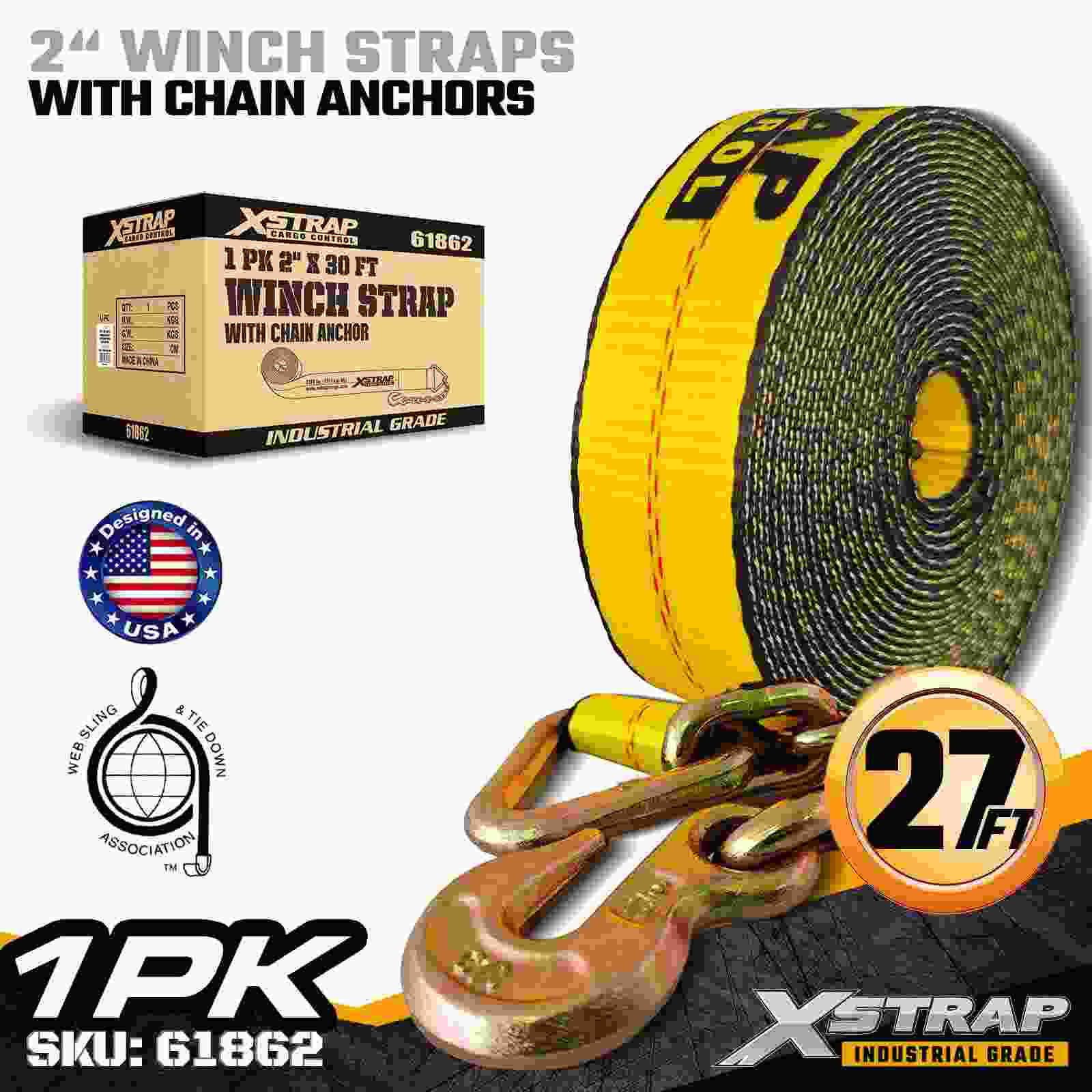 Az Xstrap 61862 2" × 30 láb méretű, szabványos csörlőszíj megbízható síkágyas rakományrögzítésre készült, tartós lánchorgonyokkal és nagy szilárdságú poliészter hevederekkel. 3333 lbs munkaterhelési határával és 10 000 lbs törési teljesítménnyel, napi teherbírást biztosít. csövek és általános logisztikai alkalmazások.