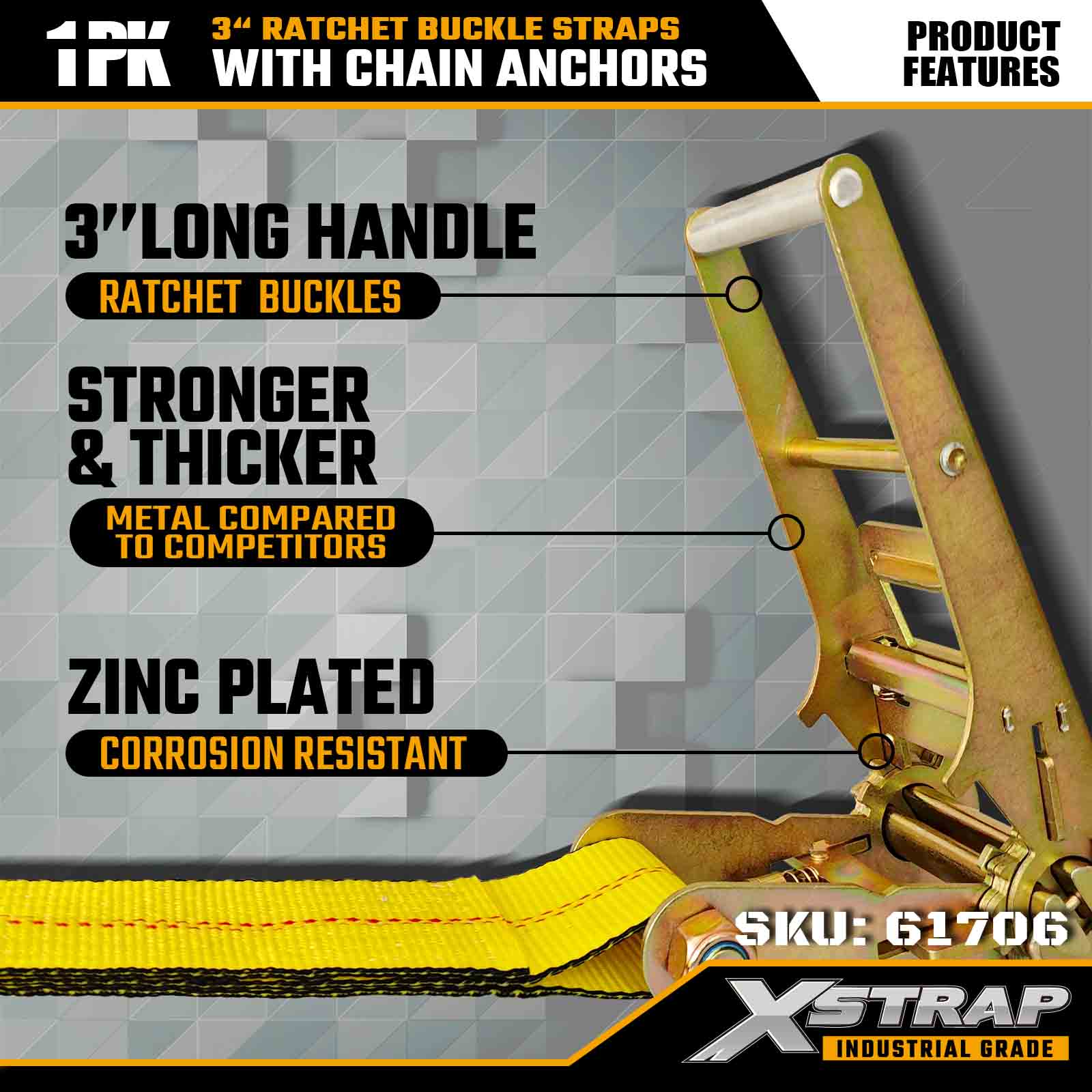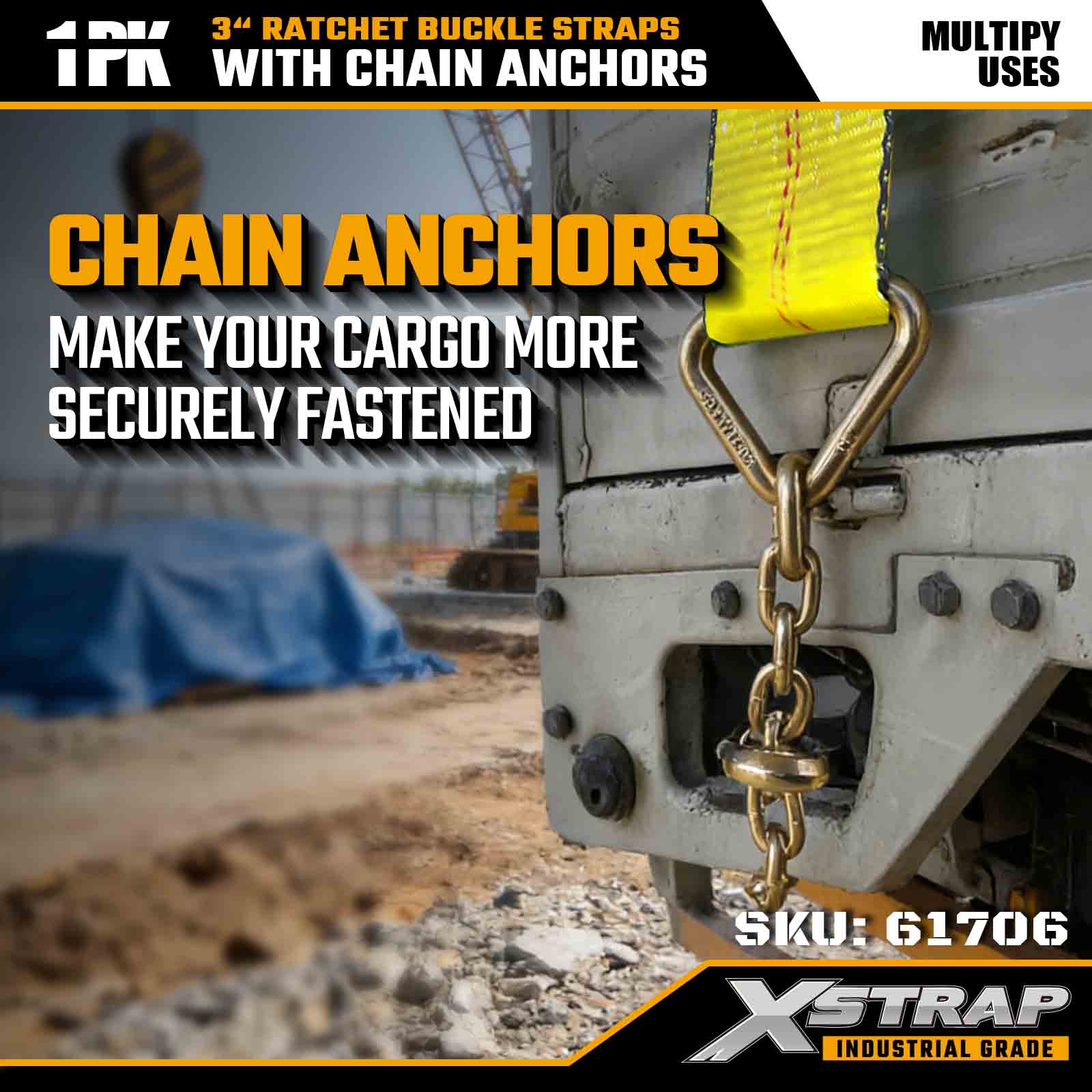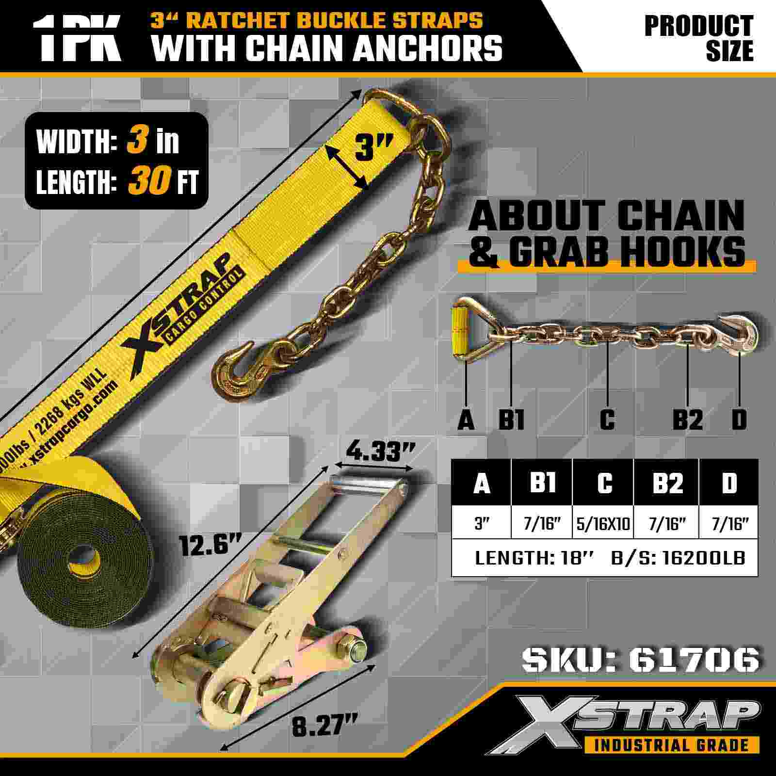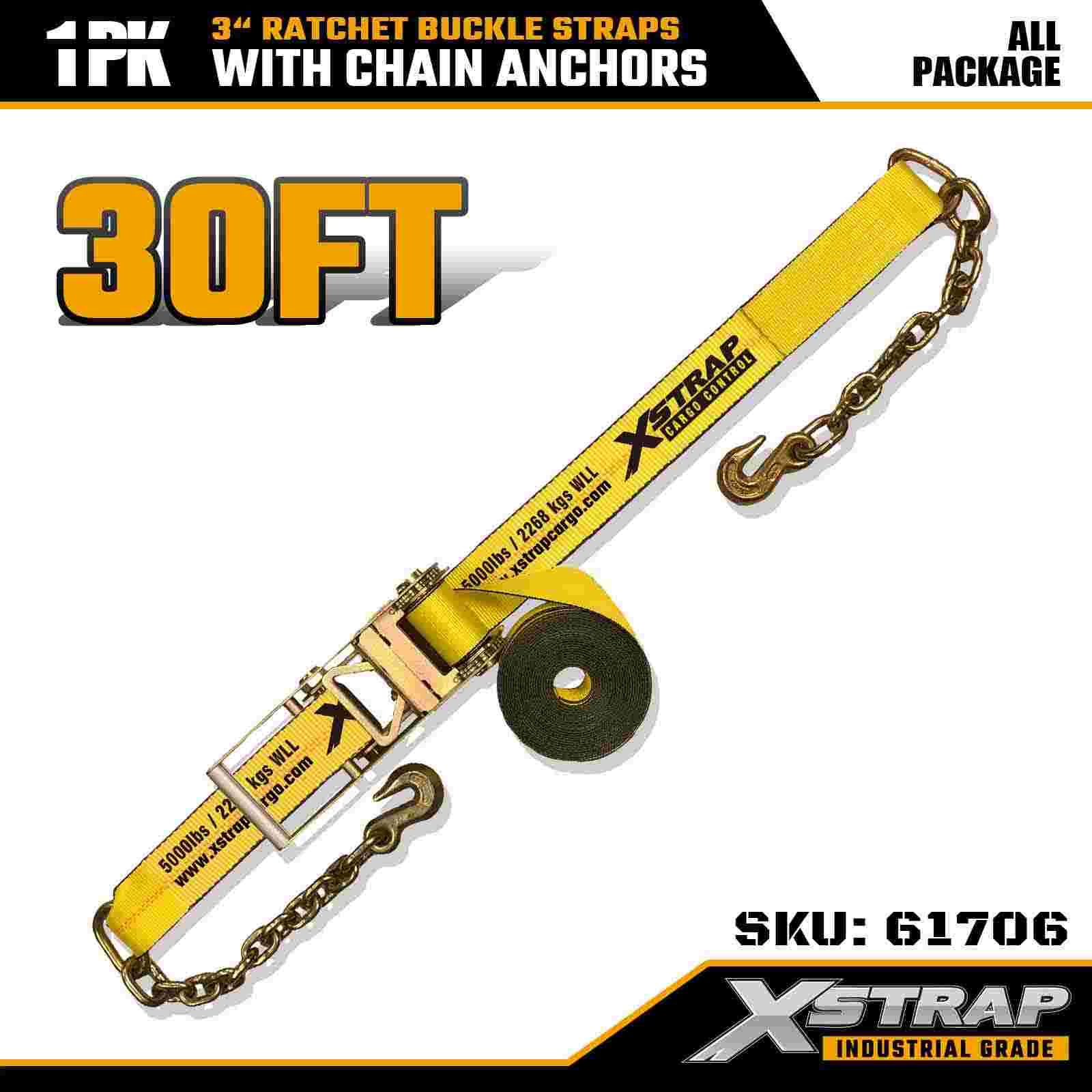 Az Xstrap 61706 3" × 30 láb racsnis csatszíjat (1 csomag) nagy teherbírású rakományrögzítésre tervezték, kovácsolt lánchorgonyokkal és nagy feszültségű racsnis rendszerrel. 5000 lbs WLL-vel és 15 000 lbs-os teherbírásával szállítja, szállítja és megbízható gépi törési szilárdságot biztosít.