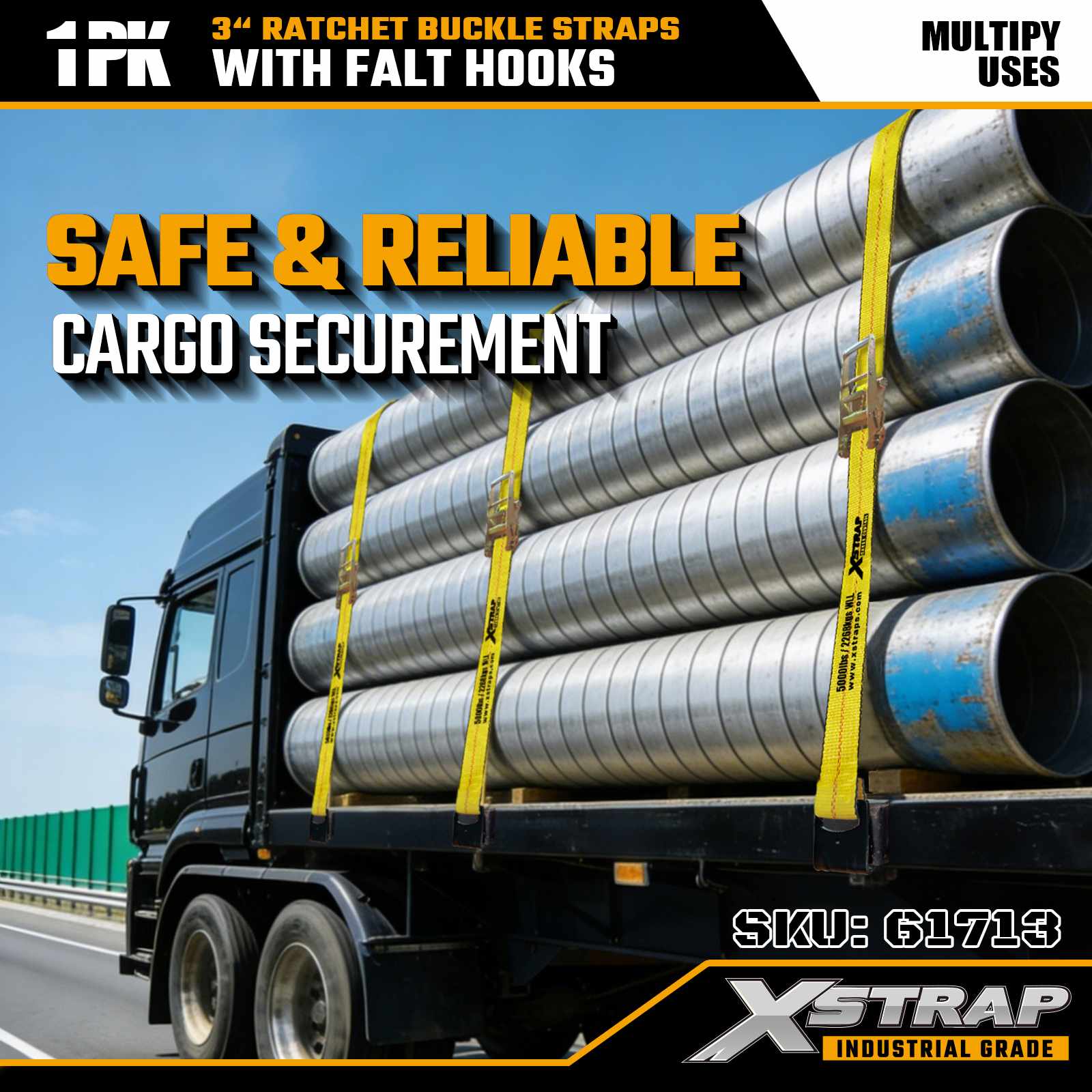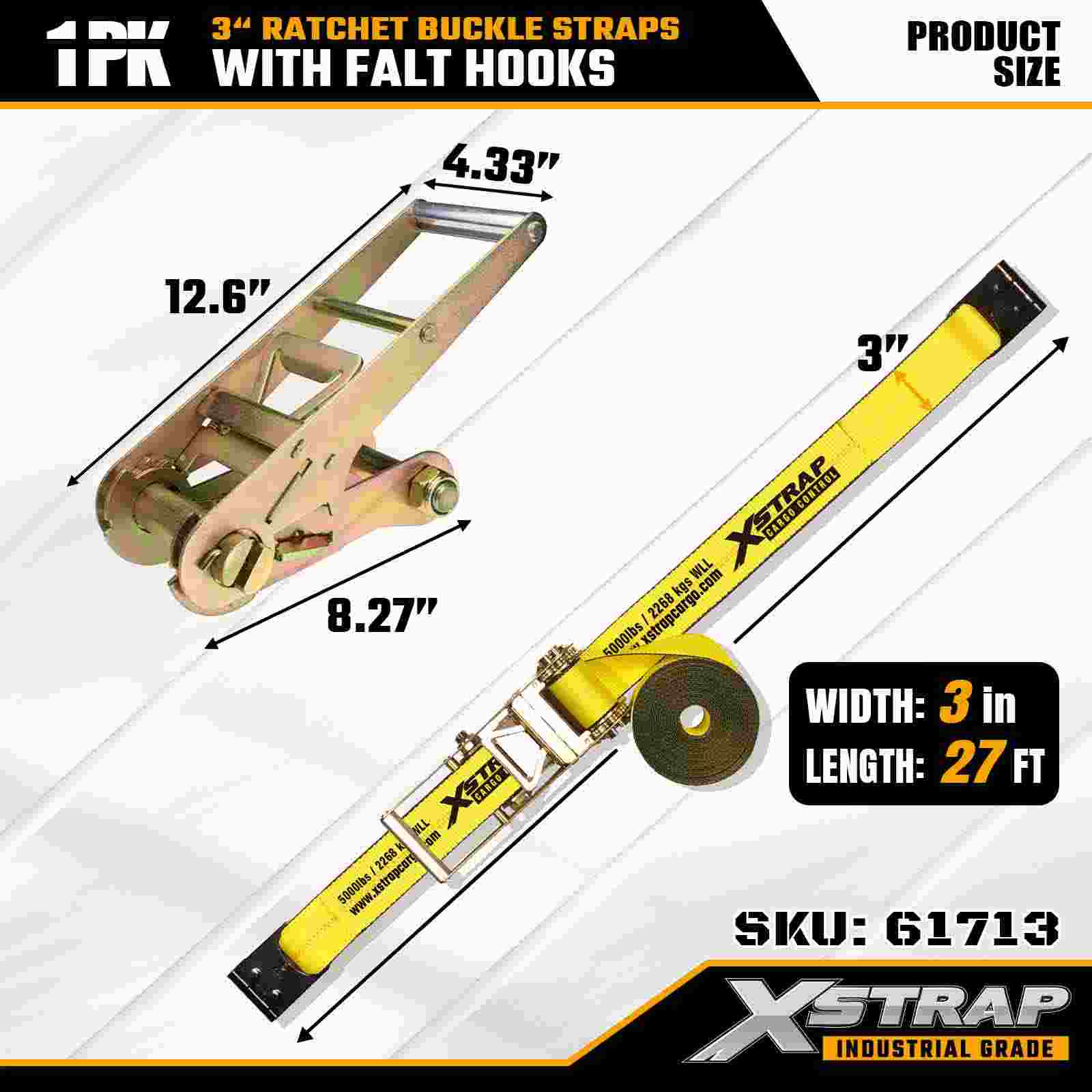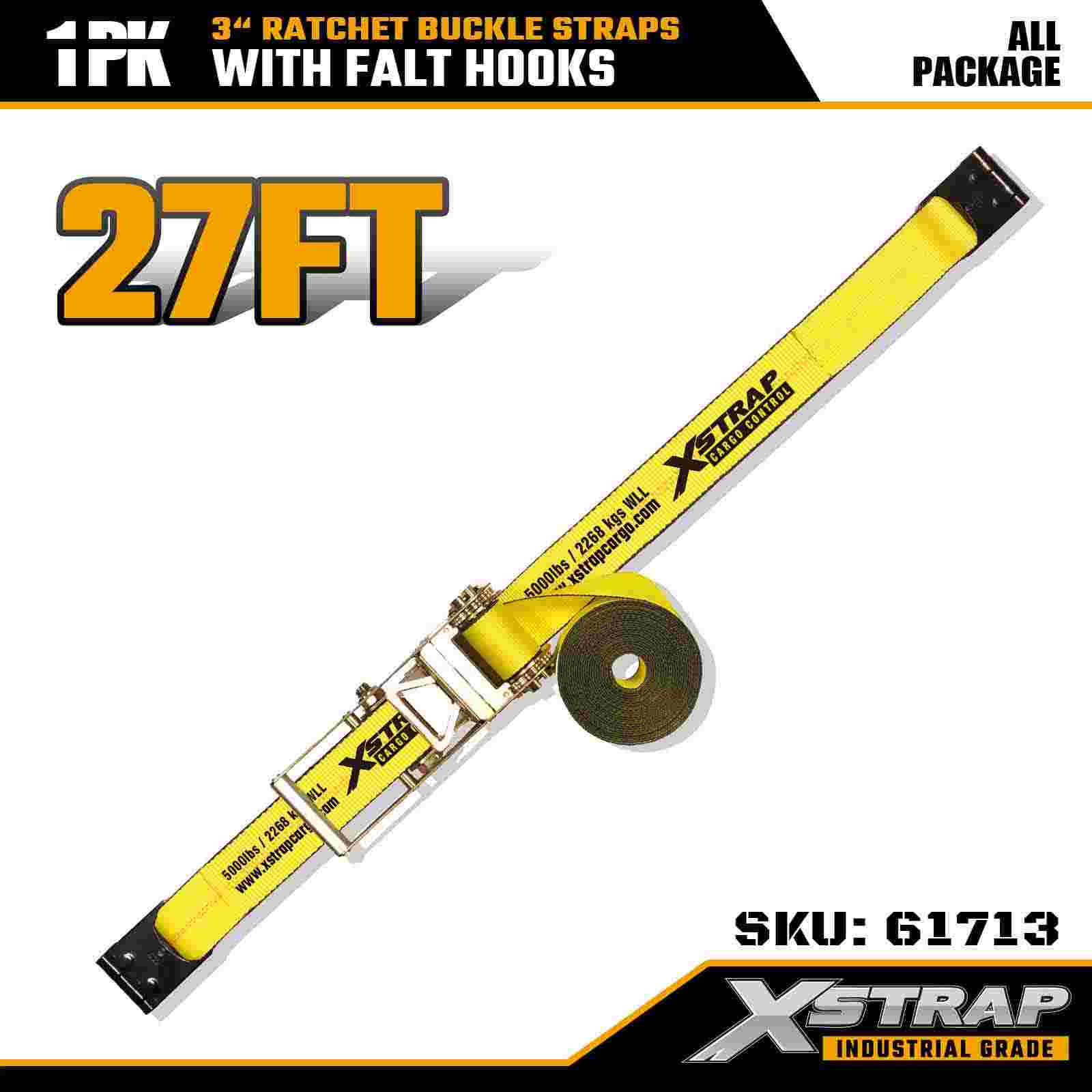Xstrap 61713 3" x 27 láb racsnis csatszíjak (1 csomag) Lapos horgok, 5000 font teherbírás 15 000 font törési szilárdság, nagy teherbírású rögzítés teherautókhoz, pótkocsikhoz és ipari teherszállításhoz.