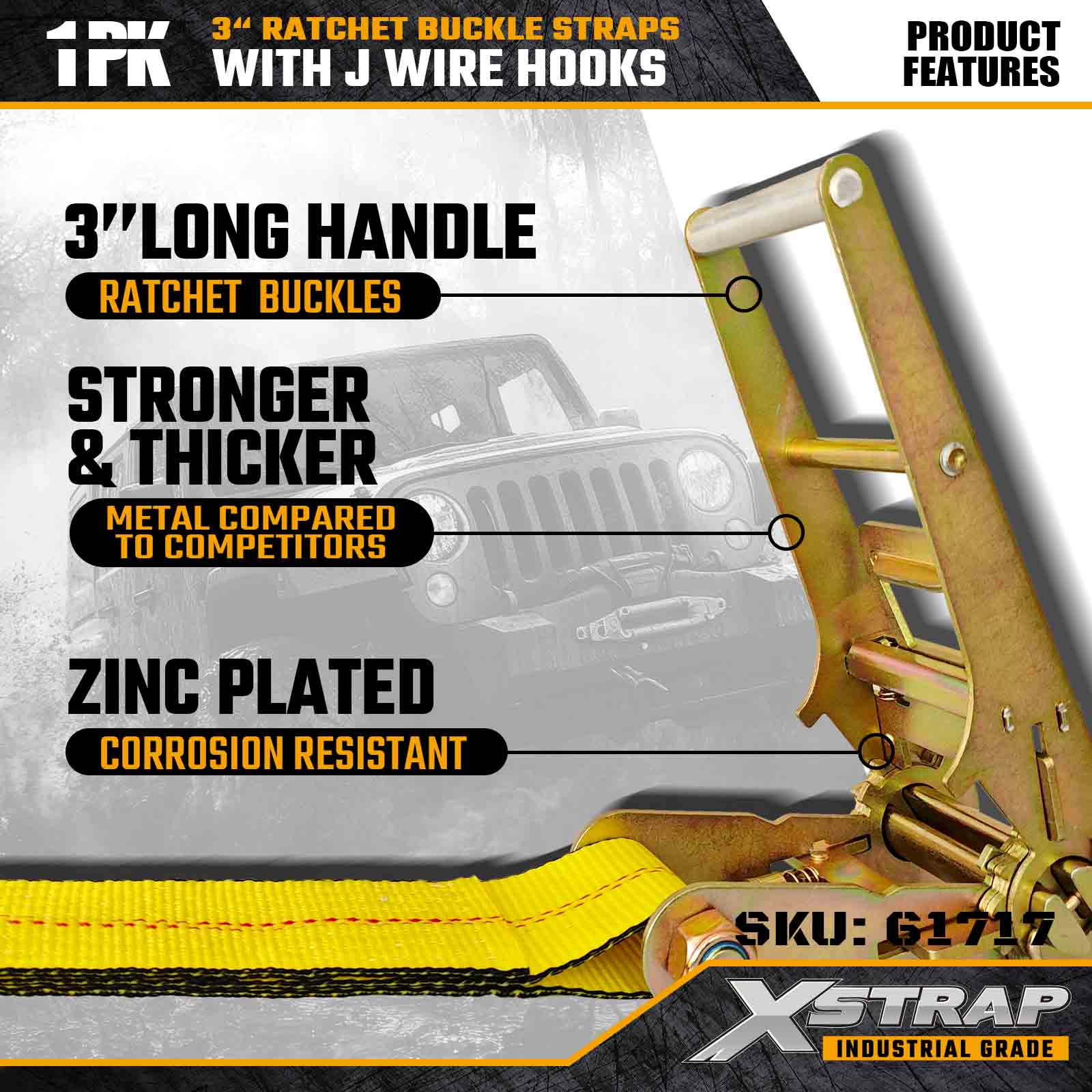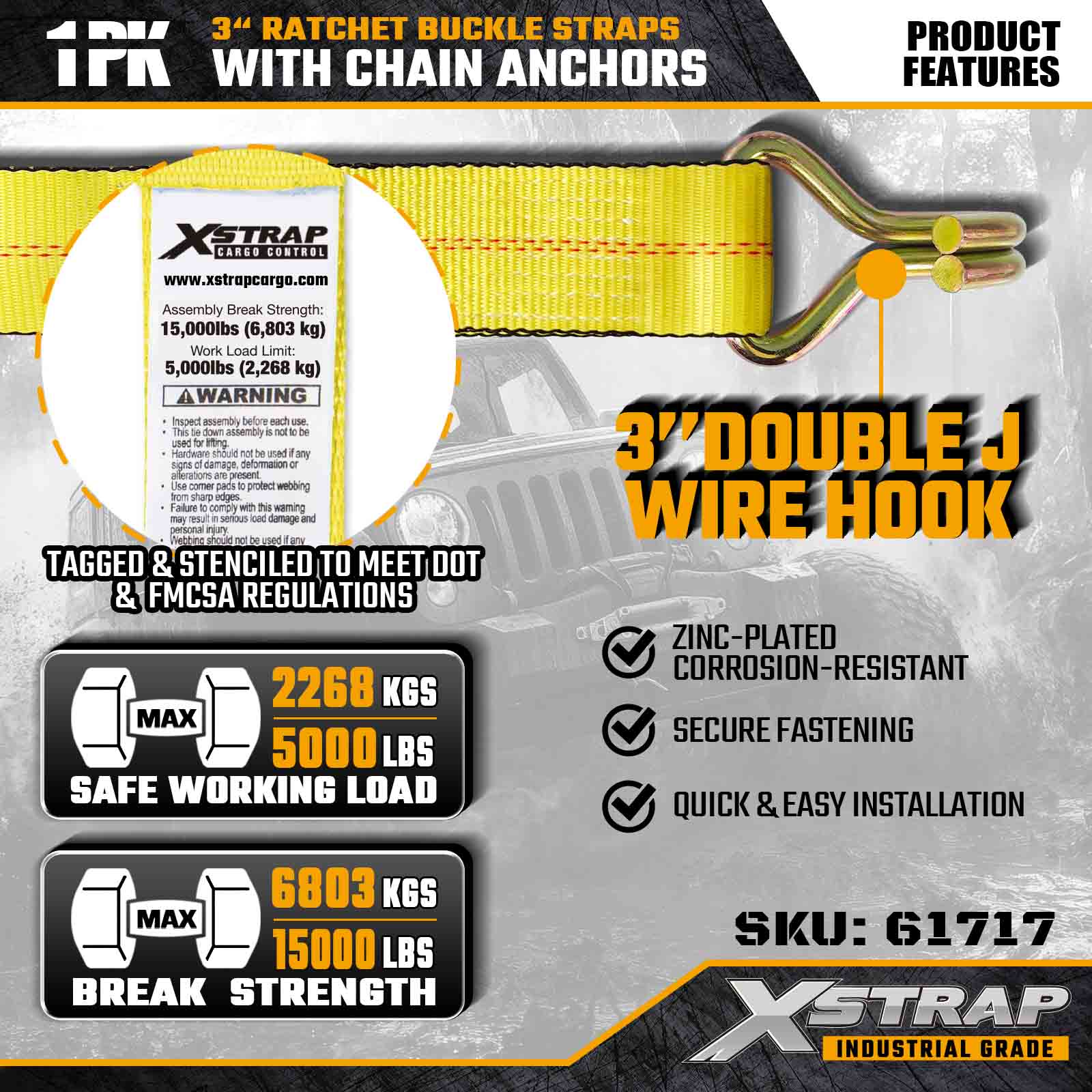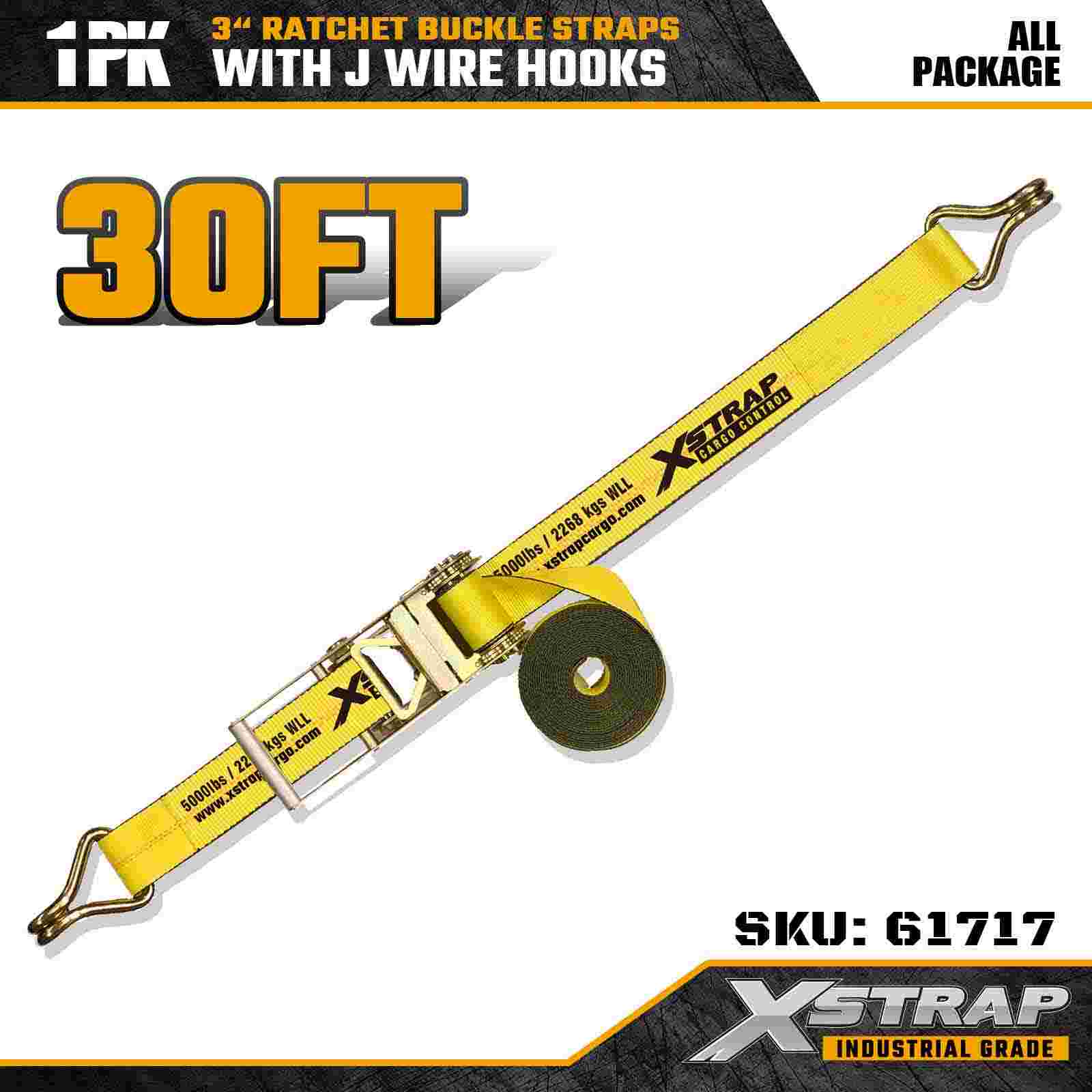 Az Xstrap 61717 3" × 30 láb racsnis csatszíjat (1 csomag) az igényes rakományozási alkalmazásokhoz tervezték, megerősített drótkampókkal és nagyfeszültségű racsnis rendszerrel. 5000 font terhelési korláttal és 15 000 font, megbízható szállítási, ipari szállítóberendezéssel, szakítószilárdsággal. logisztika.