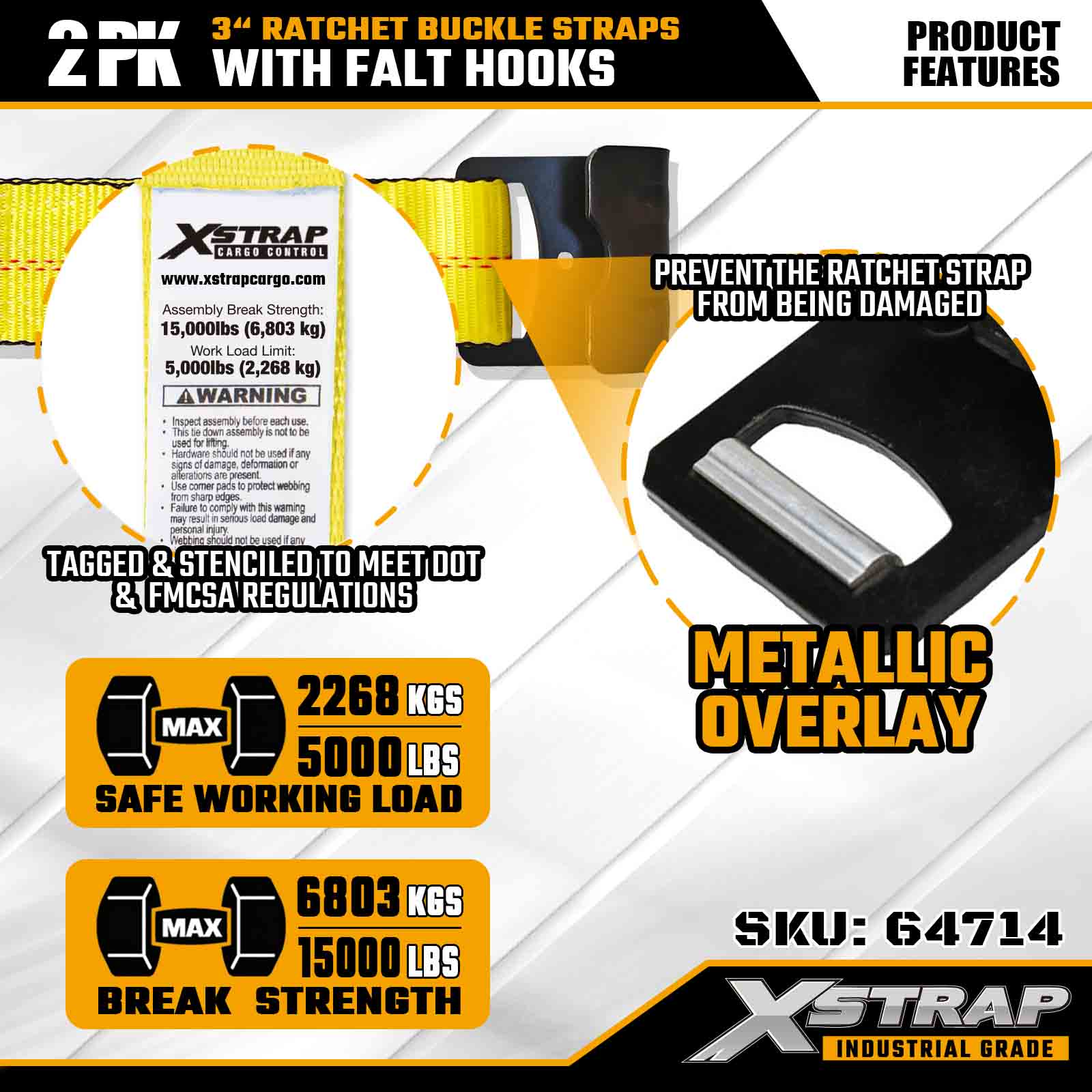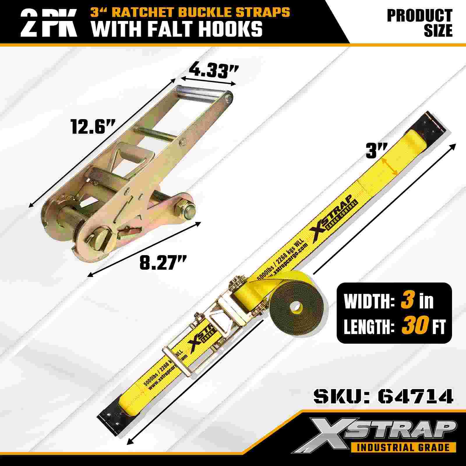 Xstrap 64714 3" x 30 láb racsnis csatszíjak (2 csomag) – lapos horgok, 5000 font teherbírás, 15 000 font törési szilárdság. A professzionális rakományszabályozásra tervezett nagy teherbírású hevederek széles hatótávolságot és kényelmes szállítást biztosítanak teherautókhoz, ipari pótkocsikhoz és kettős csomaggal.