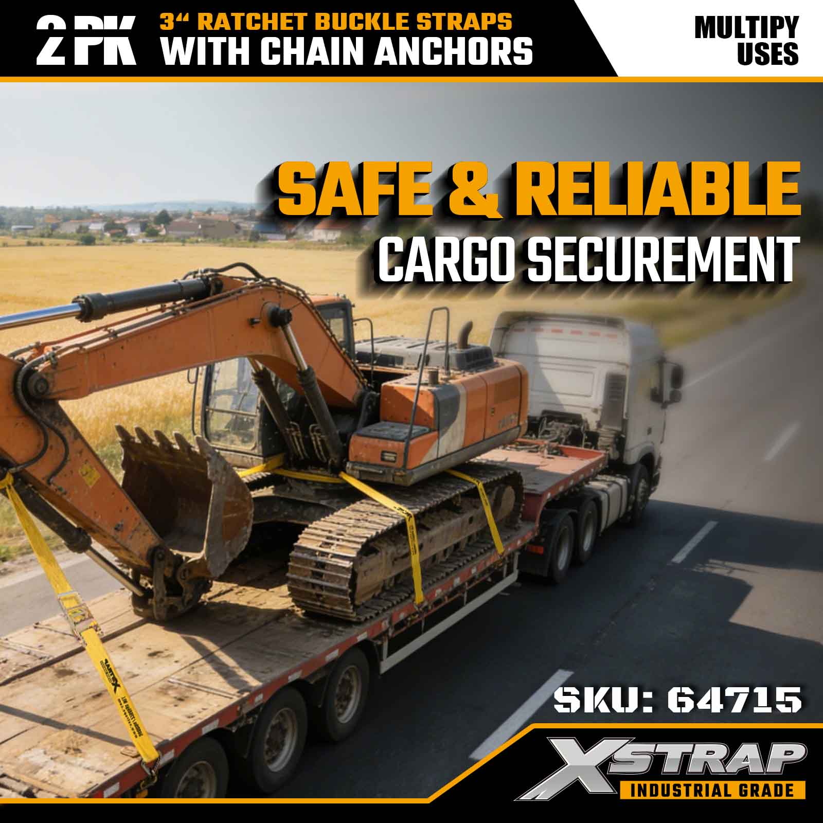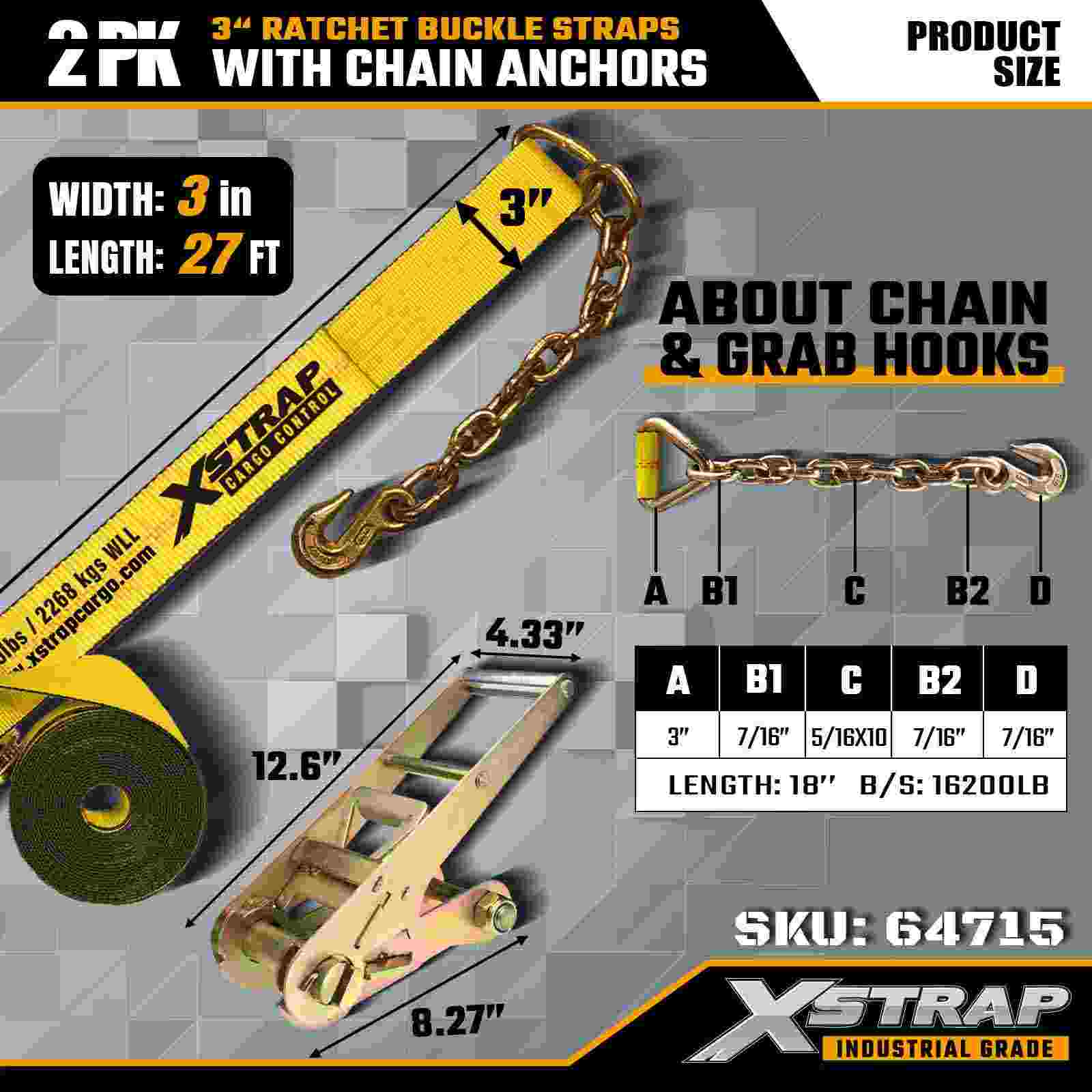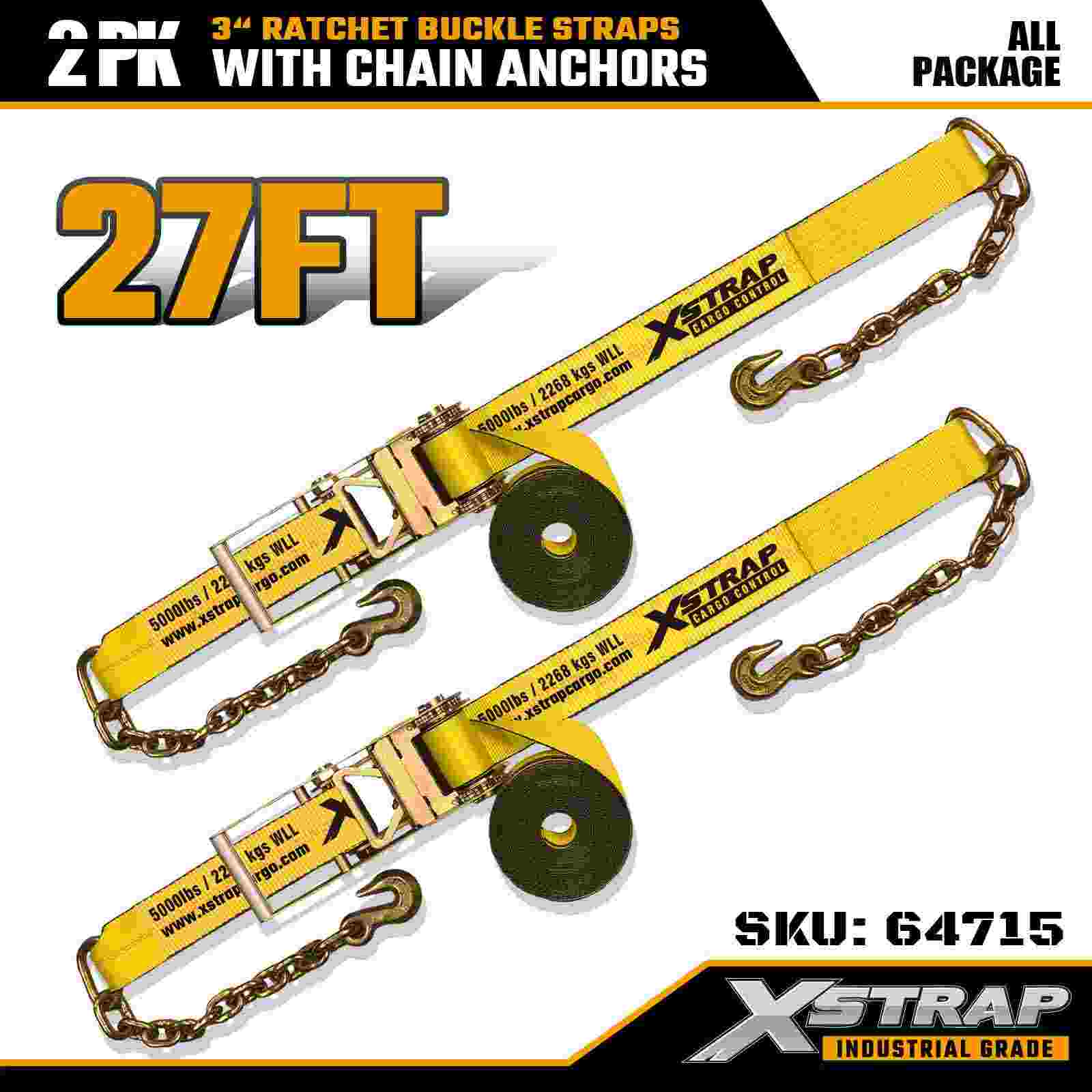 Xstrap 64715 3" × 27 láb racsnis csatszíjak (2 csomag) – nagy teherbírású lánchorgonyokkal felszerelt, igényes rakománykörnyezetekhez tervezték. 5000 font üzemi terhelési korlátja és 15 000 font törési szilárdsága révén ezek a lapos hevederek professzionális, biztonságos és biztonságos teljesítményt nyújtanak. gépszállítás, ipari fuvarozás.