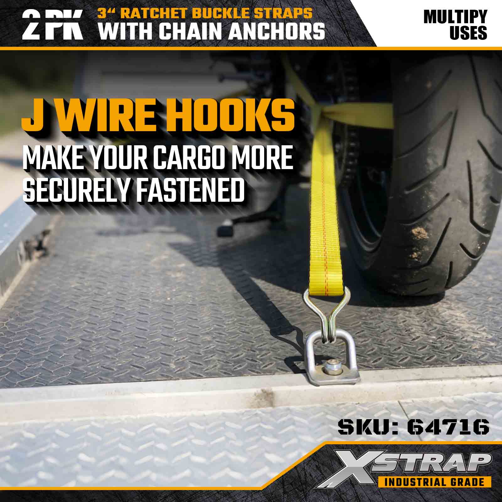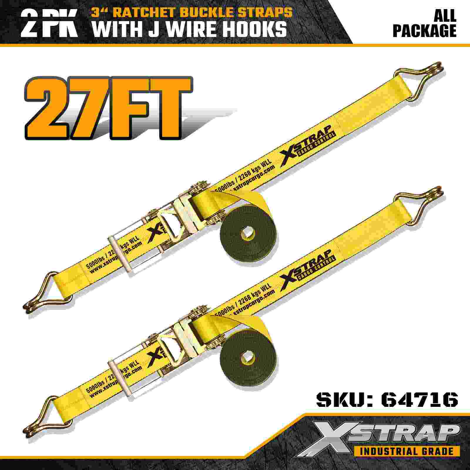 Az Xstrap 64716 3" × 27 láb racsnis csatszíjak (2-csomag) professzionális rakományrögzítésre készültek, nagy szilárdságú drótkampókkal és tartós racsnis mechanizmussal. 5000 font terhelési korláttal és 15 000 font teljesítménnyel ezek a szállítószalagok, szakítószilárdság nélkül. és ipari fuvarozási feladatokat.