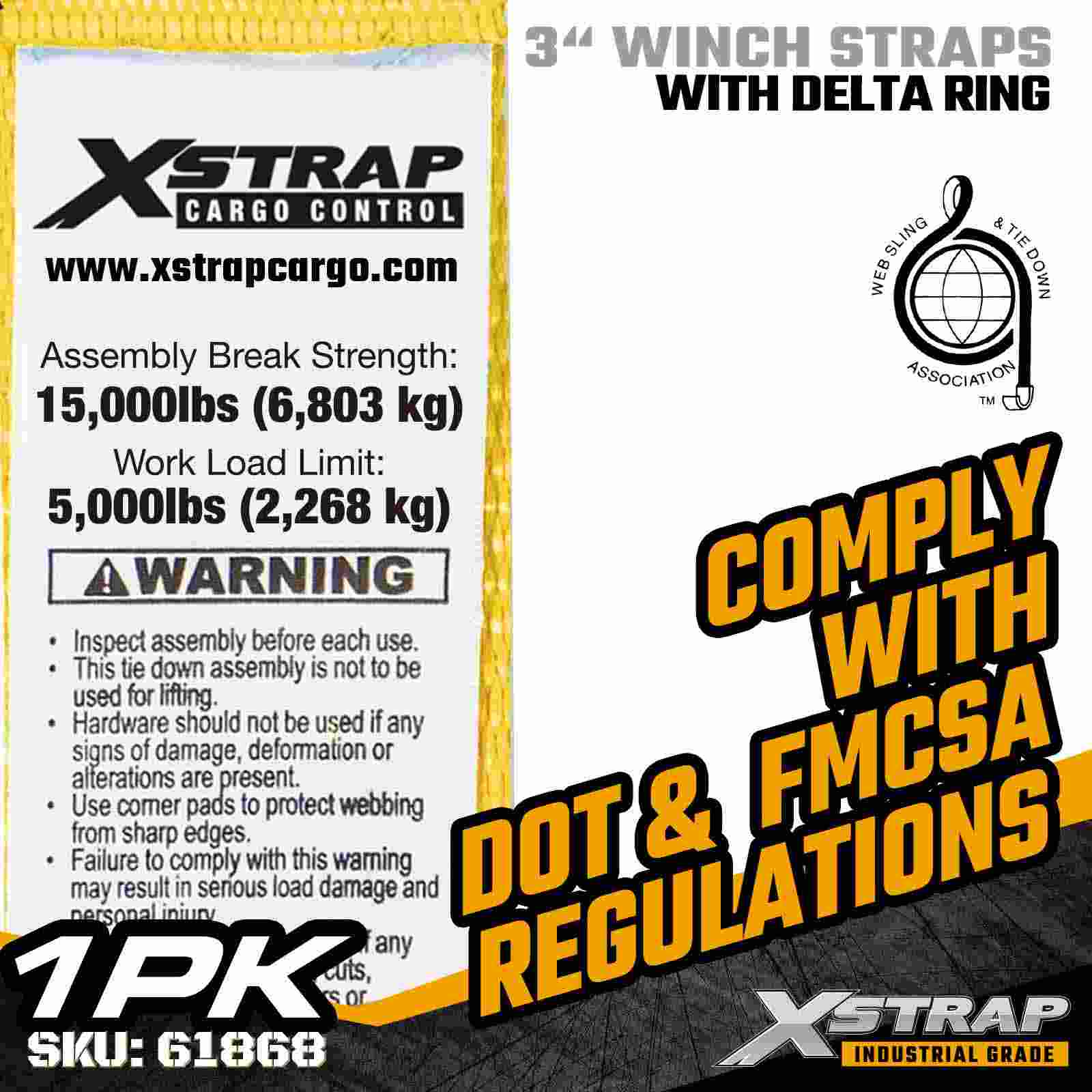 Az Xstrap 61868 3" × 27 láb szabványos csörlőszíj egy nagy teherbírású rakományrögzítési megoldás, amelyet platós pótkocsikhoz és nagy teherbírású szállításhoz terveztek. Megerősített Delta gyűrűgel és extra széles, 3 hüvelykes poliészter hevederrel, ez a 3 hüvelykes csörlőszíj 5000 Lo5000 Lo5100 l, 000 l, 000 l, 000 l, 0 Szakítószilárdság Ideális túlméretezett rakományok, például fűrészáru, acél, gépek és ipari rakományok rögzítésére az igényes szállítási műveletek során.