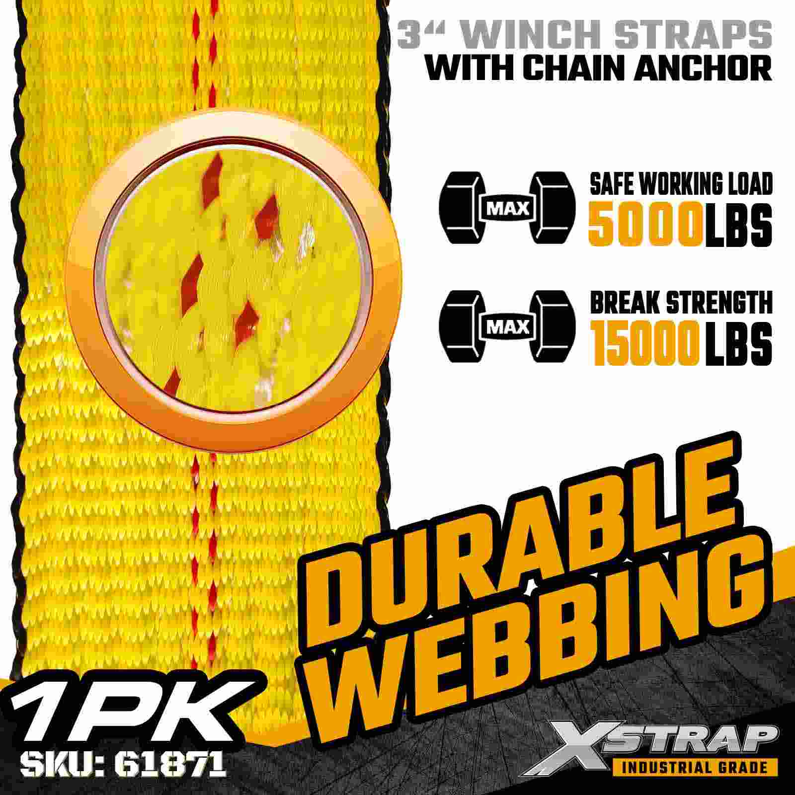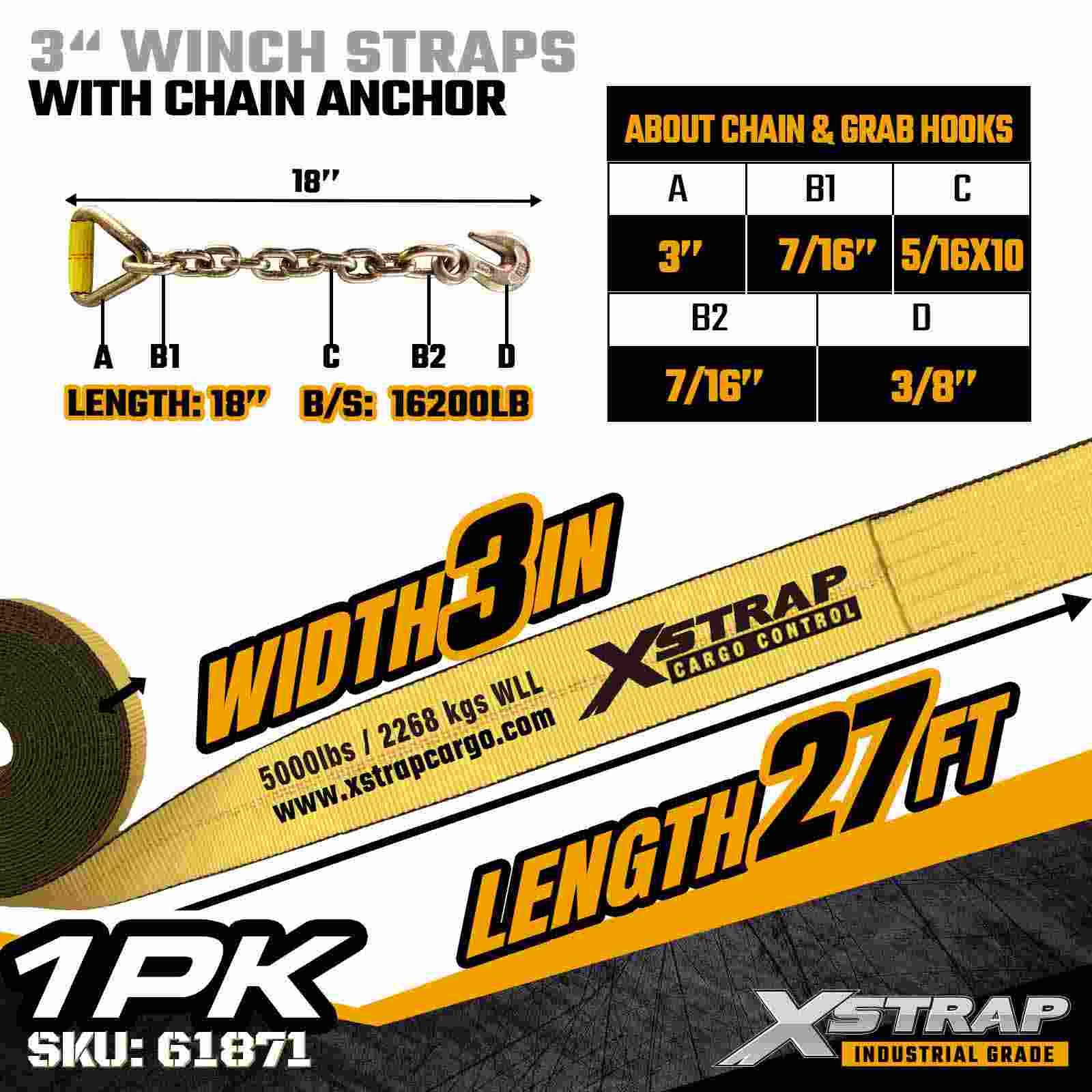 Az Xstrap 61871 3" × 27 láb méretű, szabványos csörlőszíjat nagy teherbírású rakományrögzítésre tervezték platós pótkocsikon. A kovácsolt lánchorgony és az extraszéles, 3 hüvelykes poliészter heveder, ez a 3 hüvelykes csörlőszíj 5000 lbs-t és 0,000 lb-t tesz ki. Olyan igényes ipari alkalmazásokhoz tervezték, ahol maximális tartószilárdság és stabilitás szükséges.
