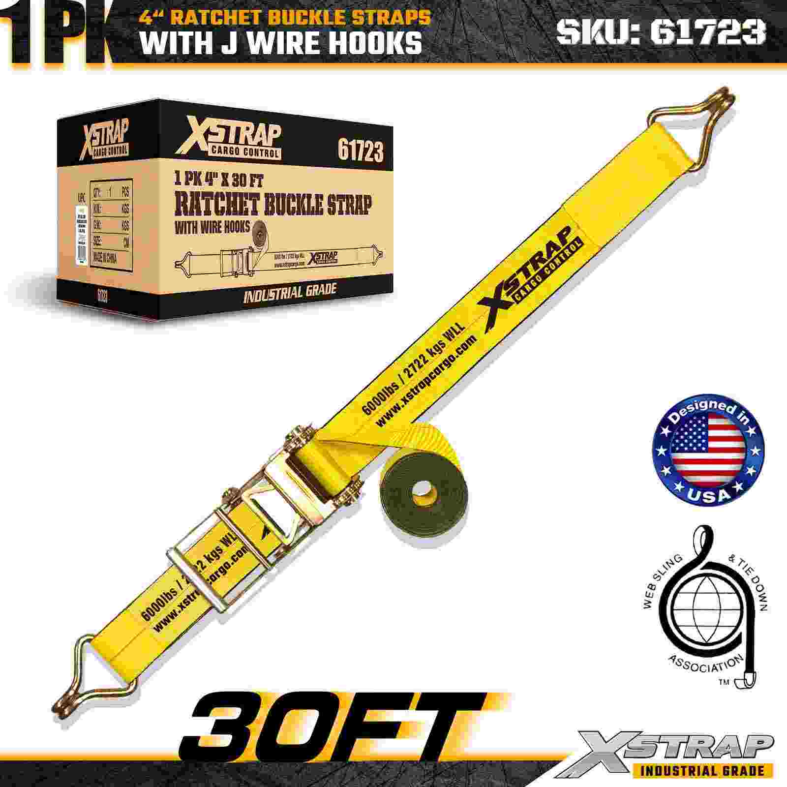 Az Xstrap 61723 4" × 30 láb racsnis csatszíj (1 csomag) nagy teherbírású rakományrögzítésre készült, megerősített drótkampókkal és tartós racsnis mechanizmussal. A 6000 font terhelési korláttal és a 18 000 font súlyú, lapos, robusztus szállításhoz ideális gép. fűrészáru, acél rakományok és ipari rakomány alkalmazások.
