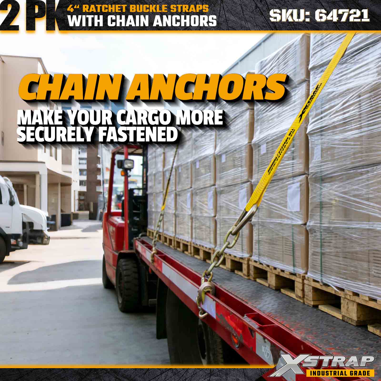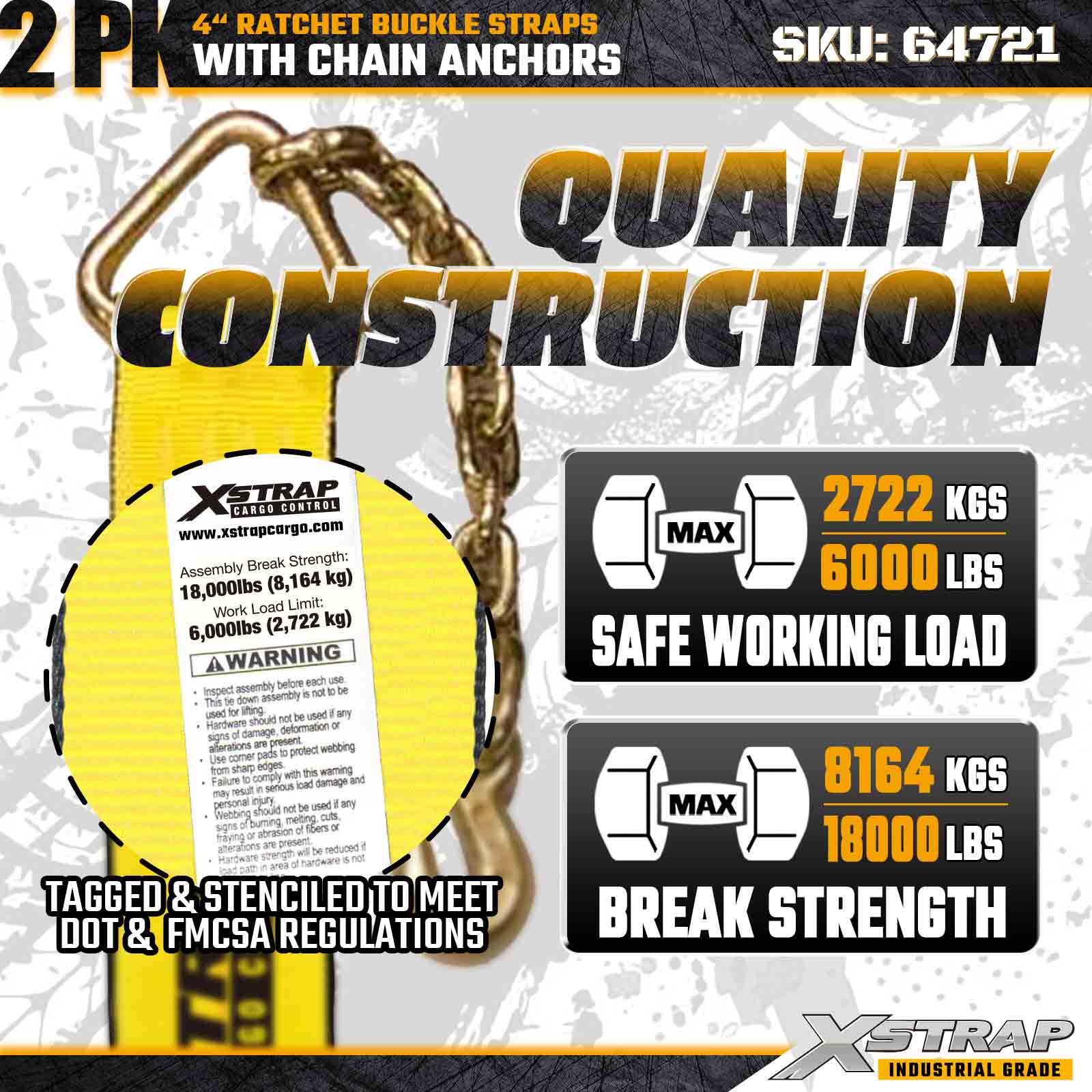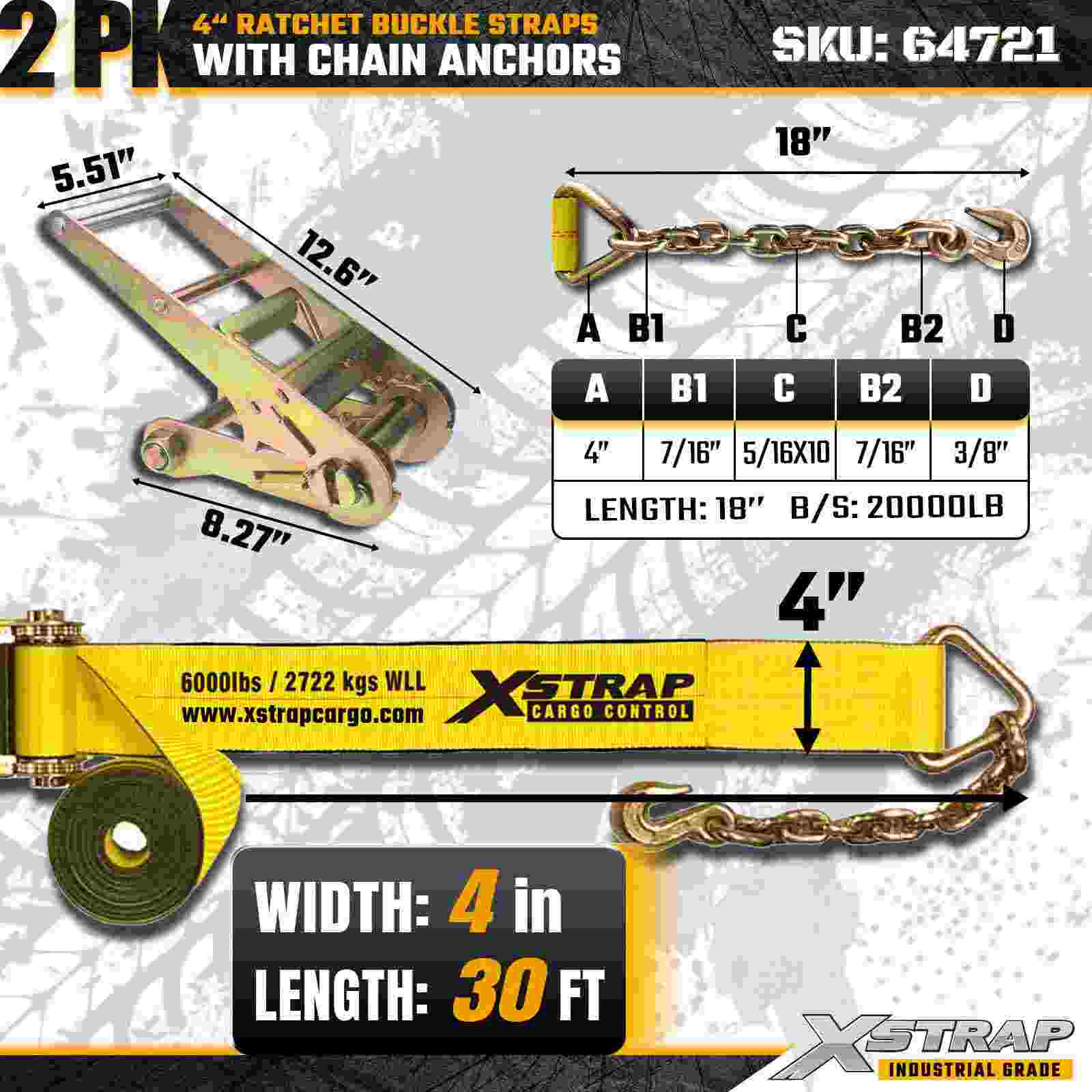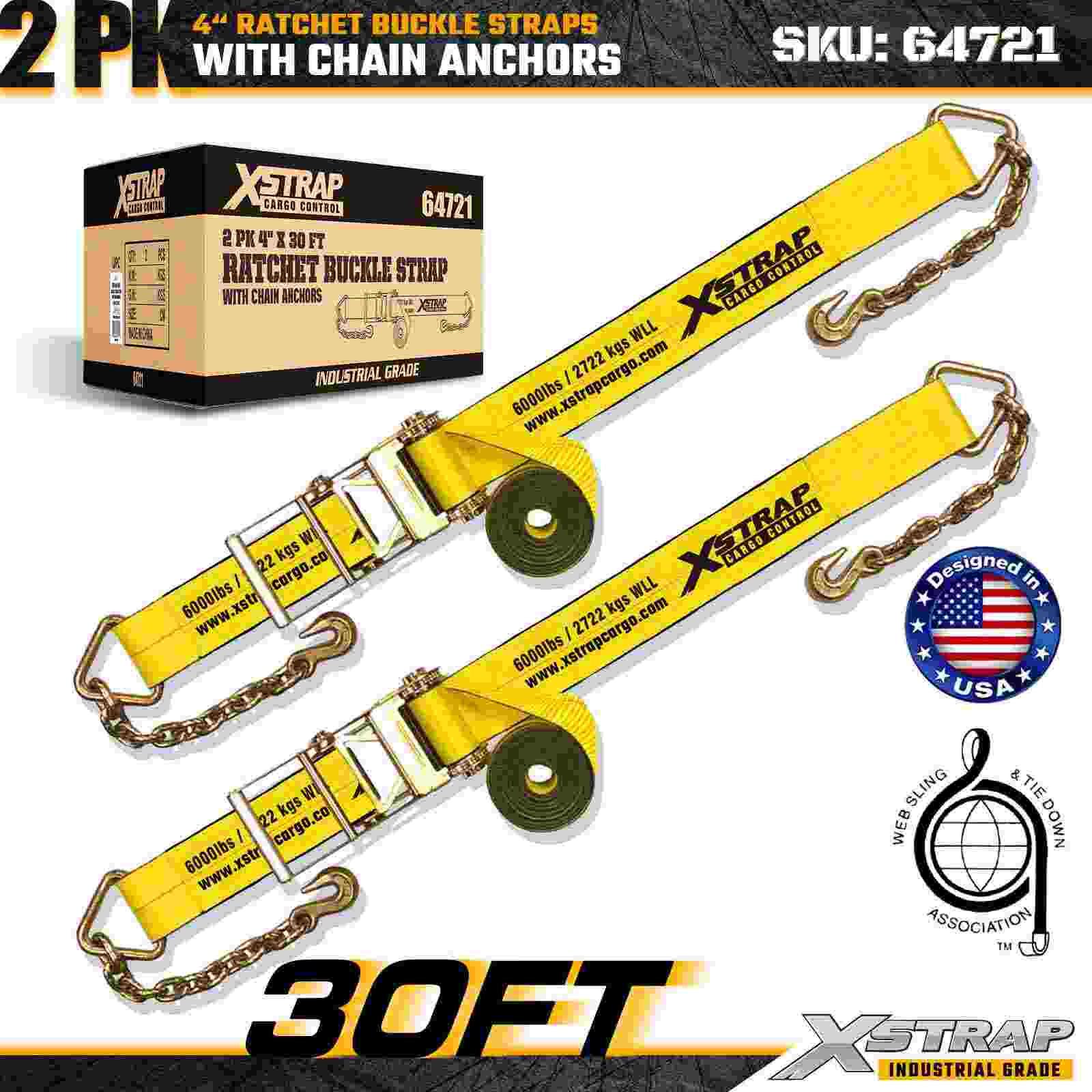 Az Xstrap 64721 4" × 30 láb racsnis csatszíjakat (2 csomag) nagy teherbírású rakományrögzítésre tervezték, masszív lánchorgonyokkal és megerősített racsnis mechanizmussal. A 6000 font terhelési korláttal és a 18 000 lbs-os, lapos szilárdságú, strapabíró gépek ideálisan megszakíthatók. szállítás, acél rakományok és ipari rakomány alkalmazások, amelyek maximális szilárdságot és megbízhatóságot igényelnek.