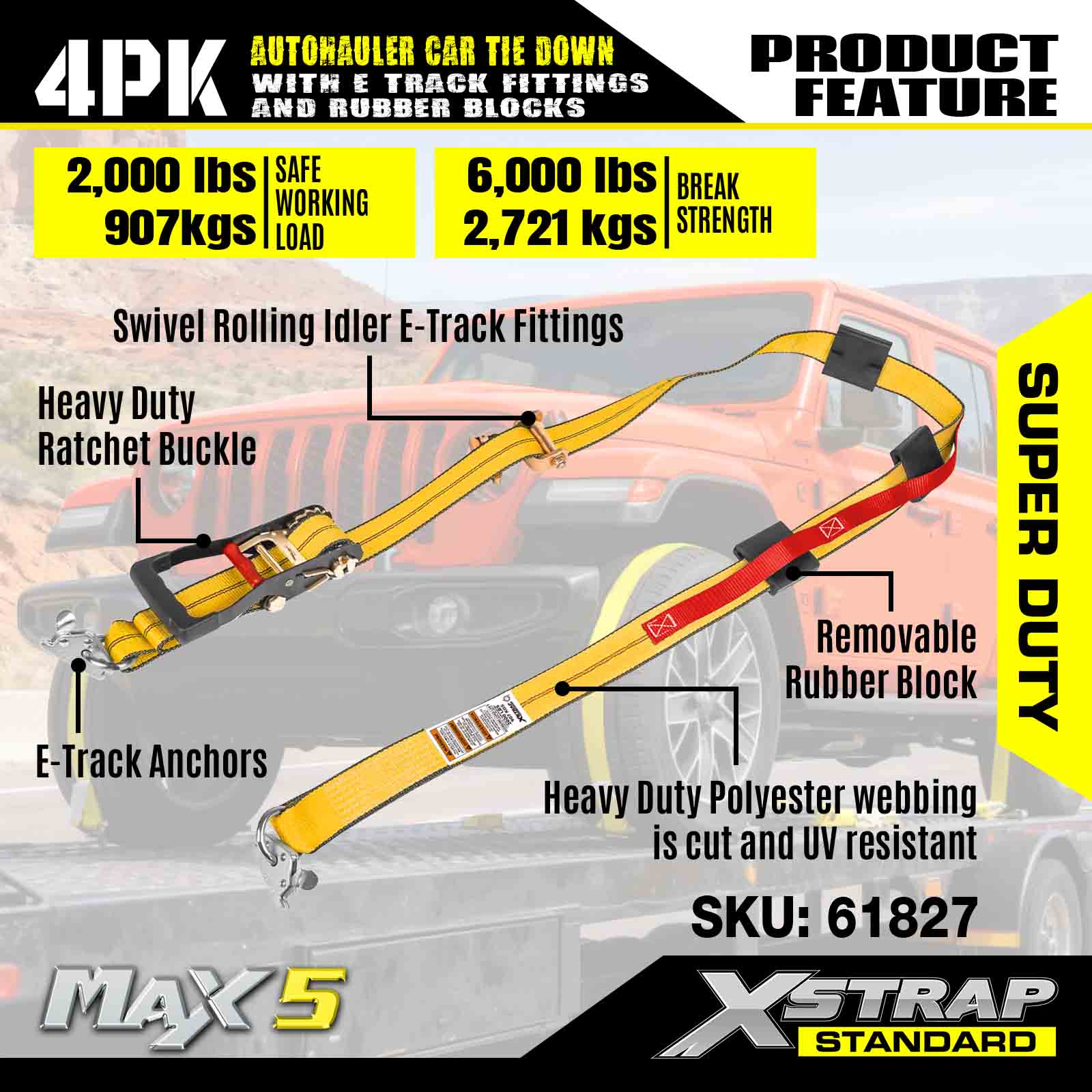- Prémium anyag: Nagy teherbírású, ipari minőségű poliészter hevederből készült rögzítő hevederek, amelyek vágás- és UV-állósággal rendelkeznek a hosszan tartó tartósság érdekében minden járműszállítási forgatókönyvben.