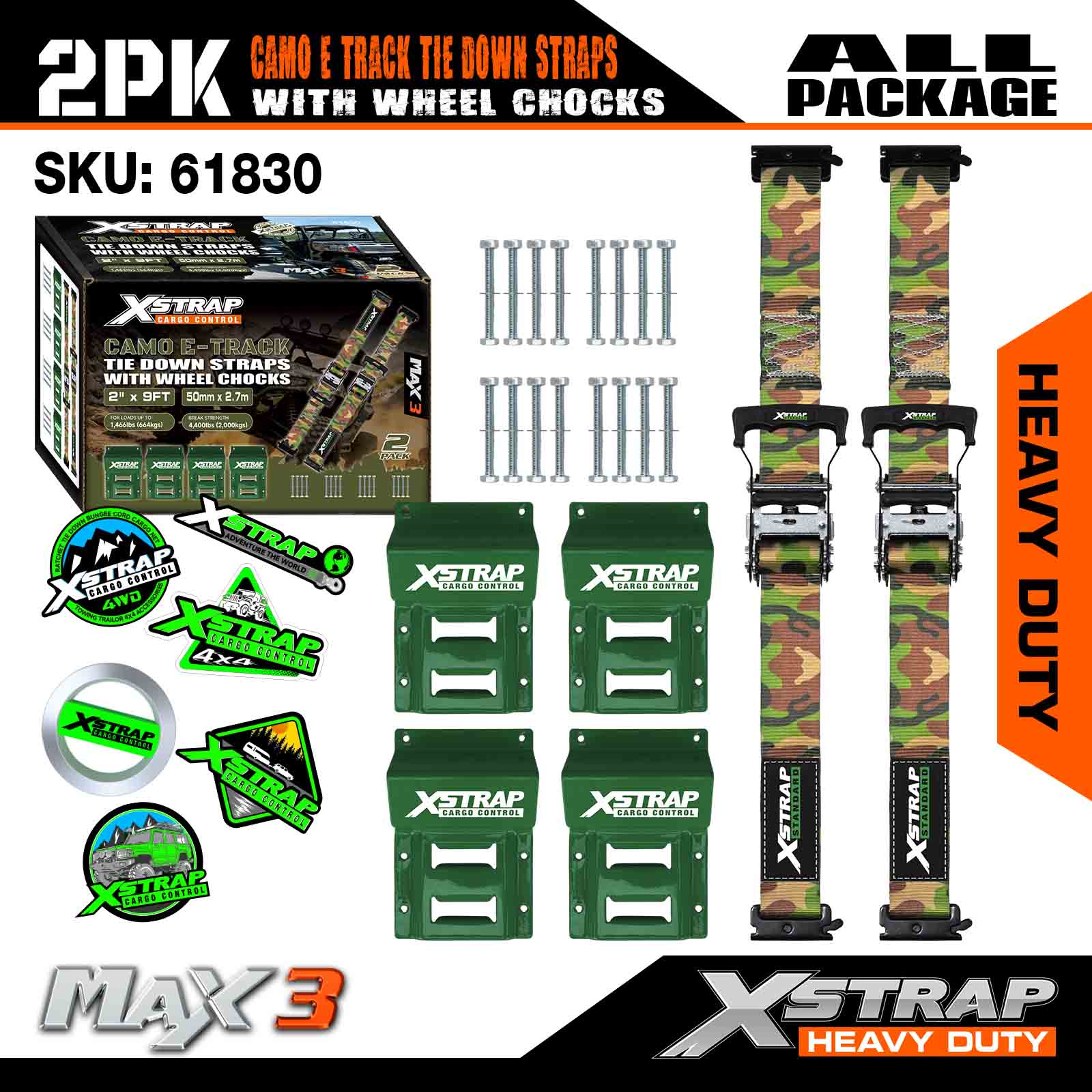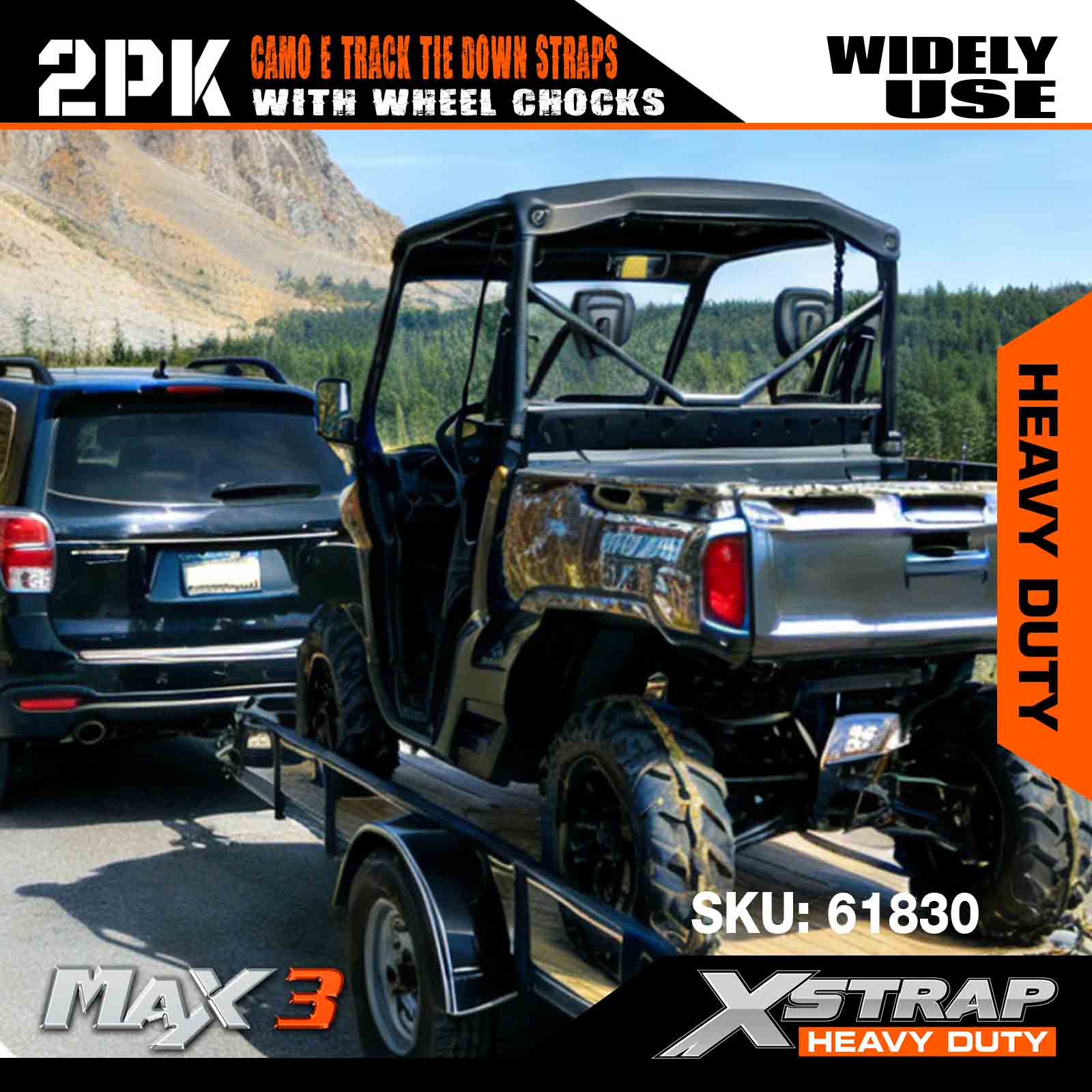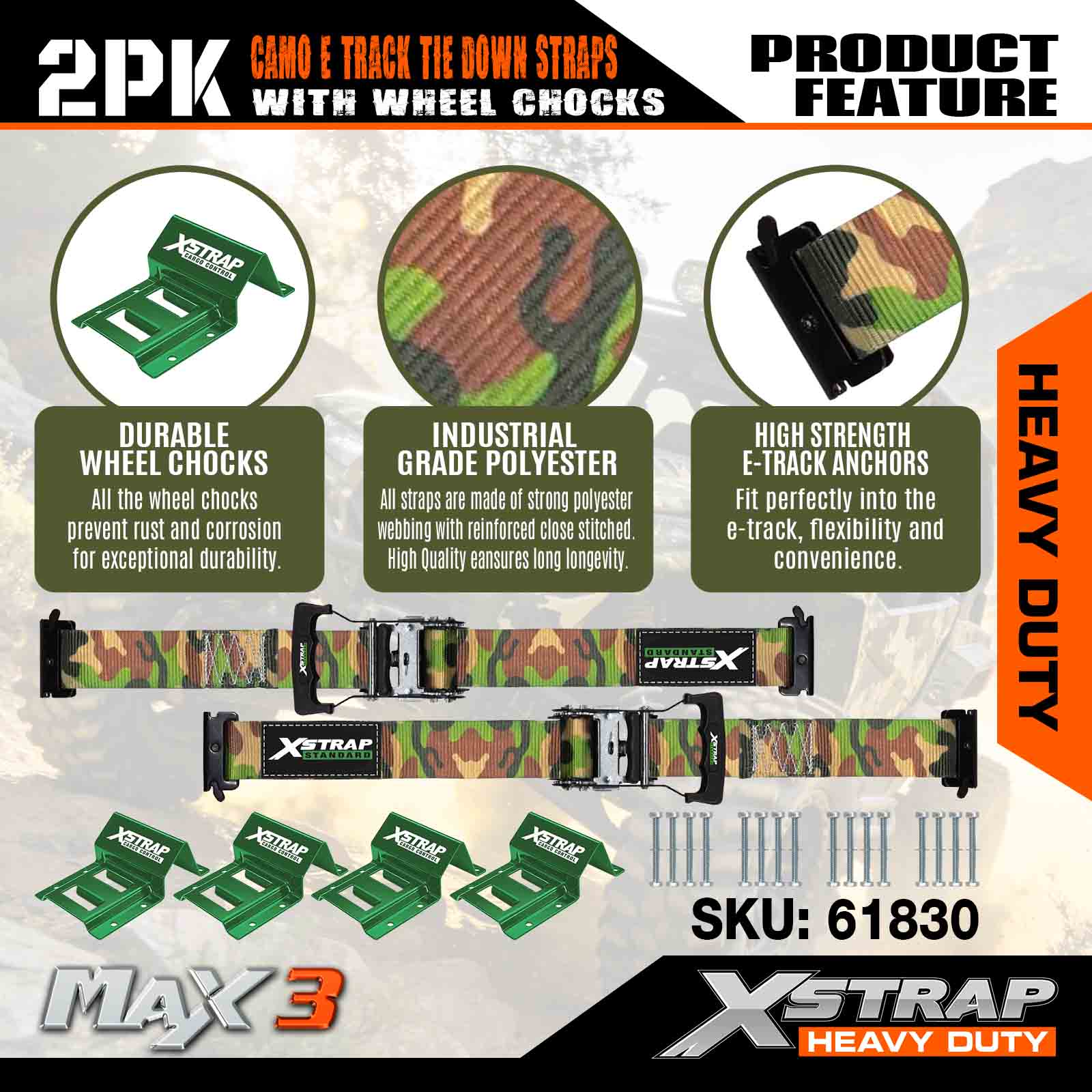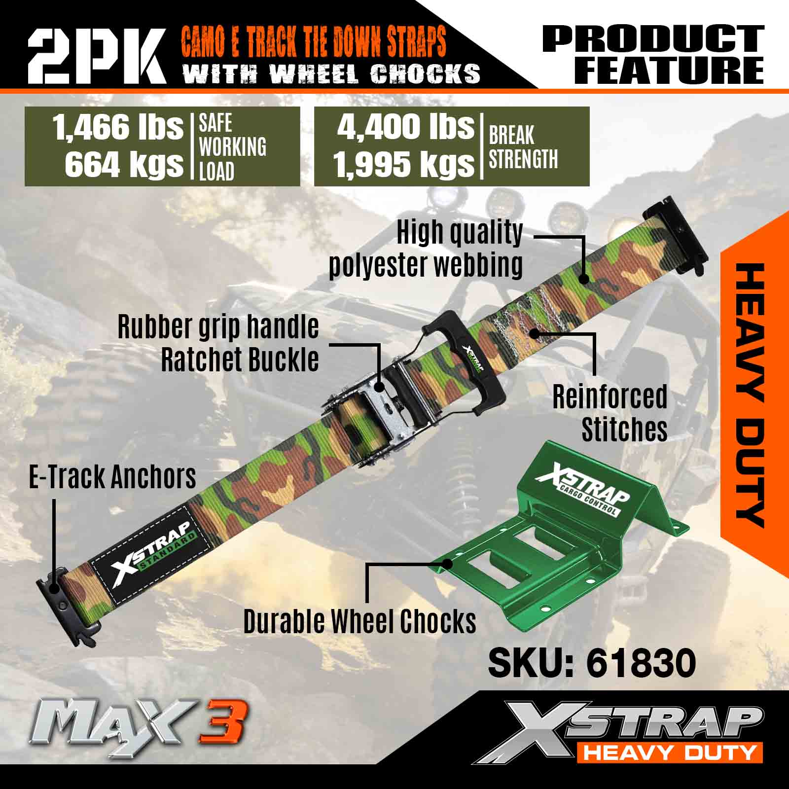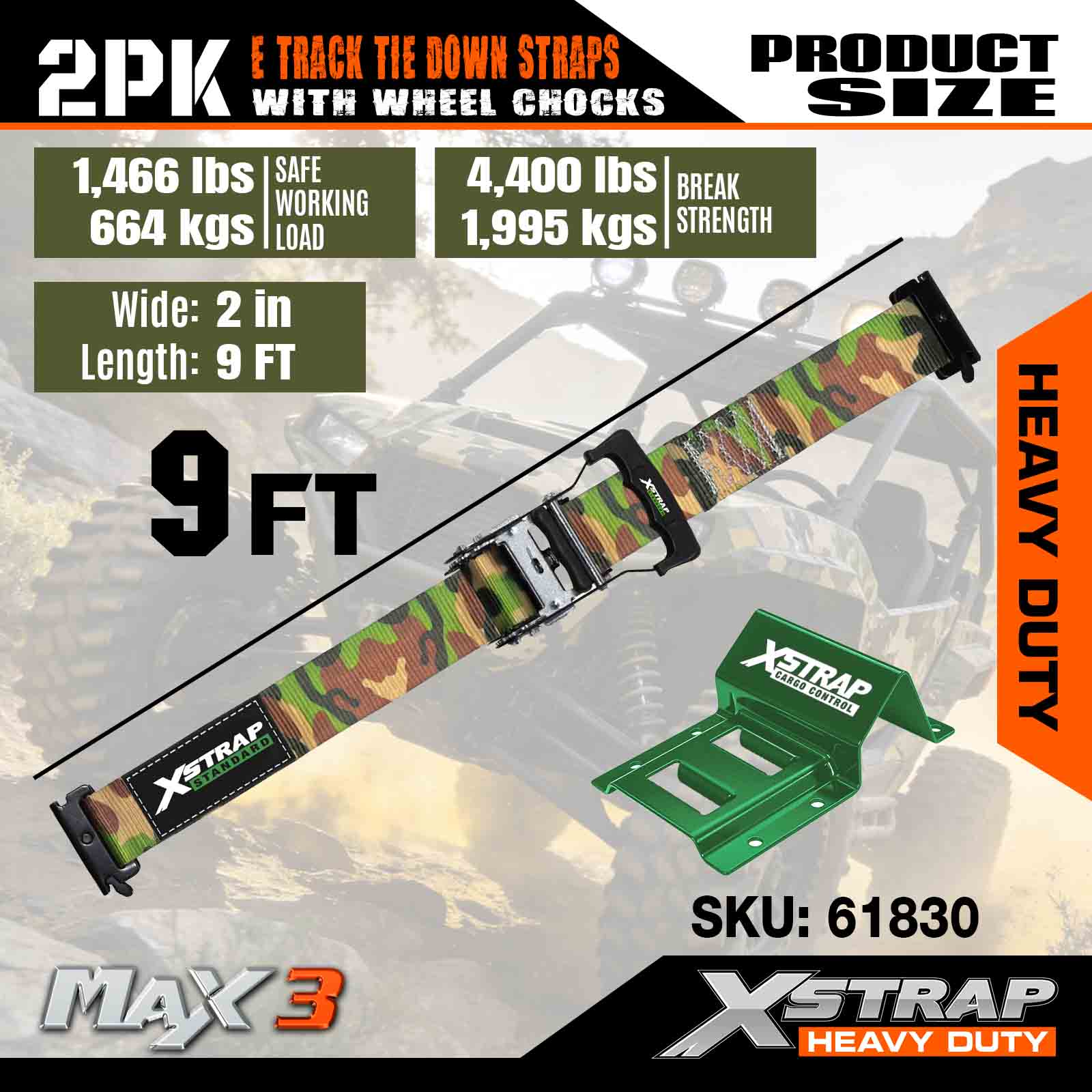 Xstrap kerékékék rögzítő készlet 4400 font törési szilárdság (2) nagy teherbírású pótkocsi abroncs racsnis hevederek (4) kerékékek - E nyomtávrendszer ATV-hez, UTV-hez, négykerekű fűnyíróhoz - CAMO