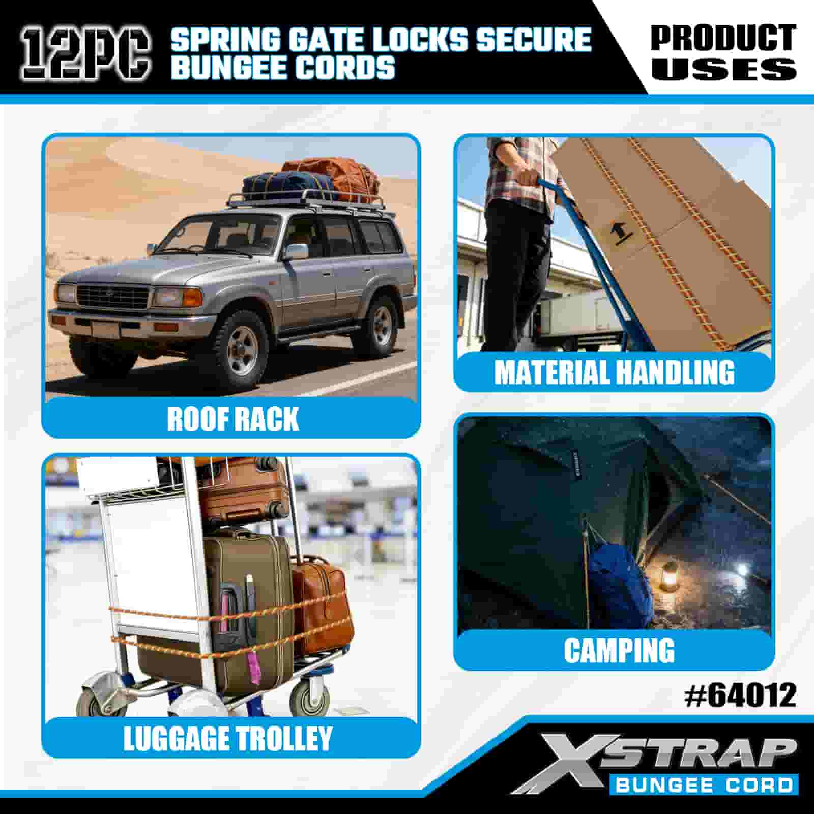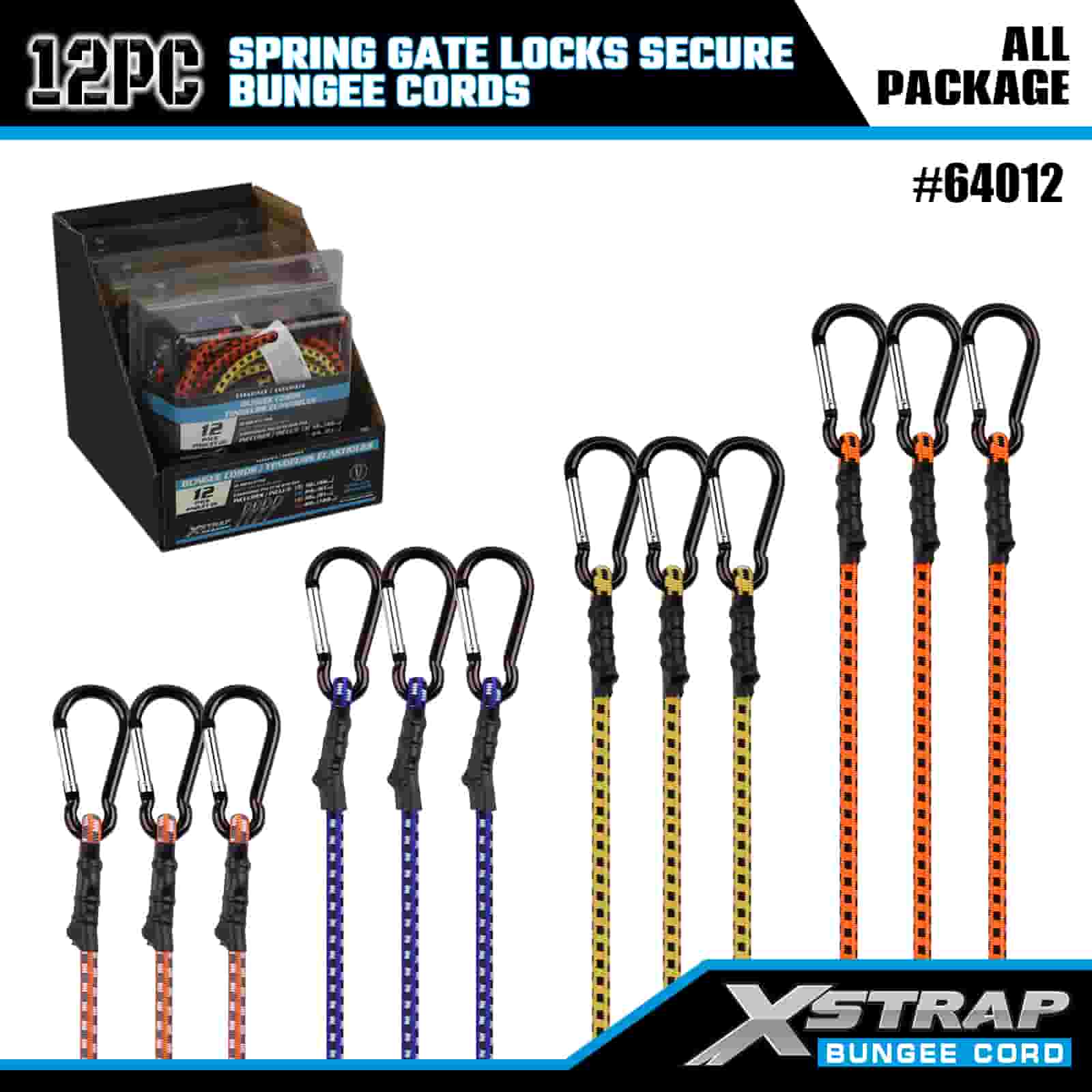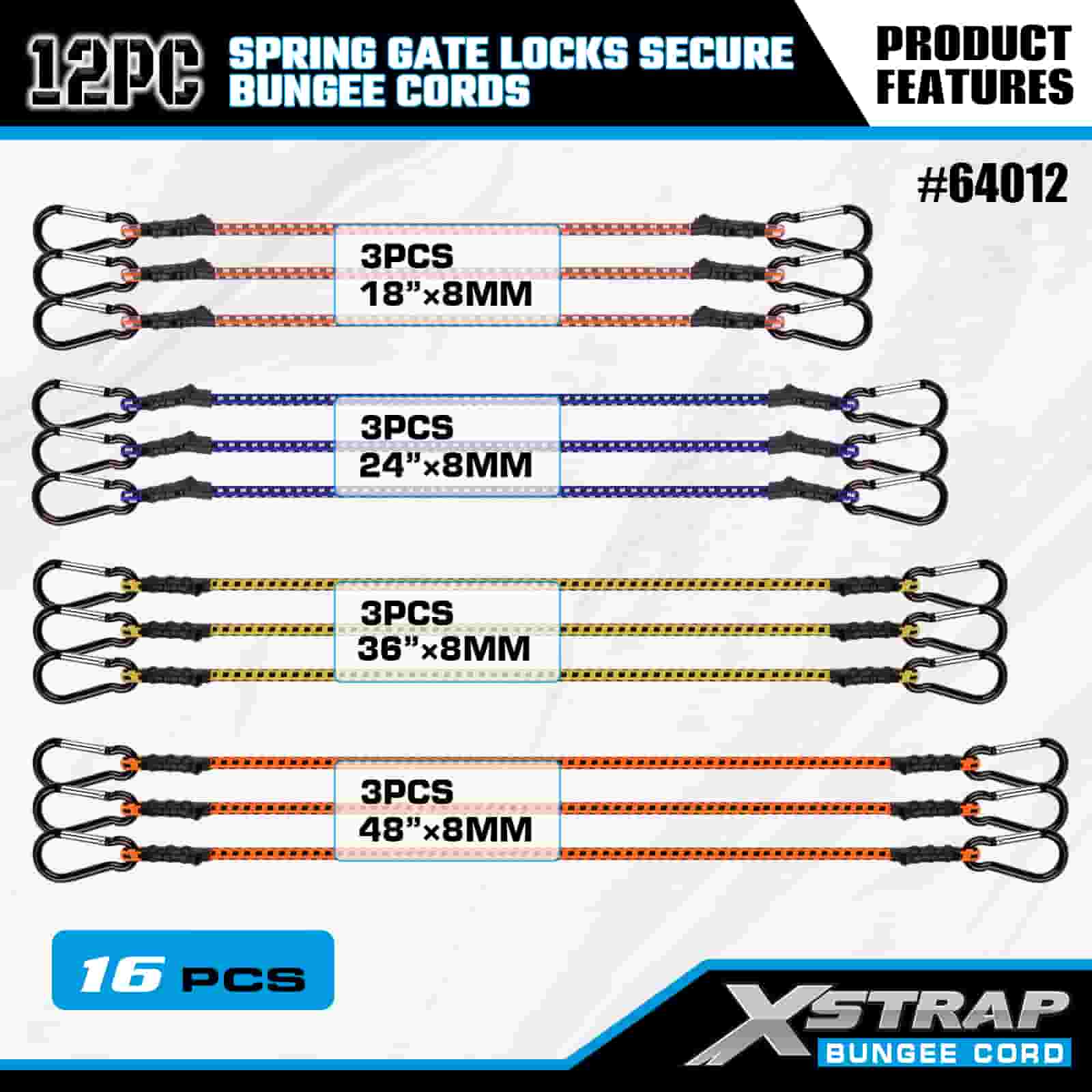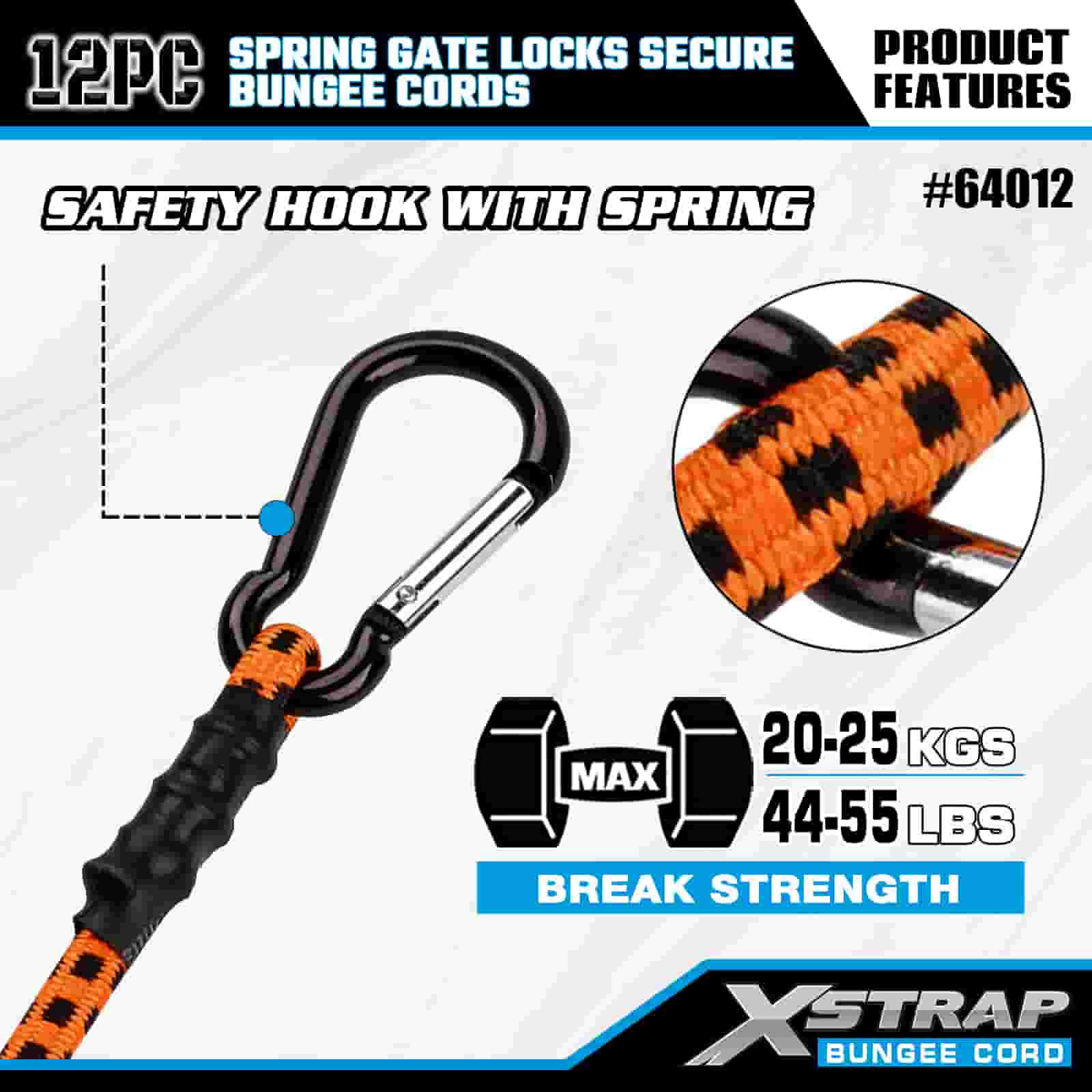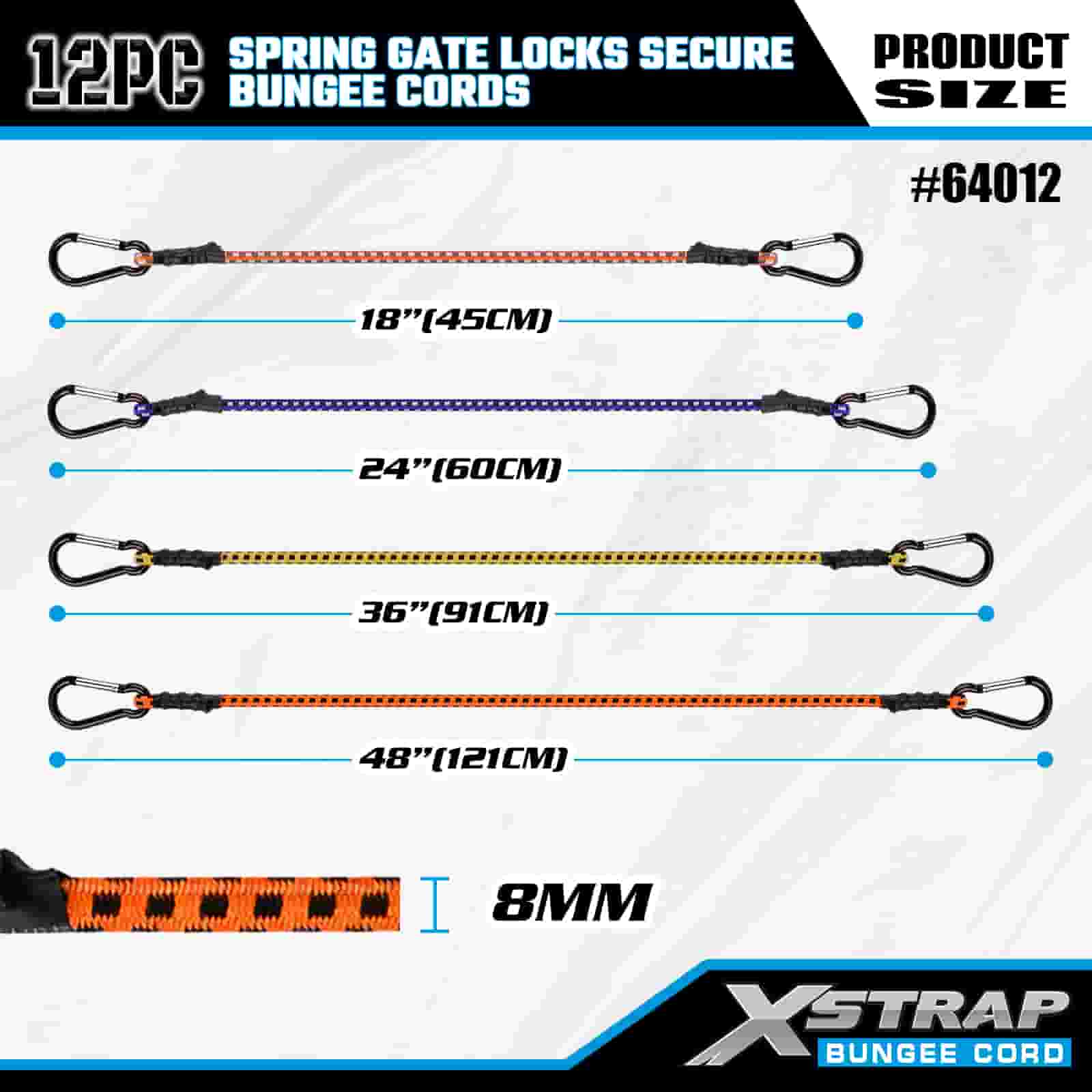 Xstrap 12PK rugós kapuzárak Biztonságos Bungee zsinórok 8 mm x 18”/24” /36”/ 48”, 88-110 font törési szilárdság karabineres kampókkal, rugós kapuzárral.