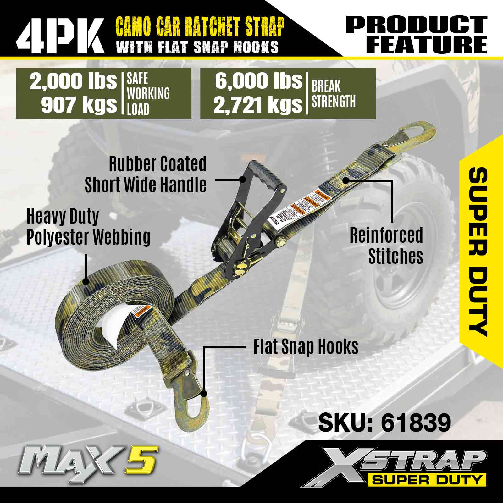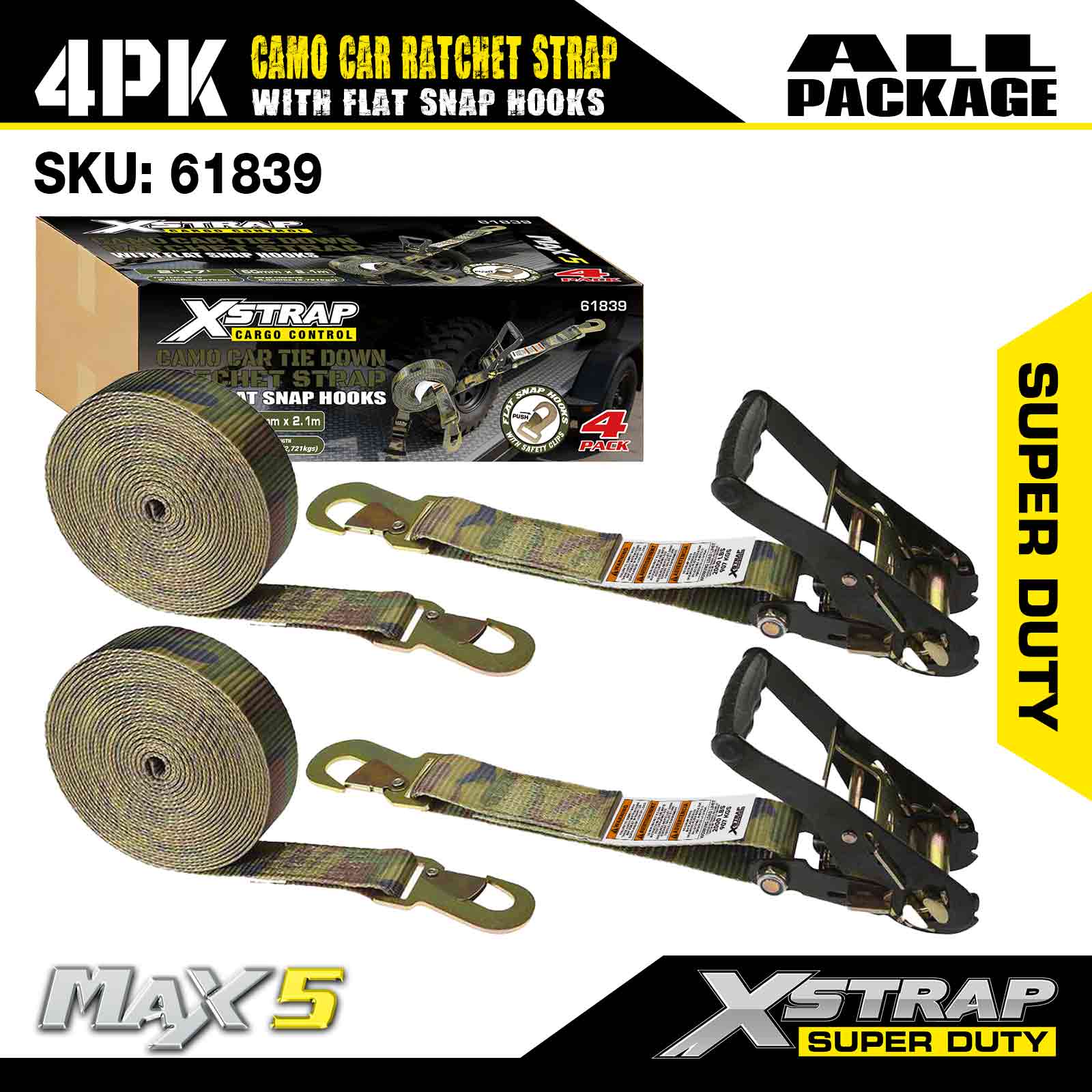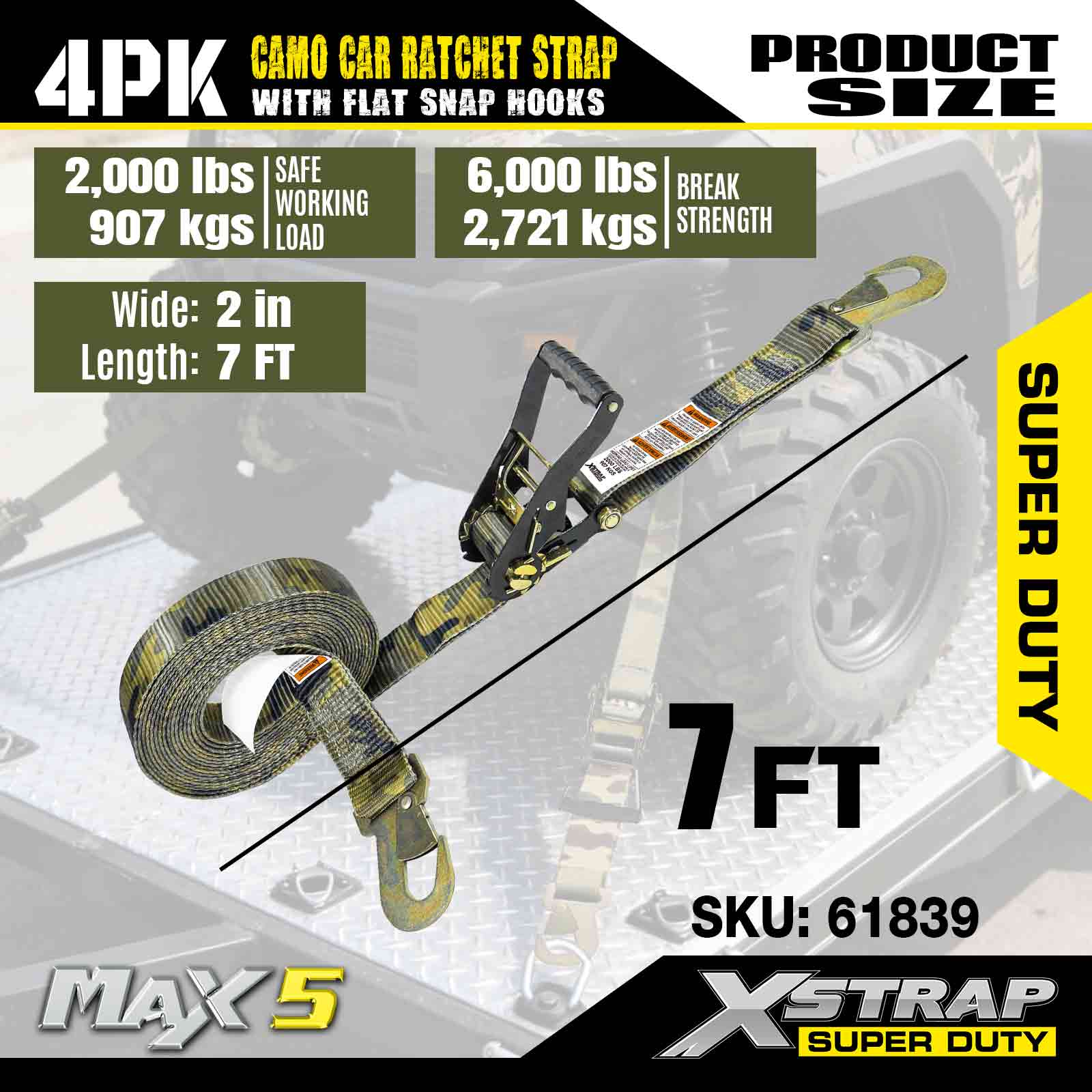 Xstrap Cargo Control automatikus racsnis hevederek lapos bepattintható horgokkal, 2 hüvelyk x 7 láb (4 csomag), 6000 LBS törési szilárdság, sokoldalú racsnis hevederek lapos rögzítő kampókkal, autók, motorkerékpárok és egyéb járművek