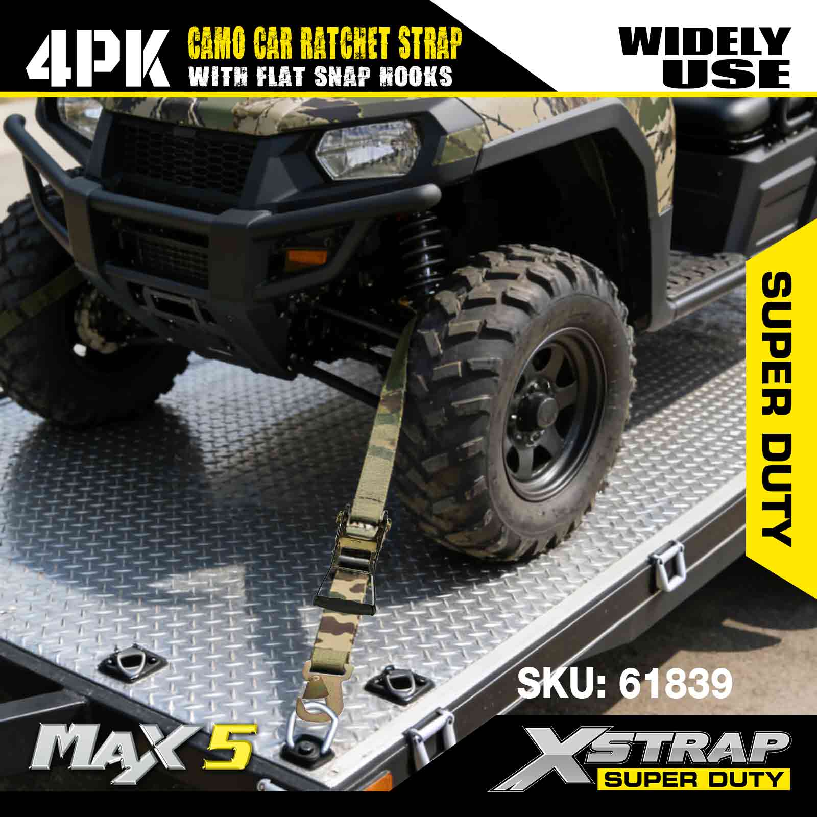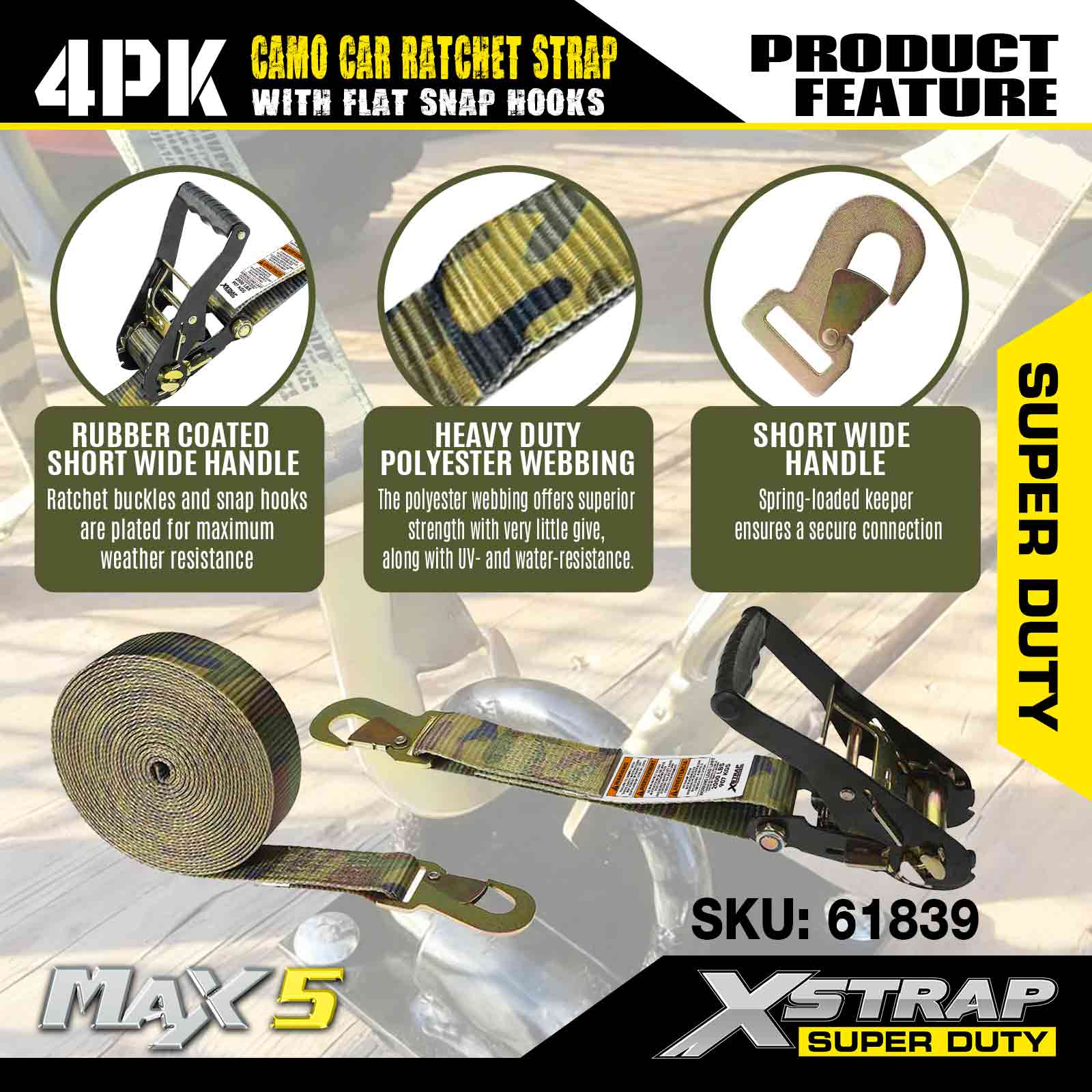 - IDŐJÁRÁS ELLEN BIZTONSÁGOS VÉDELEM - A megkötő heveder időjárásálló poliészterből készült. Ez a szíj biztonságosan használható víz közelében és közvetlen UV-sugárzásnak kitéve. A racsnis heveder hardverei horganyzottak a védelem érdekében.