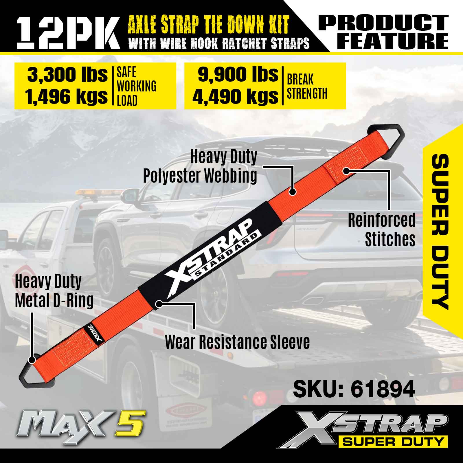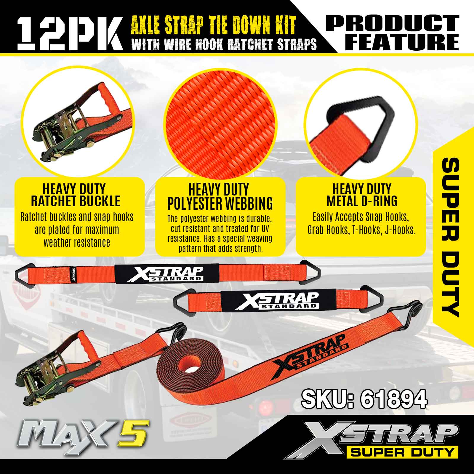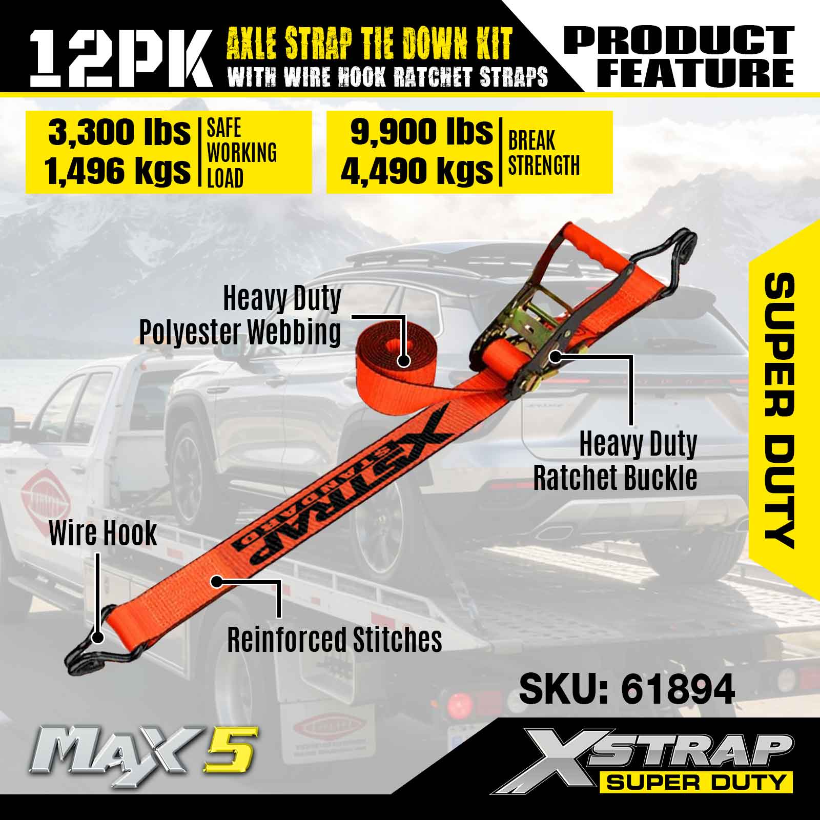 Xstrap 12PK tengelyszíj rögzítő készlet (huzalkampós racsnis hevederekkel) – Super Duty. Biztonságos üzemi terhelése 3300 LBS (1496 kg), szakítószilárdsága pedig 9900 LBS (4490 kg).