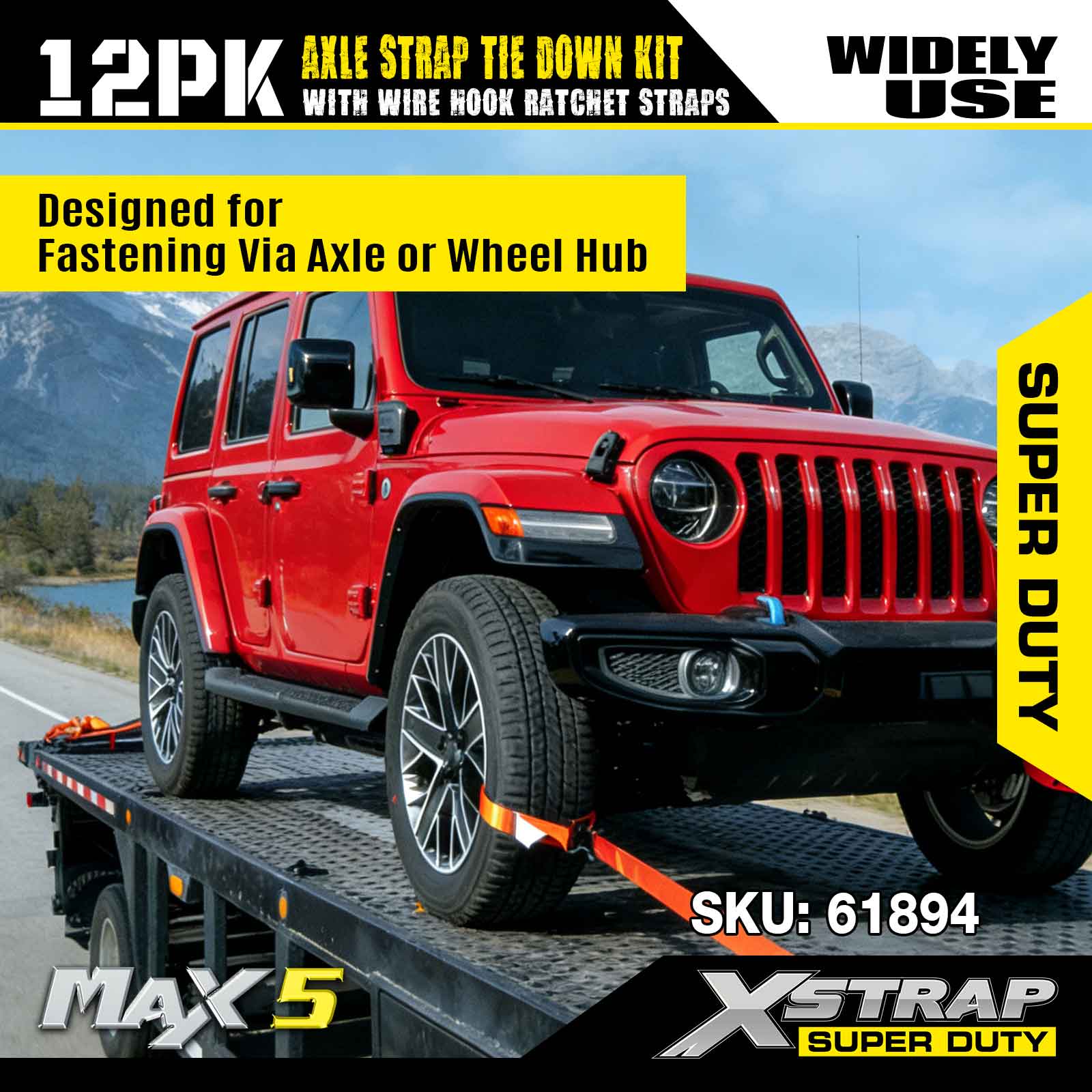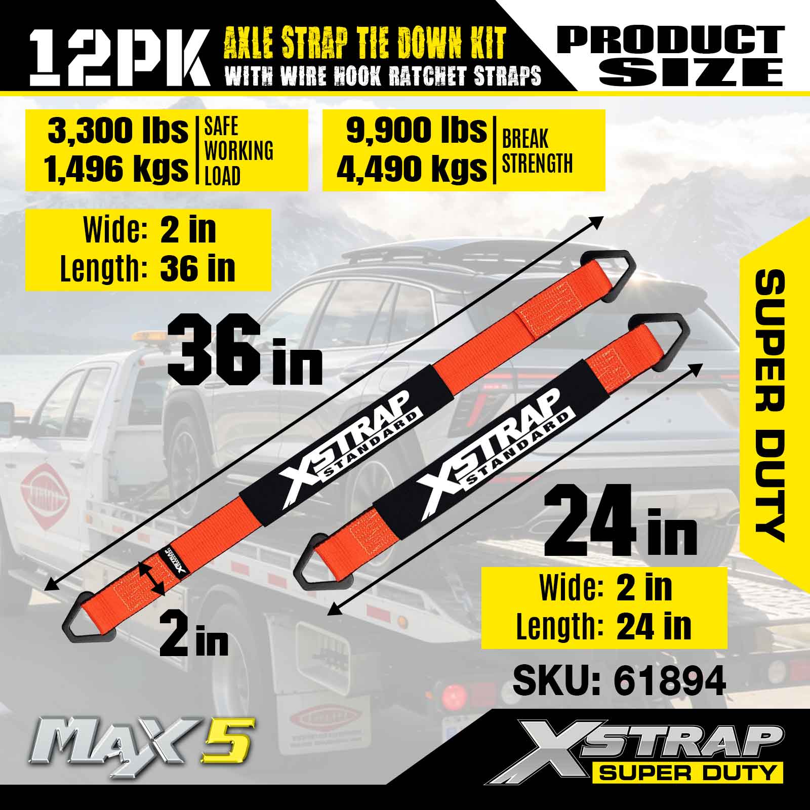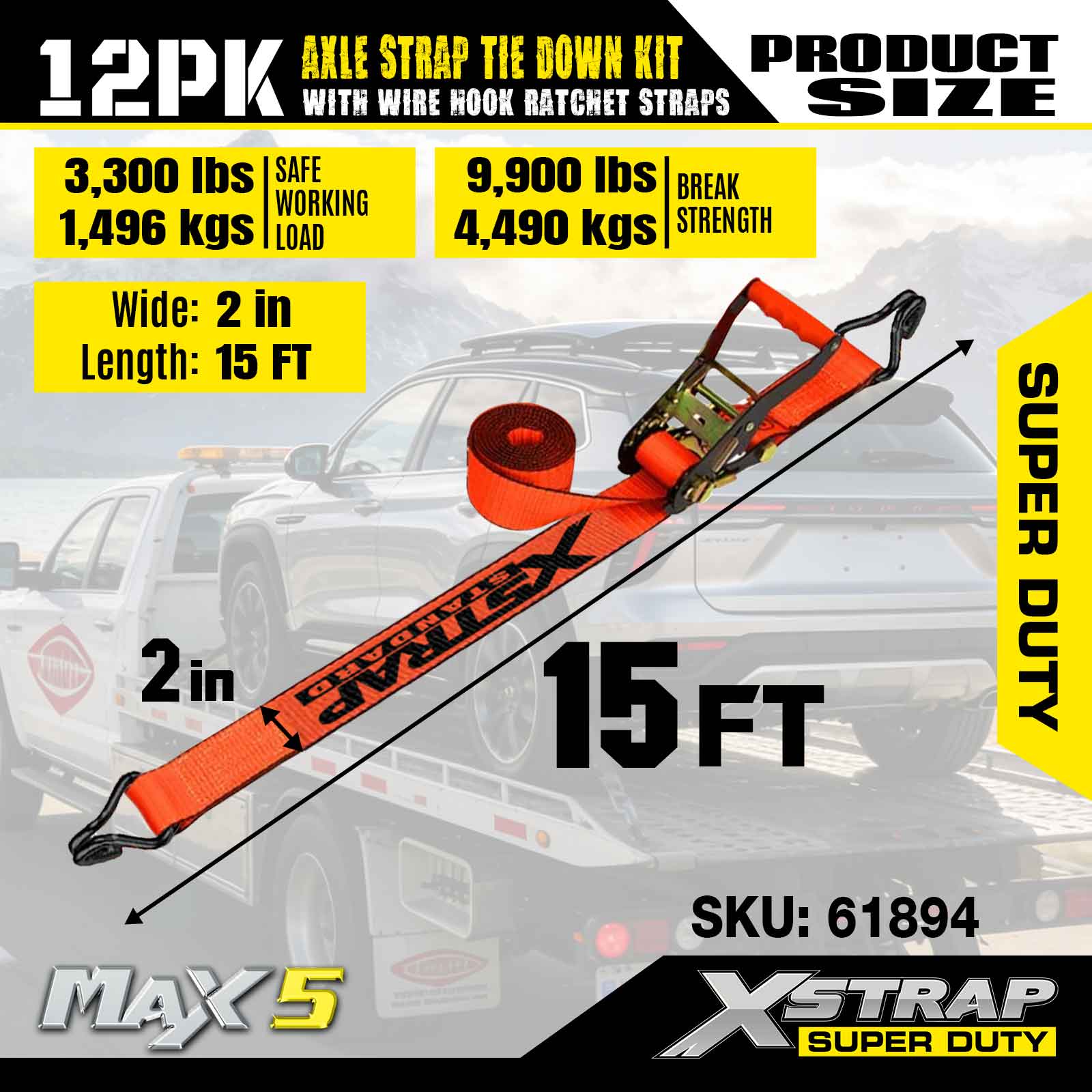 Xstrap 12PK tengelyszíj rögzítő készlet (huzalkampós racsnis hevederekkel) – Super Duty. Biztonságos üzemi terhelése 3300 LBS (1496 kg), szakítószilárdsága pedig 9900 LBS (4490 kg).