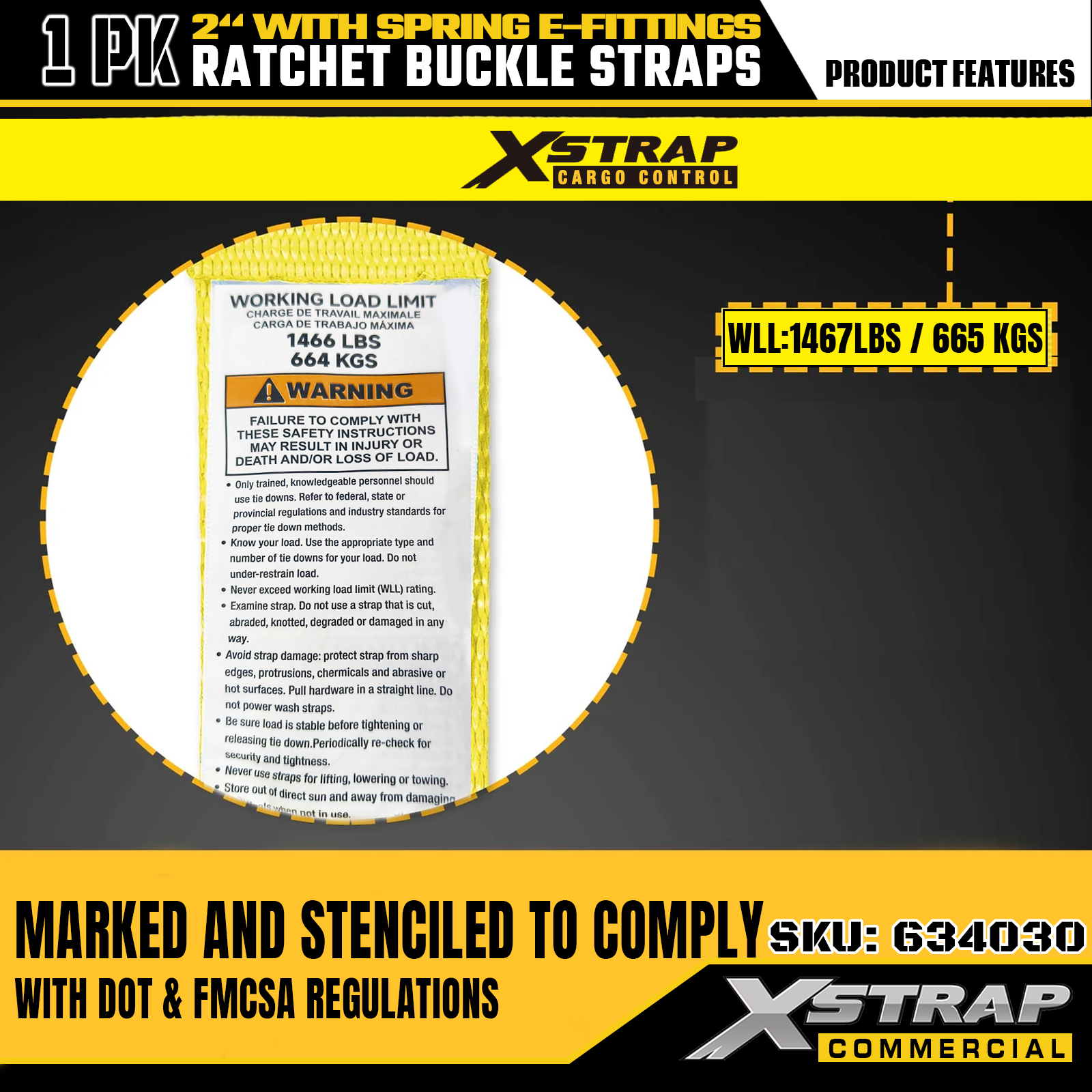 - Egyértelmű biztonsági jelölések: Minden heveder egyértelműen fel van tüntetve a biztonságos munkaterhelés (SWL) 1467 lbs és a maximális szakítószilárdság 4401 lbs, ami alapvető biztonsági információkat nyújt a megfelelő és biztonságos használat biztosításához a rakomány ellenőrzése, mozgatása és szállítása során.