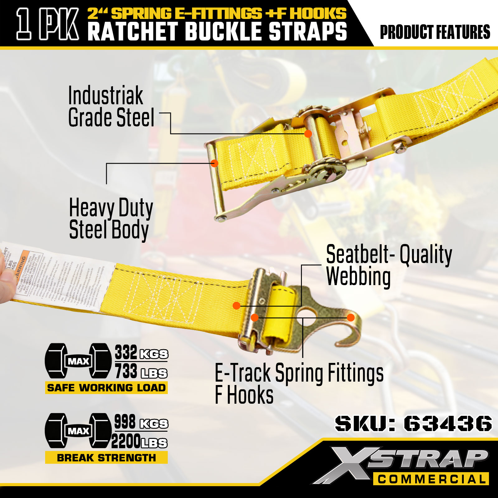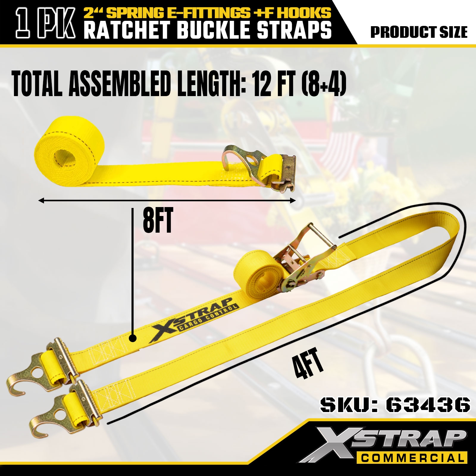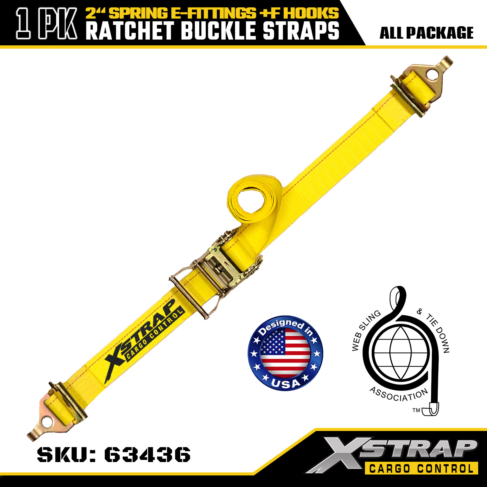 Xstrap 1-csomagos megköthető racsnis hevederek, 2" x 12" nagy teherbírású rakományrögzítő rugós E-szerelvényekkel és F kampókkal (sárga), 733 lbs kapacitás pótkocsikhoz, teherautókhoz, furgonokhoz és motorkerékpárok rögzítéséhez