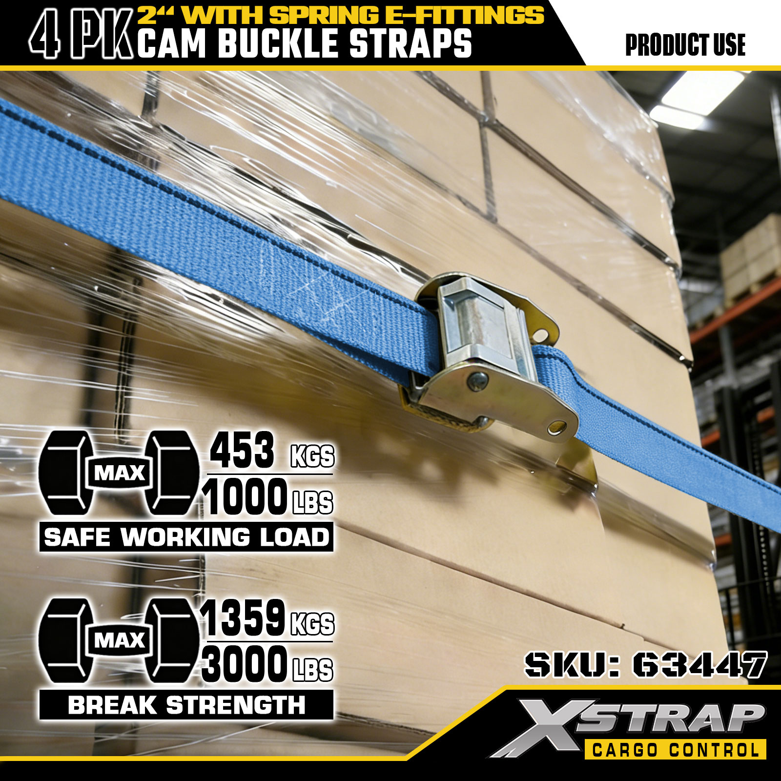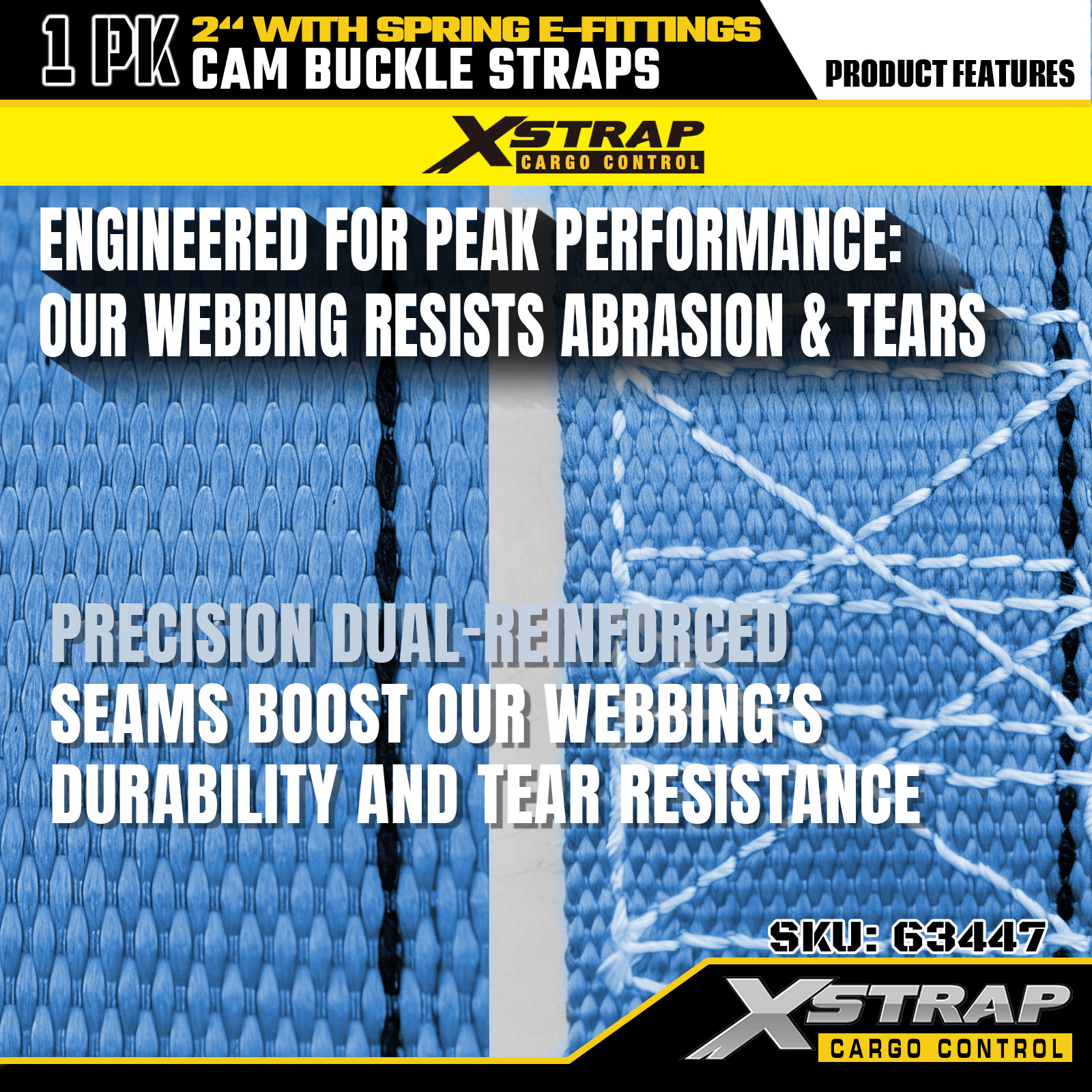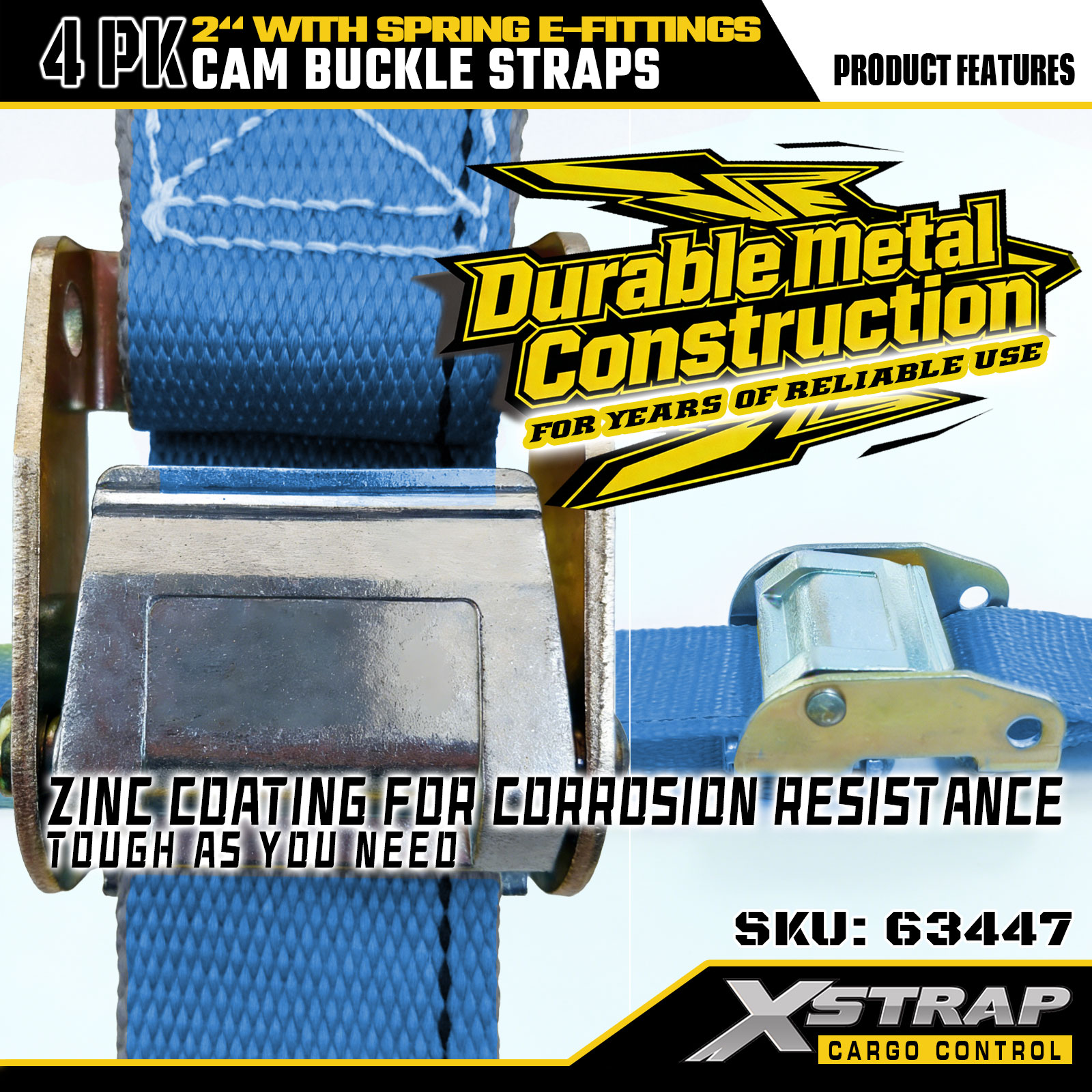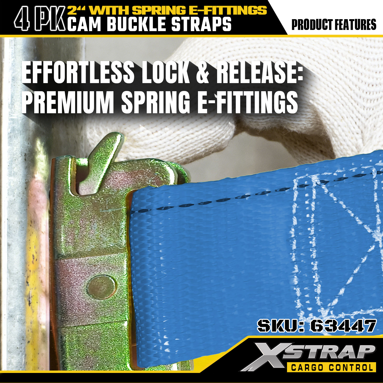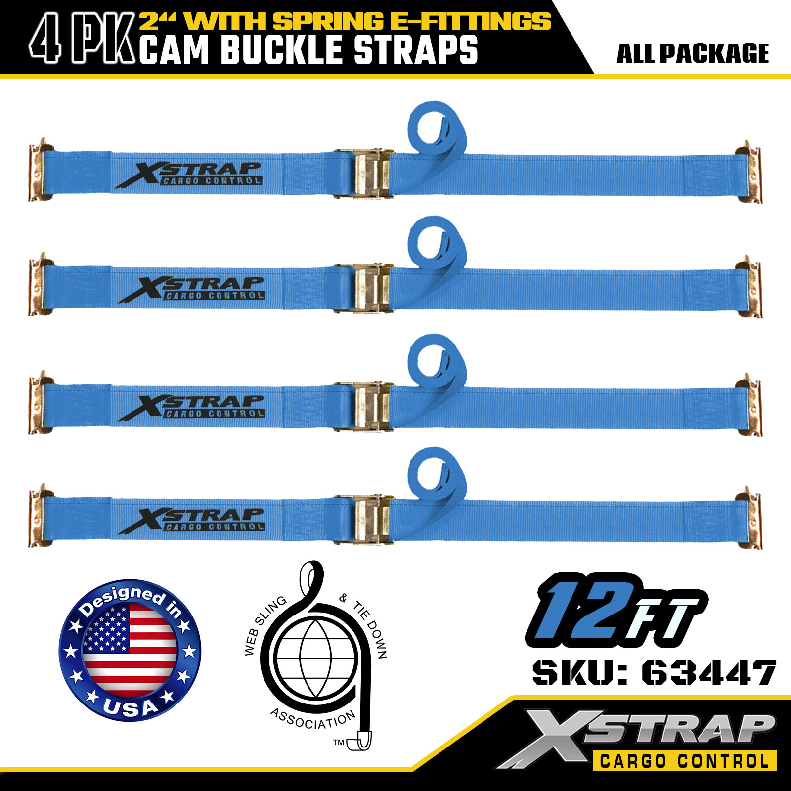 Xstrap 63447 4 csomag 2" x 12" kék racsnis hevederek rugós E-szerelvényekkel és F horgokkal, 733 lbs SWL és 332 lbs törésszilárdság a rakomány ellenőrzéséhez, mozgatásához és szállításához