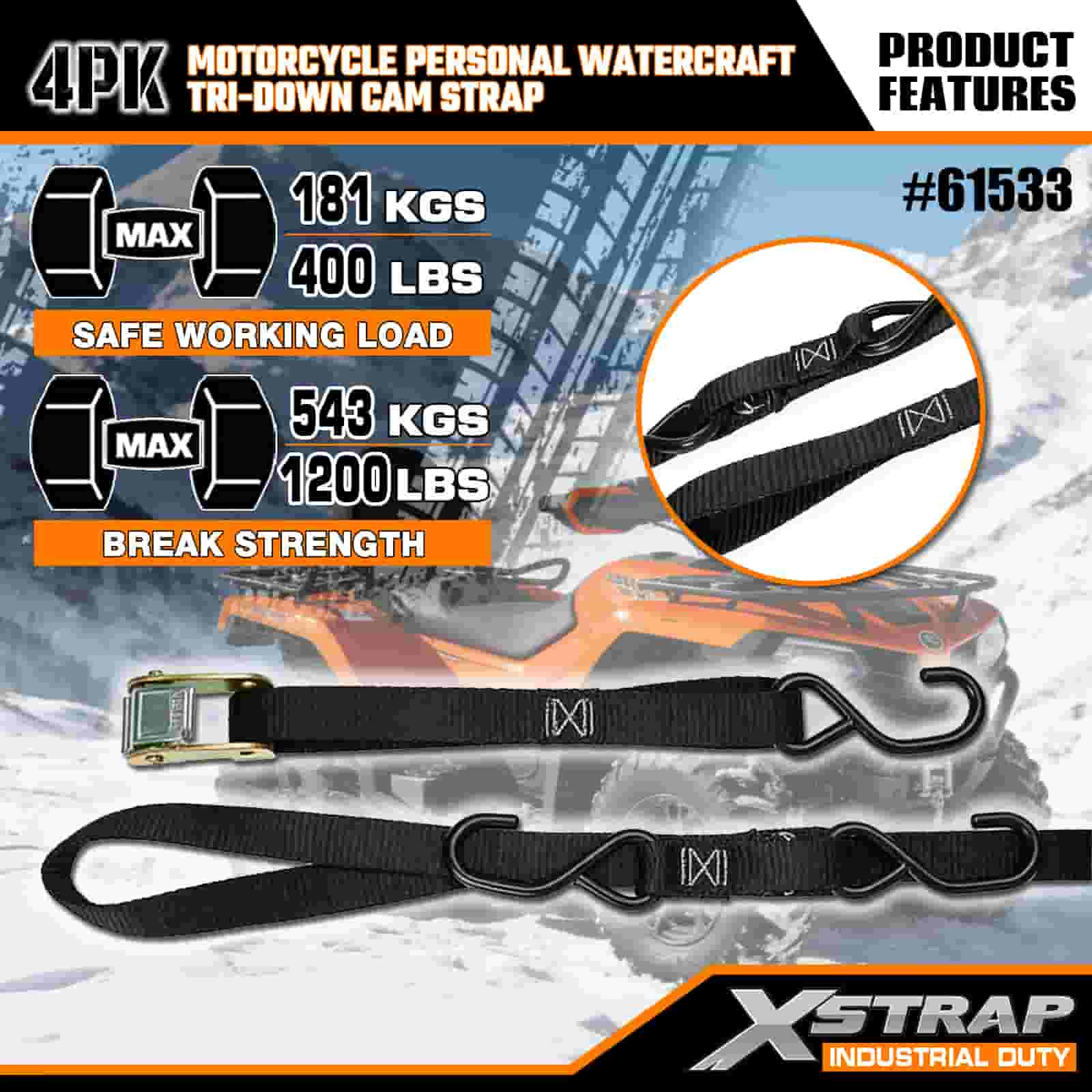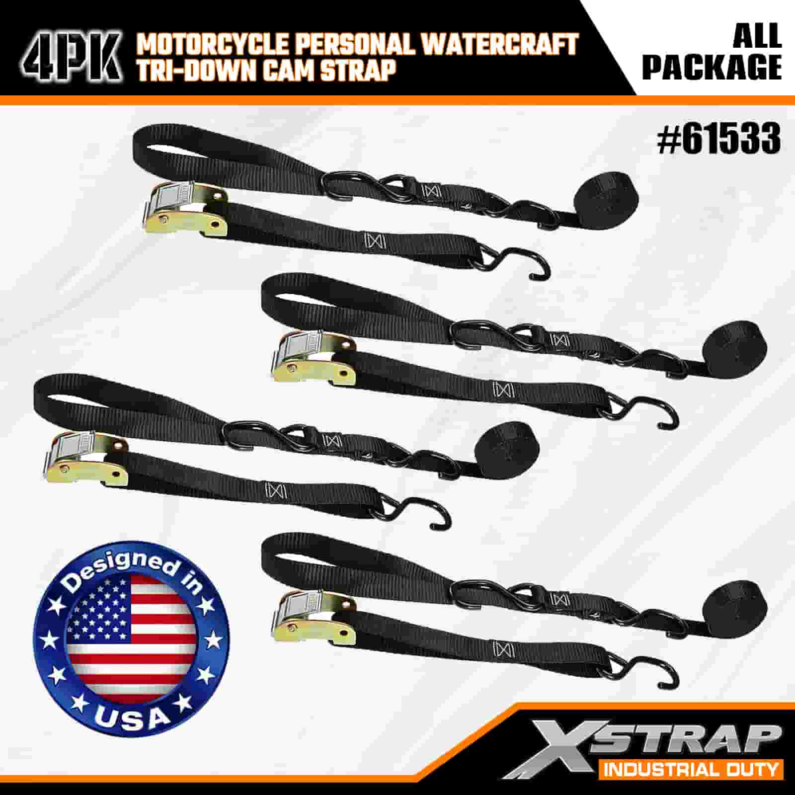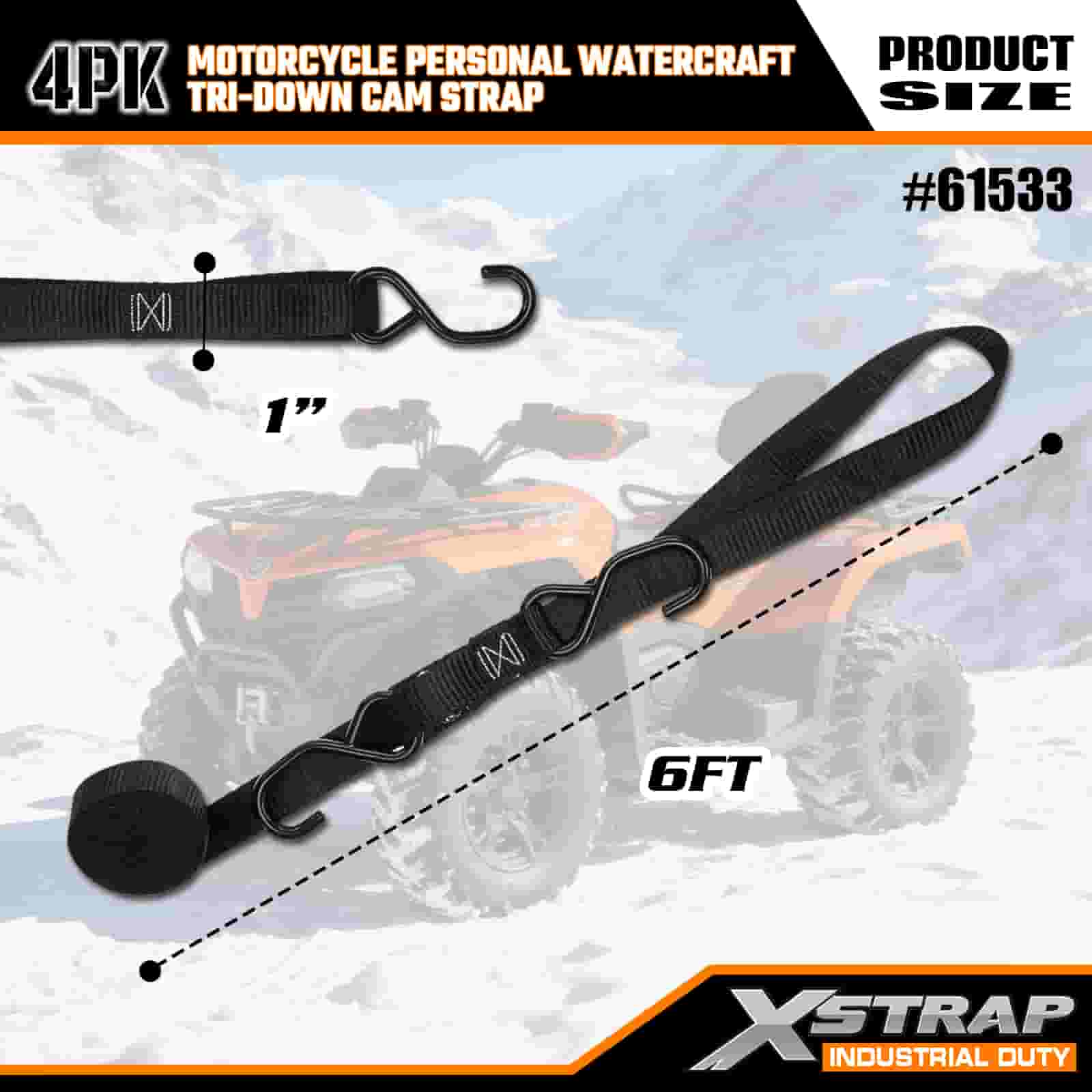 Xstrap 4PK Motorkerékpár személyi vízijármű háromszögű bütykös pánt, 1" x 6" poliészter megkötő heveder, kihúzható racsnis csatszíj, 400 font teherbírású rakományrögzítő rögzítő hevederek S horgokkal a komoly szakemberek számára a rakomány utánfutó rögzítéséhez, síkágyas utánfutó, kis méretű autós sícsónak.