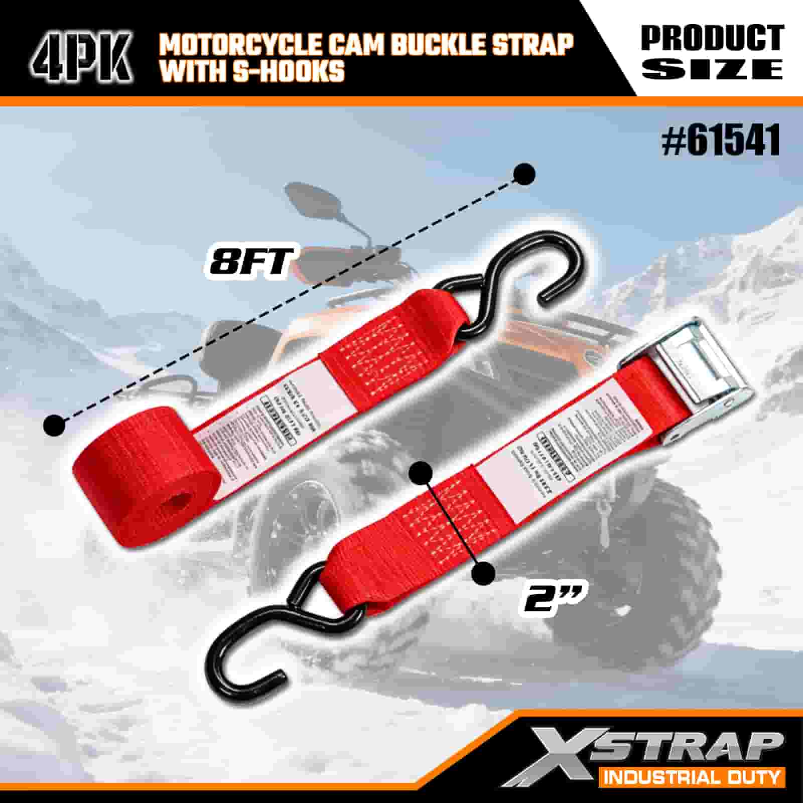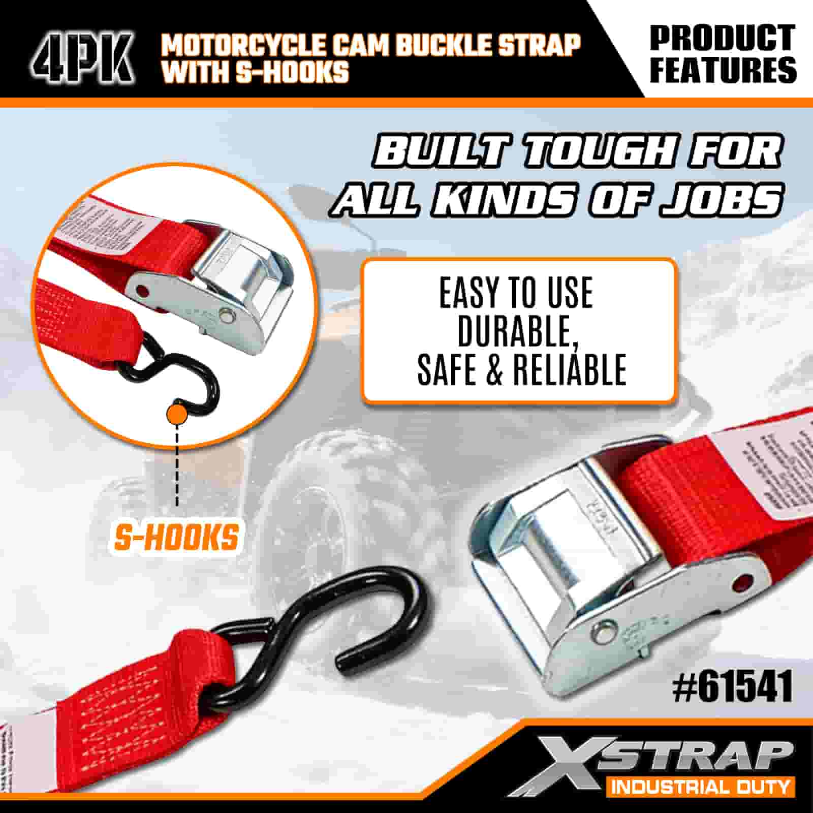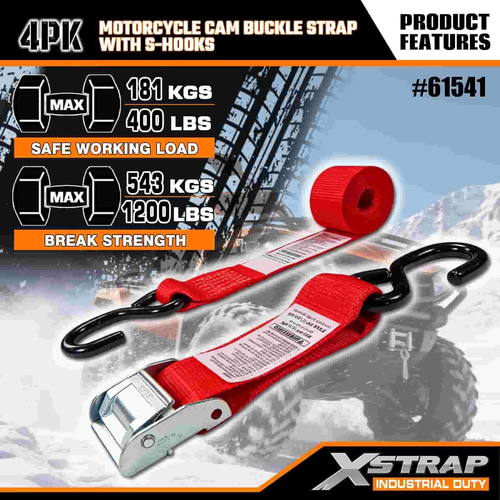 Xstrap 4PK motorkerékpár bütykös csatszíja S kampóval, 2” x 8”-es poliészter rögzítőszíj, húzható racsnis csatszíj, 400 font teherbírású rakományrögzítő rögzítő hevederek S-horoggal a komoly szakemberek számára a rakomány utánfutó rögzítéséhez, síkágyas utánfutó, kiskocsi, síboat.