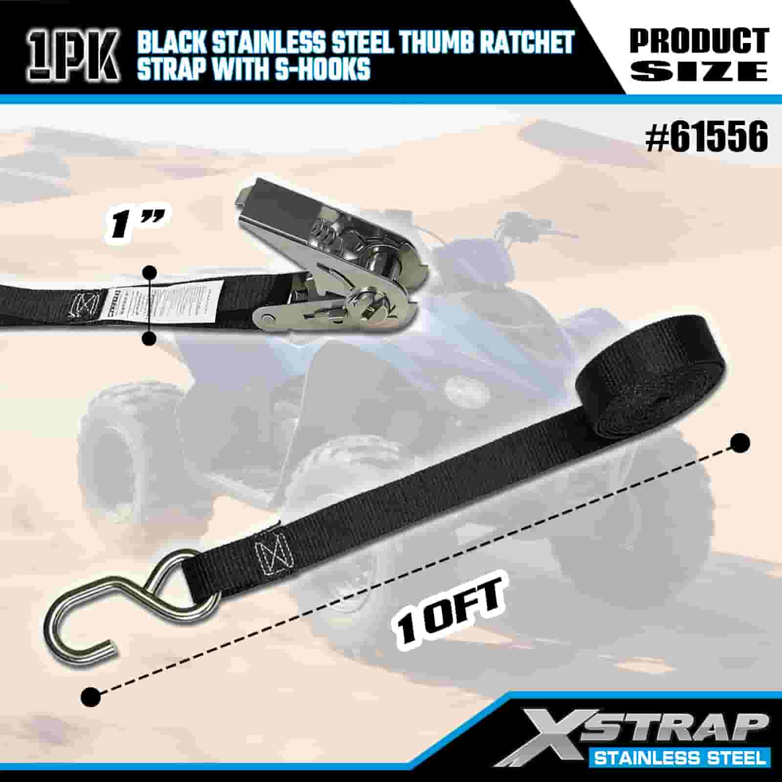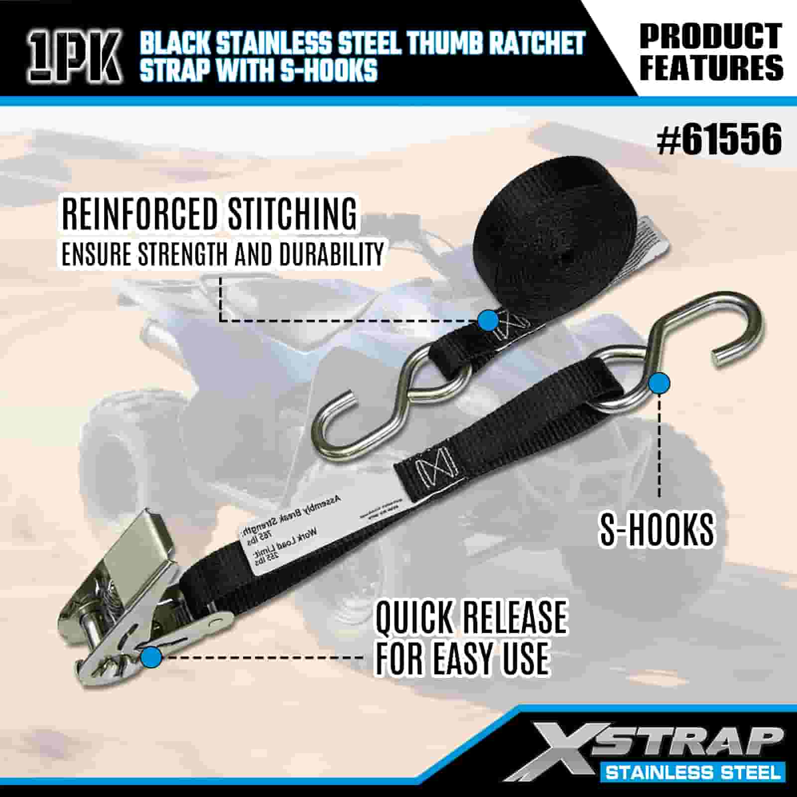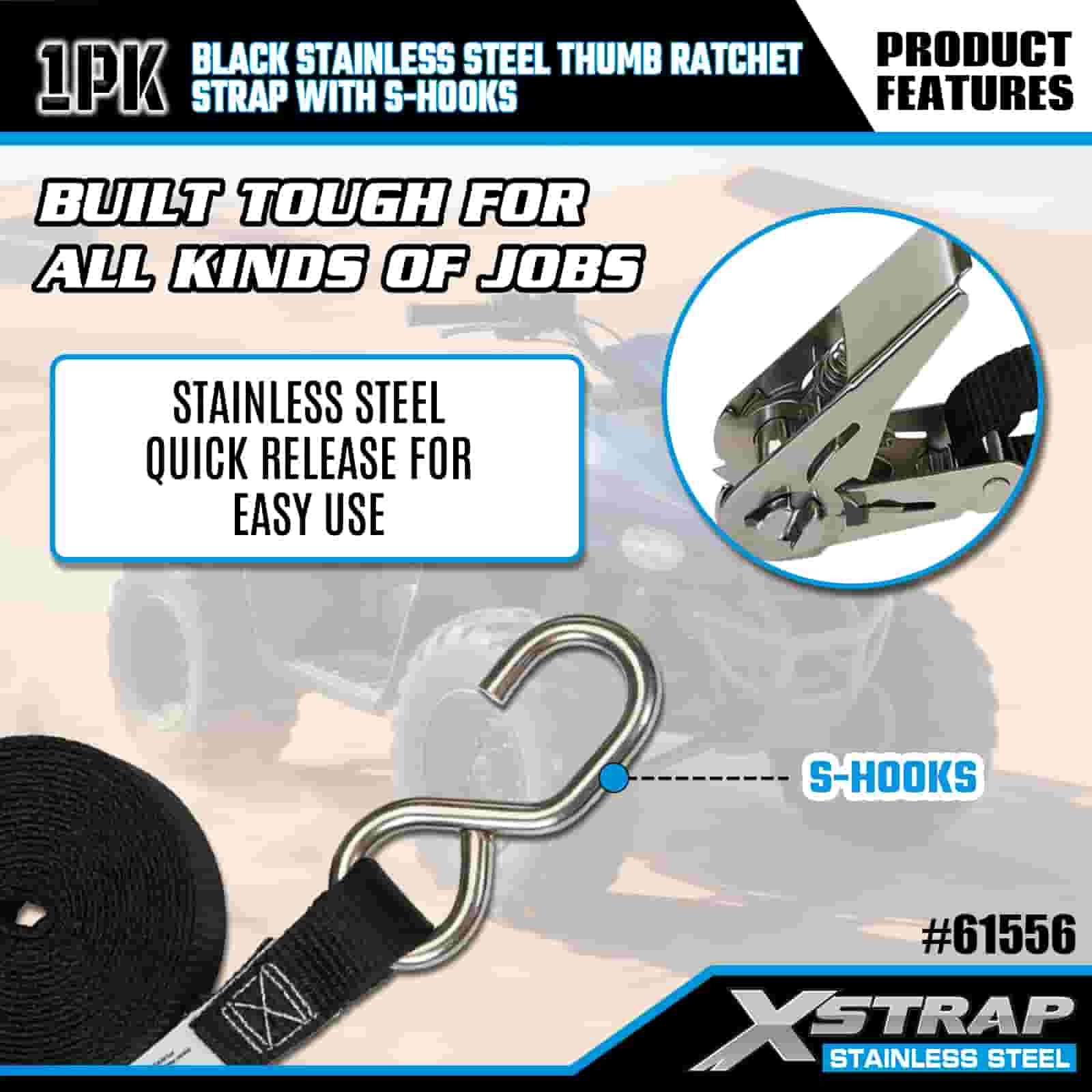 Xstrap fekete, rozsdamentes acél hüvelykujjas kilincs S horgokkal, 1” x 10” poliészter rögzítőszíj racsnis heveder, 255 font teherbírású rakományrögzítő rögzítő hevederek S horgokkal utánfutóhoz, síkágyas utánfutó sícsónakhoz, kisautóhoz, nehéz felszereléshez.