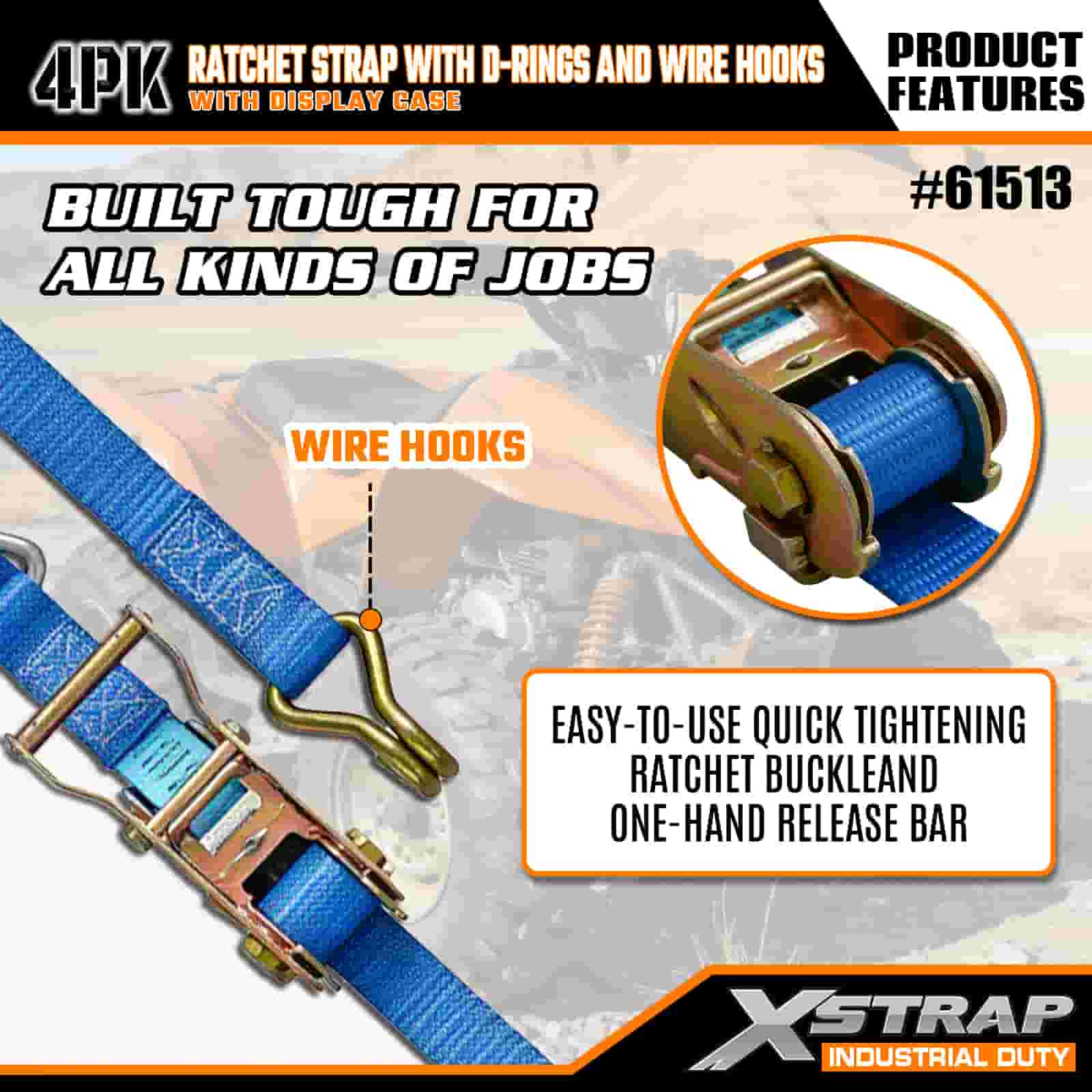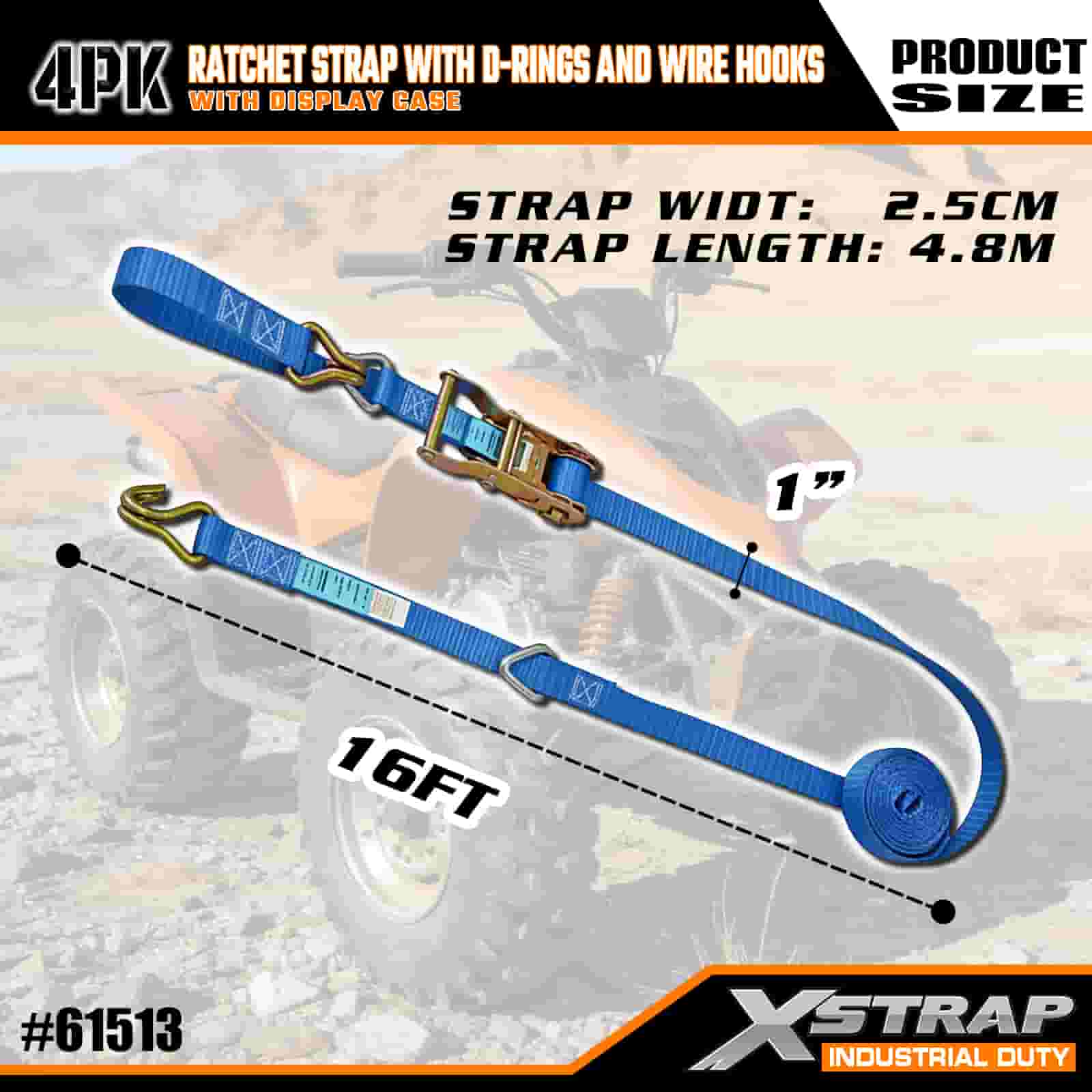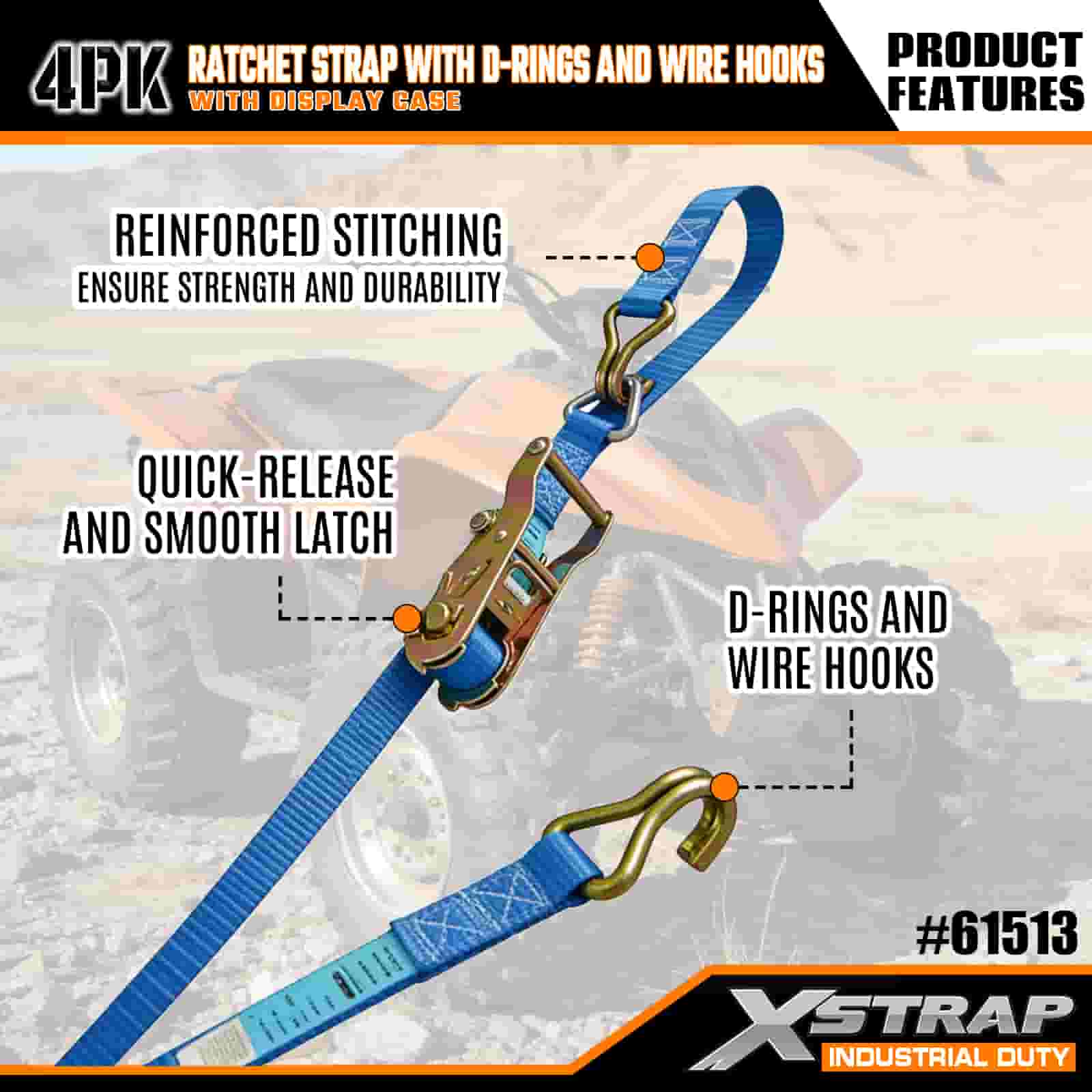 Xstrap 4 csomagos racsnis heveder D gyűrűkkel és drótkampókkal, 1” x 16” poliészter rögzítőszíj húzó racsnis heveder, 1000 font teherbírású rakományrögzítő rögzítő hevederek dróthorgokkal a komoly szakemberek számára a rakomány utánfutó rögzítéséhez, lapos ágyas utánfutó, kis autós Ski utánfutó.