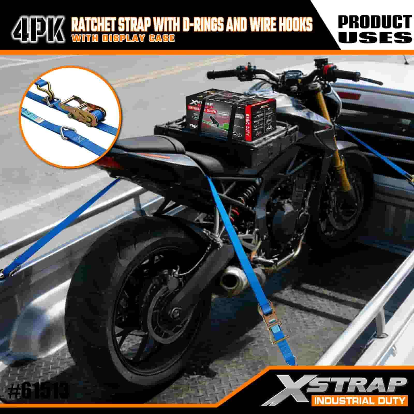 - 16 ft hosszúság rendezett csomagolással: 4 hevederes készletben (kijelzős csomagolásban) eladó, beépített tárolótekercsekkel; minden heveder 1 hüvelyk széles × 16 láb hosszú, ideális motorkerékpárok, nehéz rakományok és ipari berendezések rögzítésére.