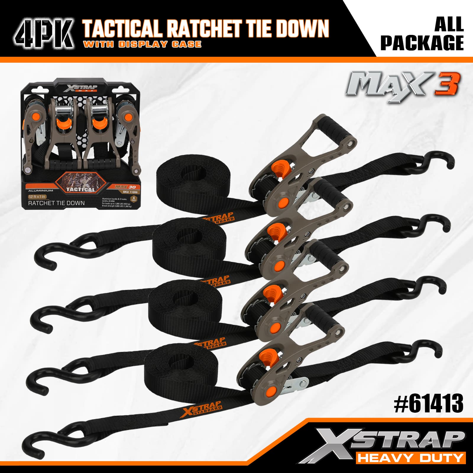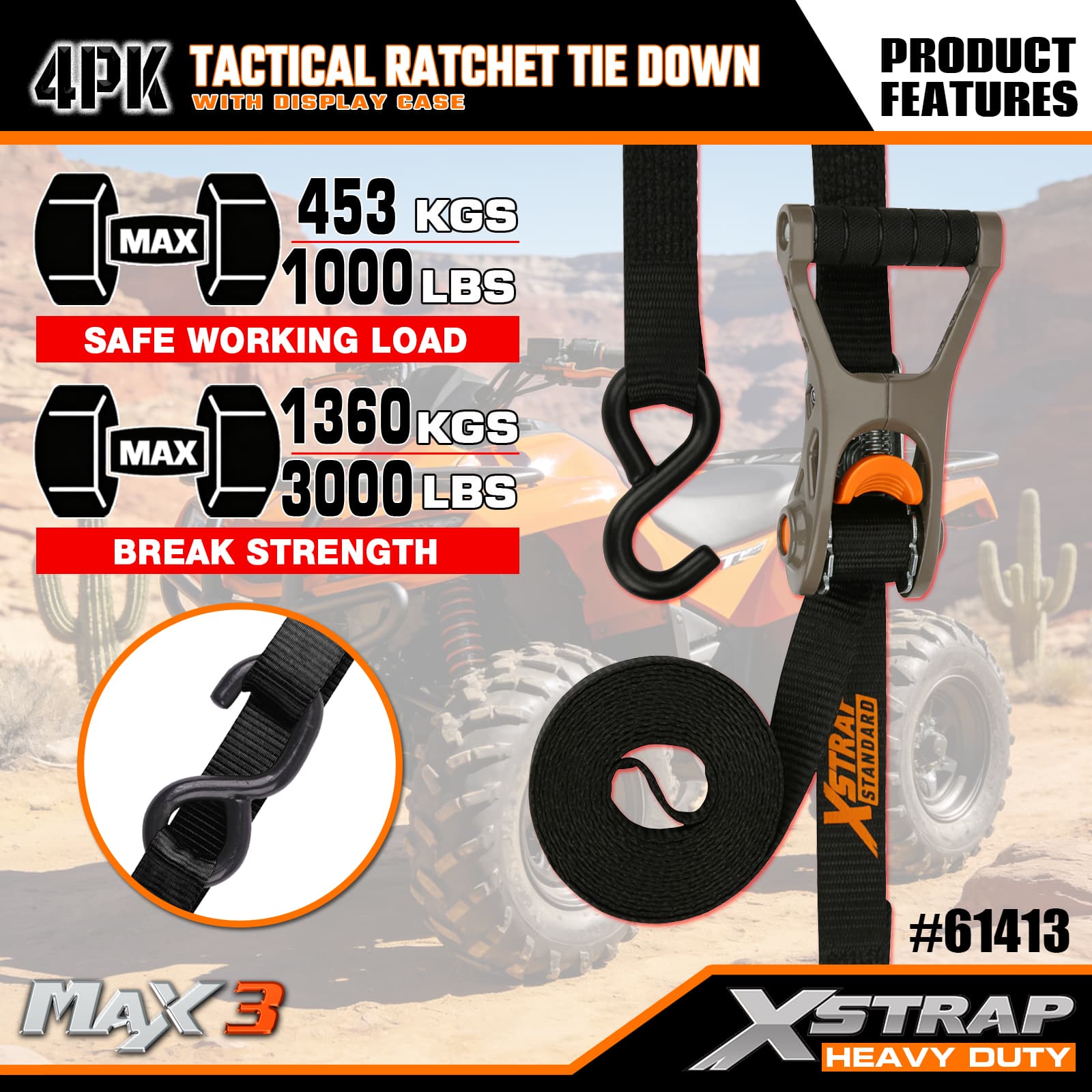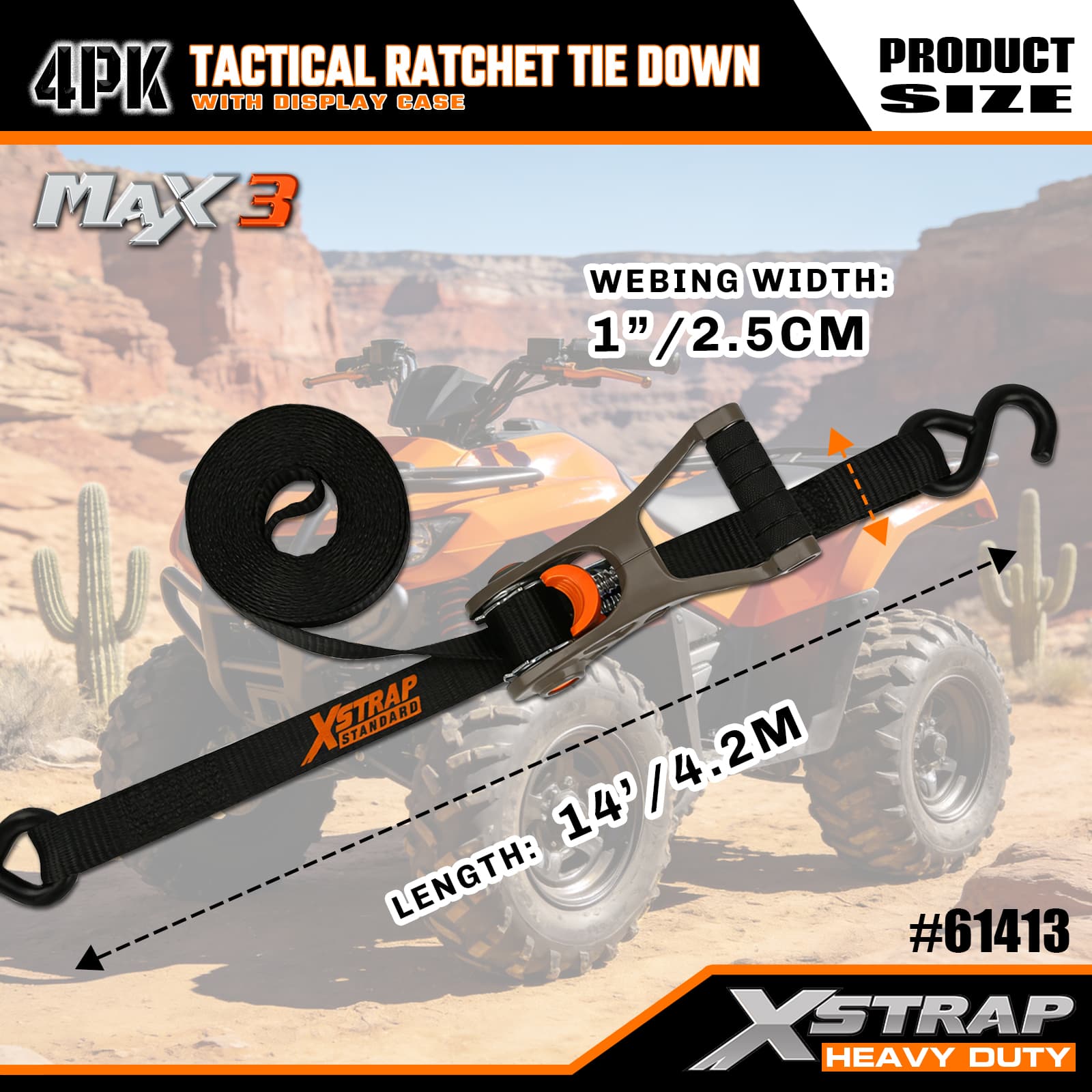 Xstrap 4 csomag taktikai racsnis megkötöző puha hurokkal, 1” x 14 hüvelykes poliészter megkötőszíj, húzható racsnis pánt, 1000 font teherbírású rakományrögzítő rögzítő hevederek S kampókkal teherautókhoz, terepjárókhoz, autós motorkerékpárokhoz.