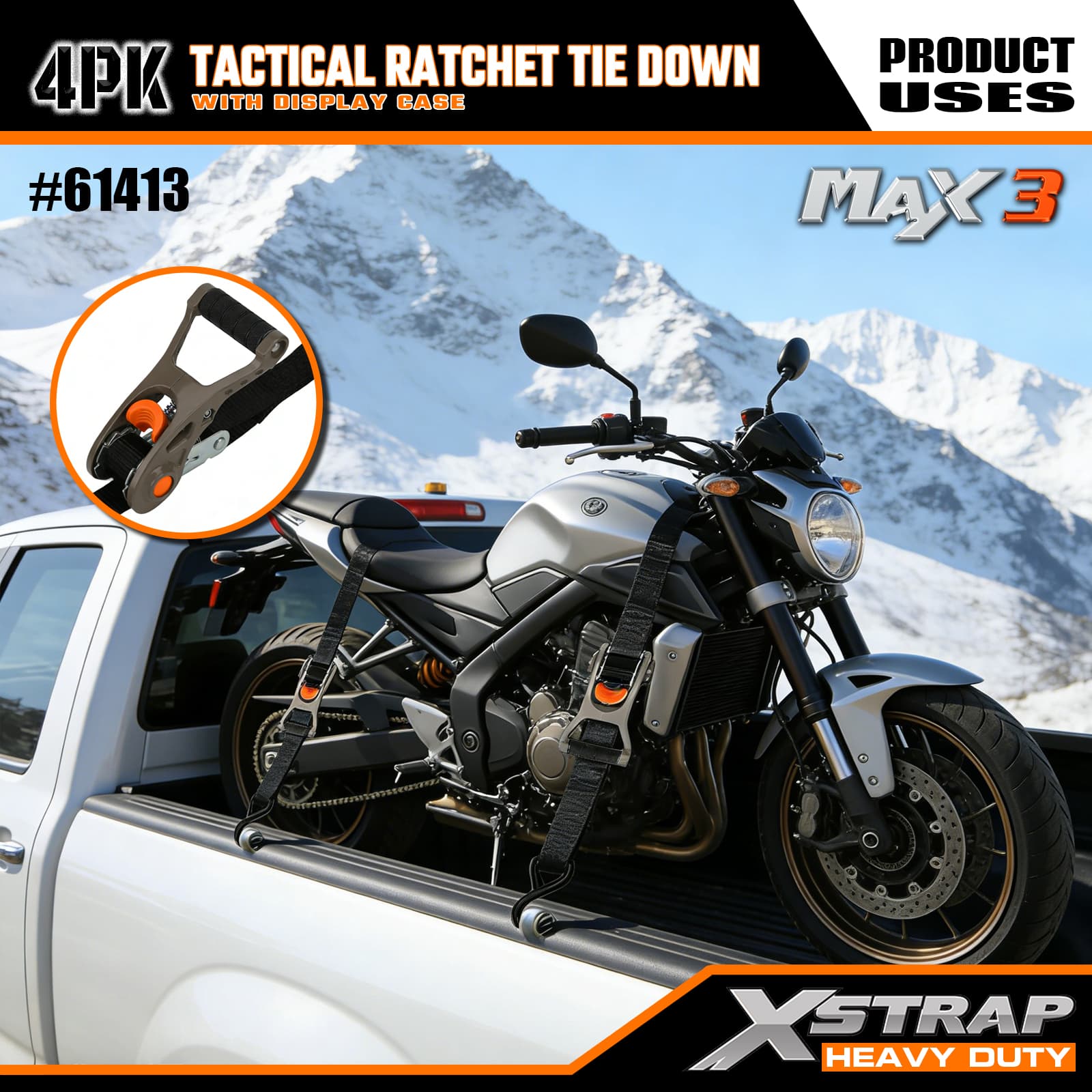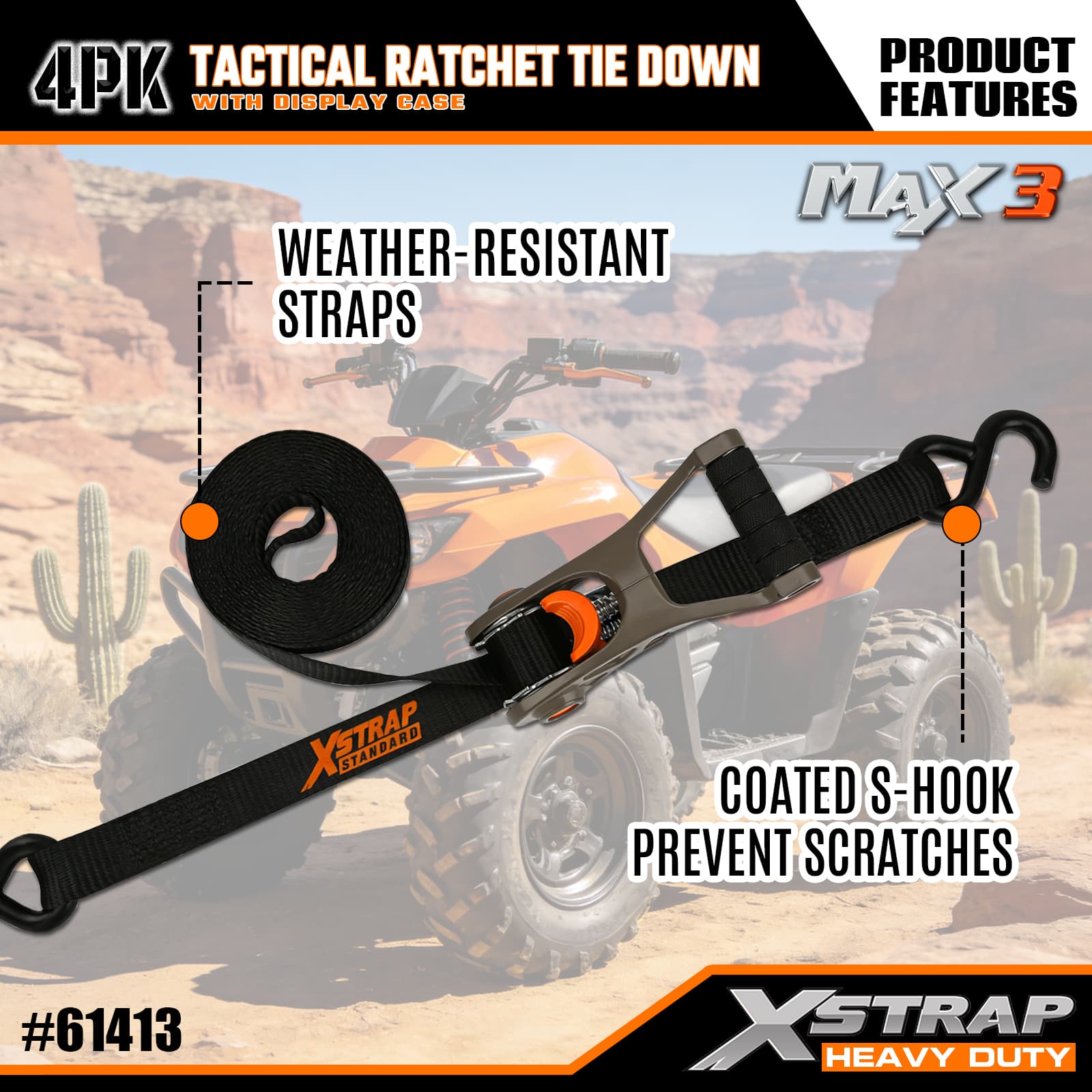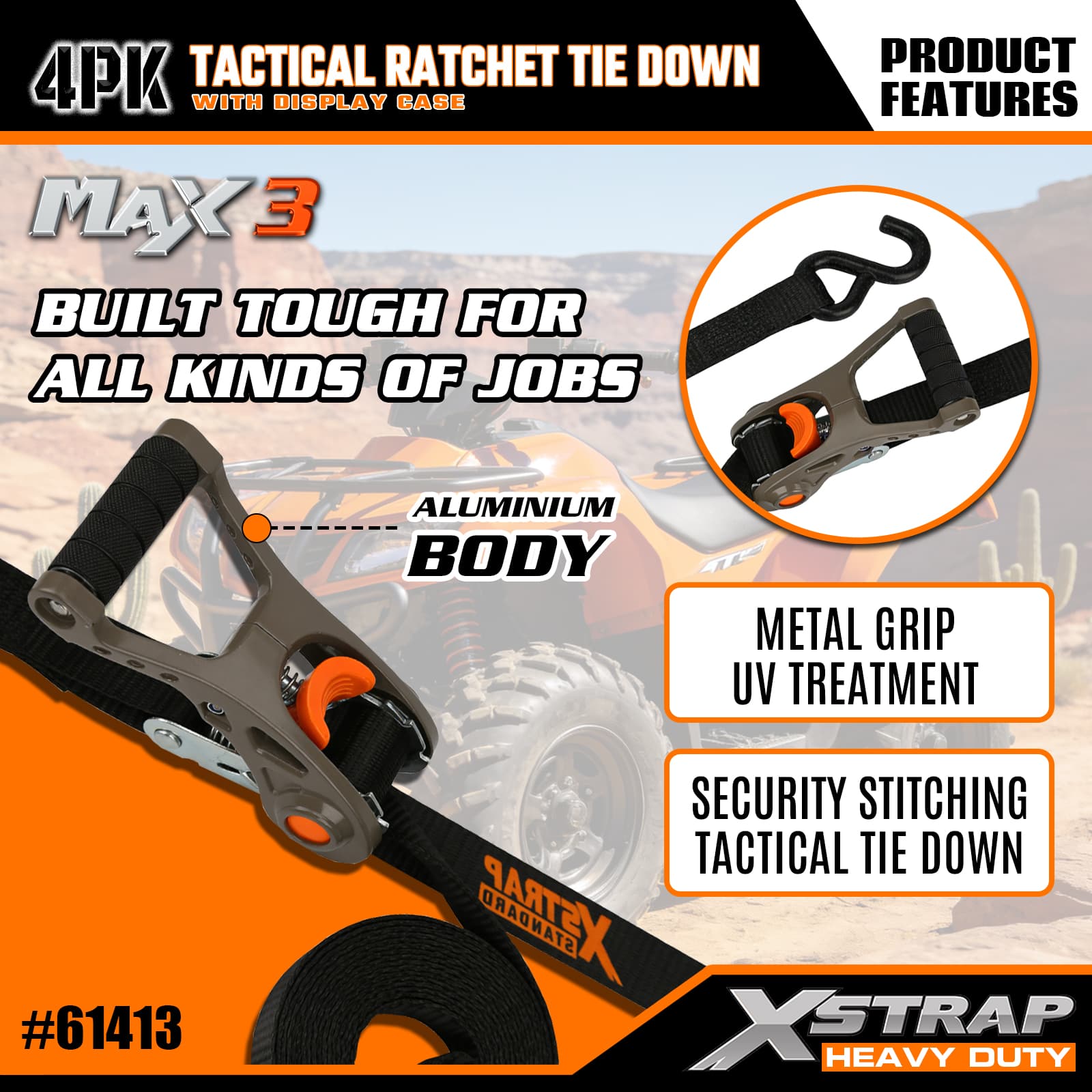 Xstrap 4 csomag taktikai racsnis megkötöző puha hurokkal, 1” x 14 hüvelykes poliészter megkötőszíj, húzható racsnis pánt, 1000 font teherbírású rakományrögzítő rögzítő hevederek S kampókkal teherautókhoz, terepjárókhoz, autós motorkerékpárokhoz.