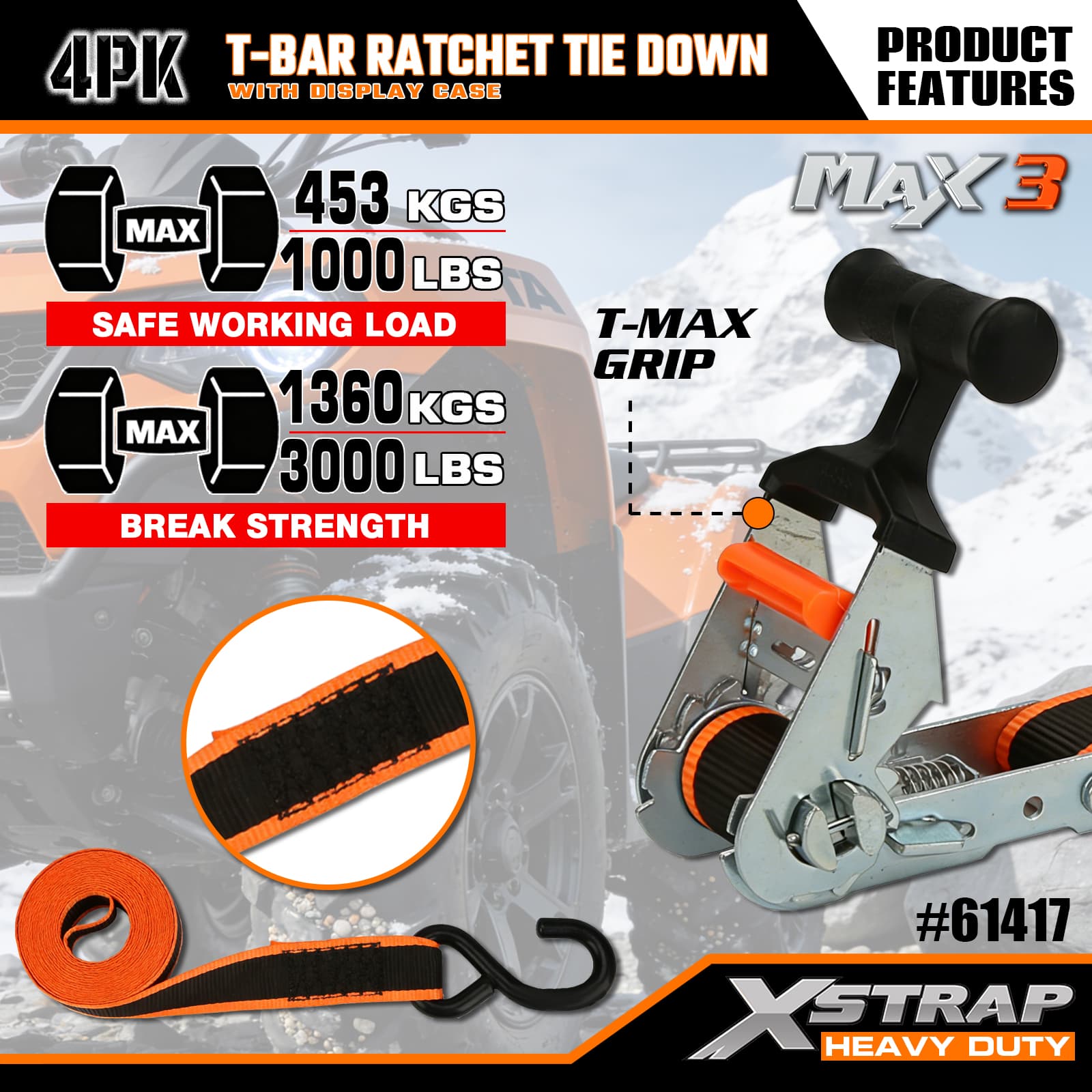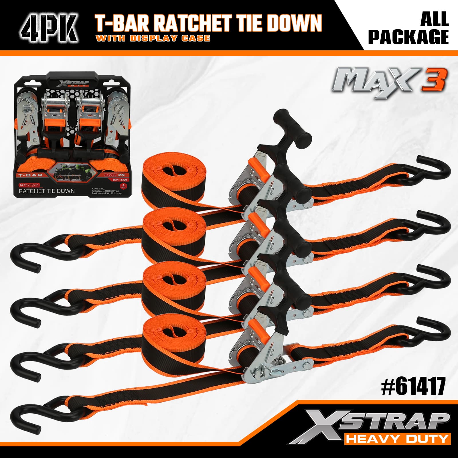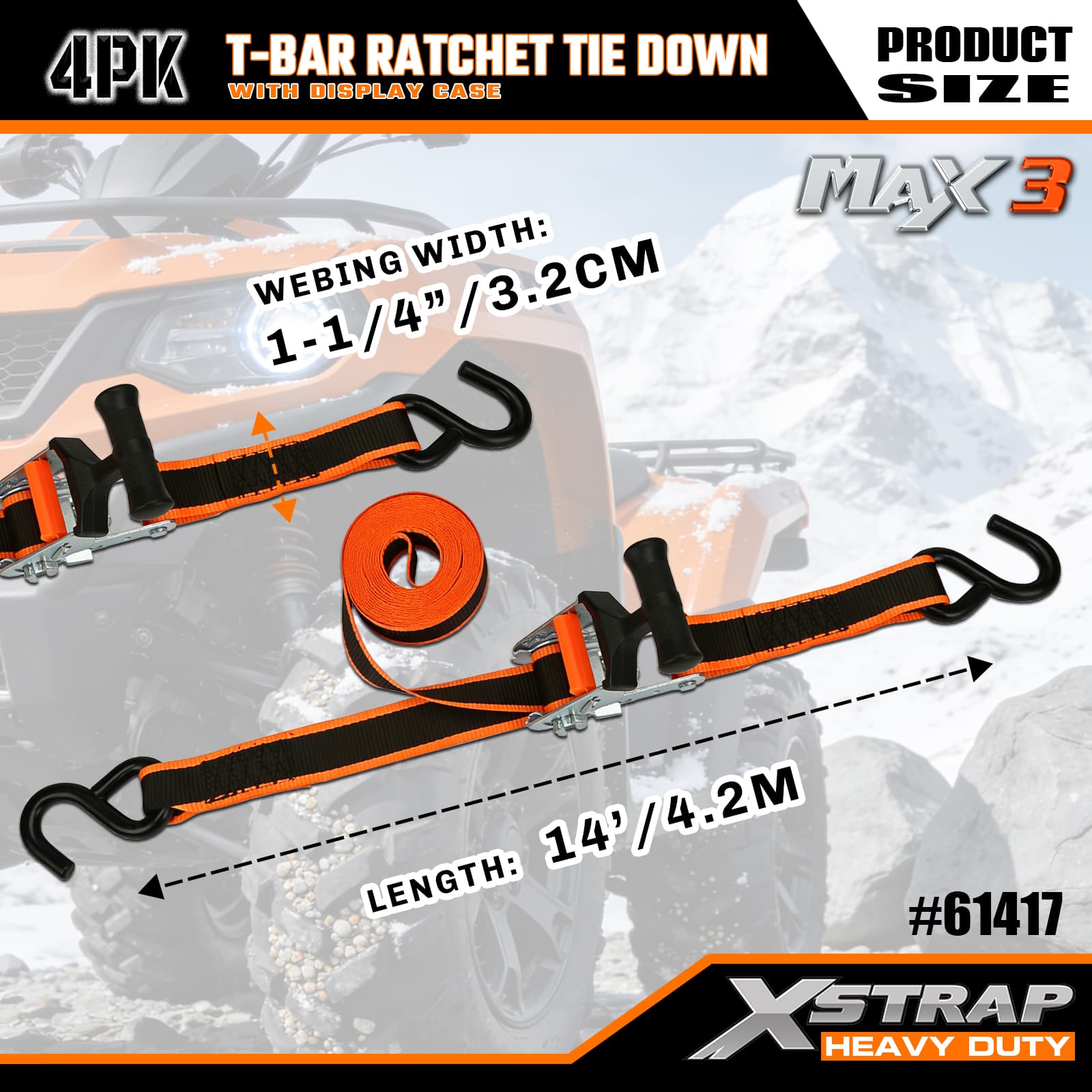 Xstrap 4 Pack T-Max markolat racsnis rögzítő, 1-1/4” x 14 hüvelykes poliészter rögzítőszíj, húzható racsnis heveder, 1000 font teherbírású rakományrögzítő rögzítő hevederek S horgokkal teherautókhoz, terepjárókhoz, autós felsőtartós motorkerékpárokhoz, terepjárókhoz, jetekhez, halászati motorkerékpárokhoz, jetekhez.