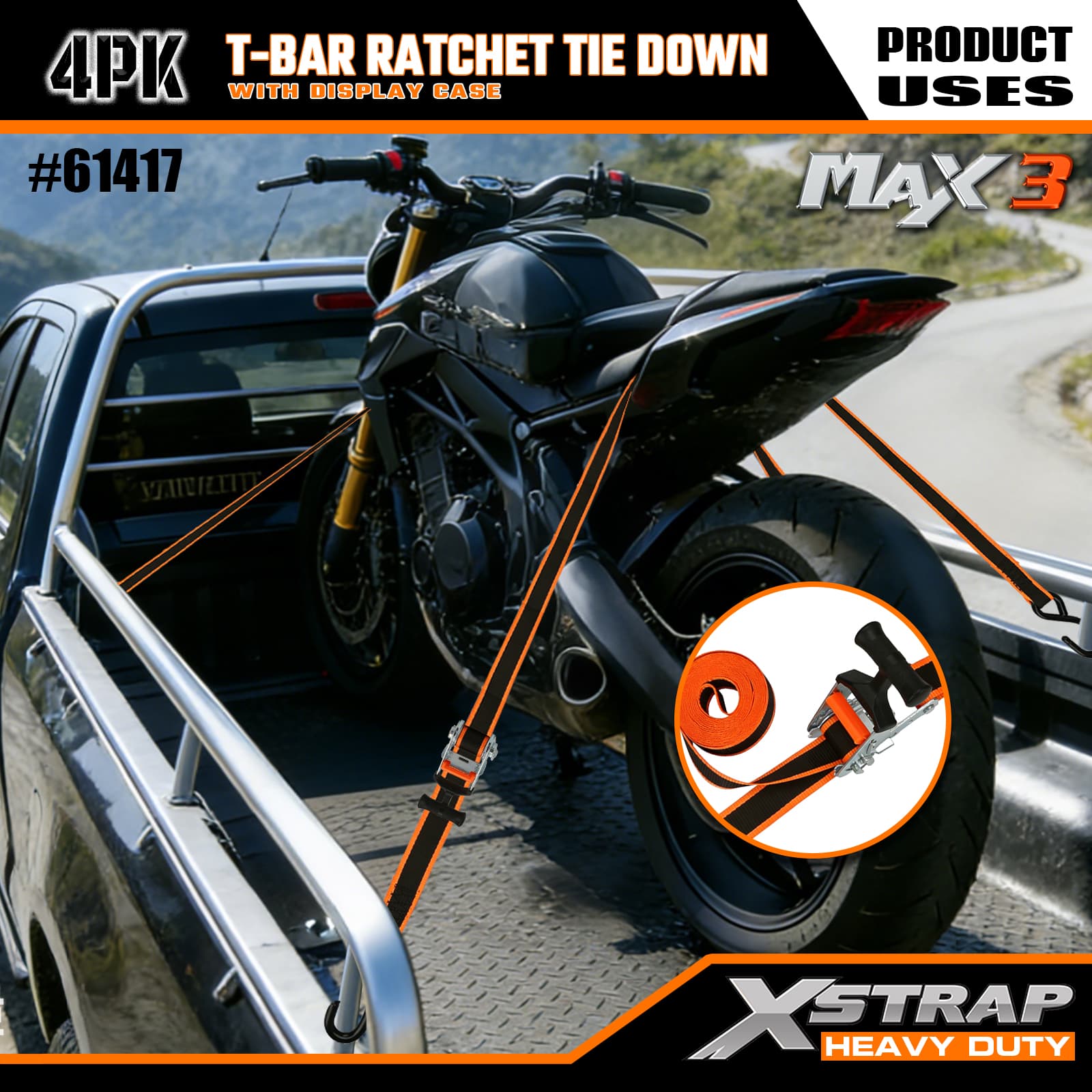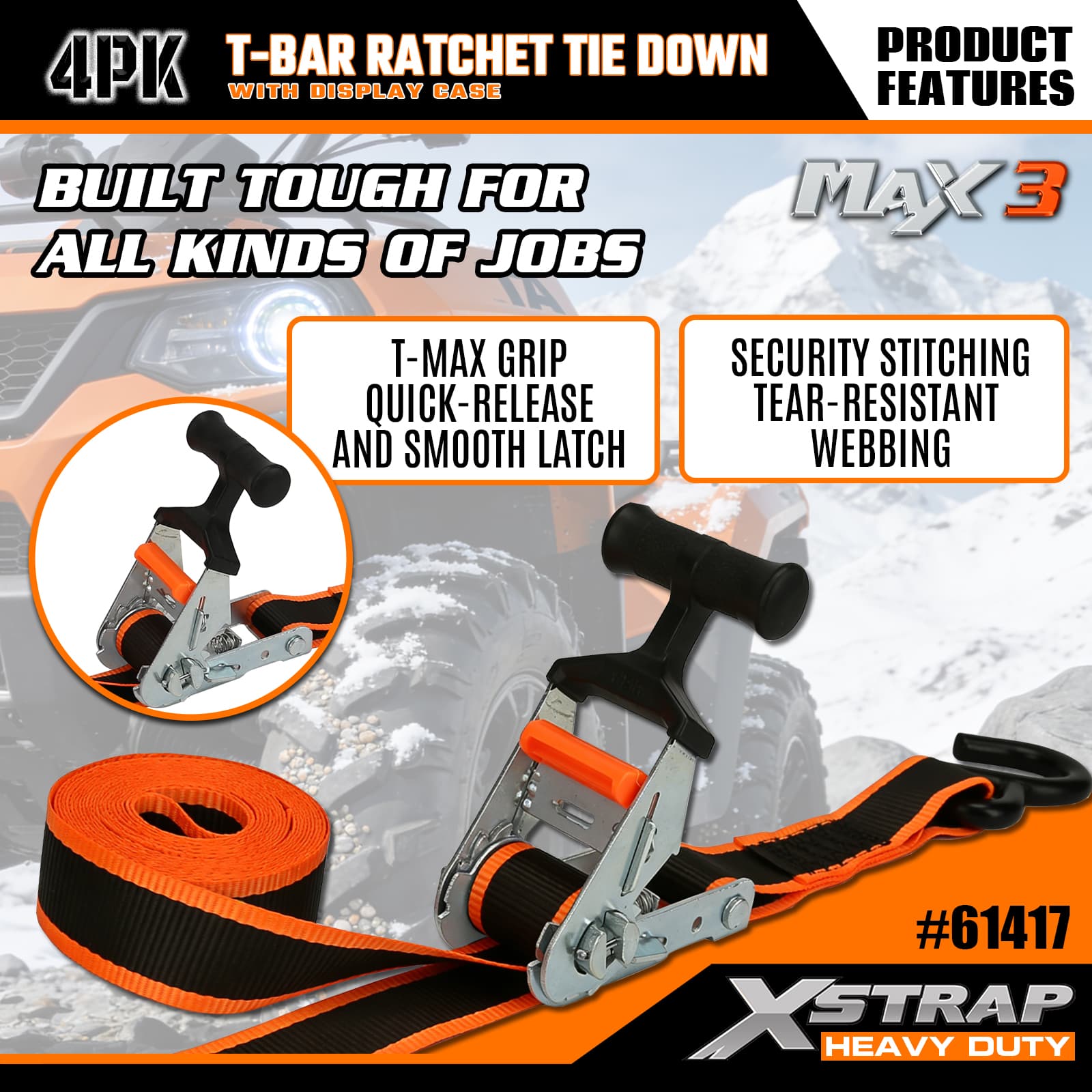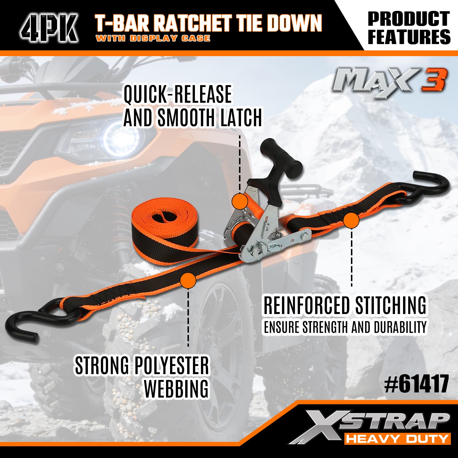 Xstrap 4 Pack T-Max markolat racsnis rögzítő, 1-1/4” x 14 hüvelykes poliészter rögzítőszíj, húzható racsnis heveder, 1000 font teherbírású rakományrögzítő rögzítő hevederek S horgokkal teherautókhoz, terepjárókhoz, autós felsőtartós motorkerékpárokhoz, terepjárókhoz, jetekhez, halászati motorkerékpárokhoz, jetekhez.