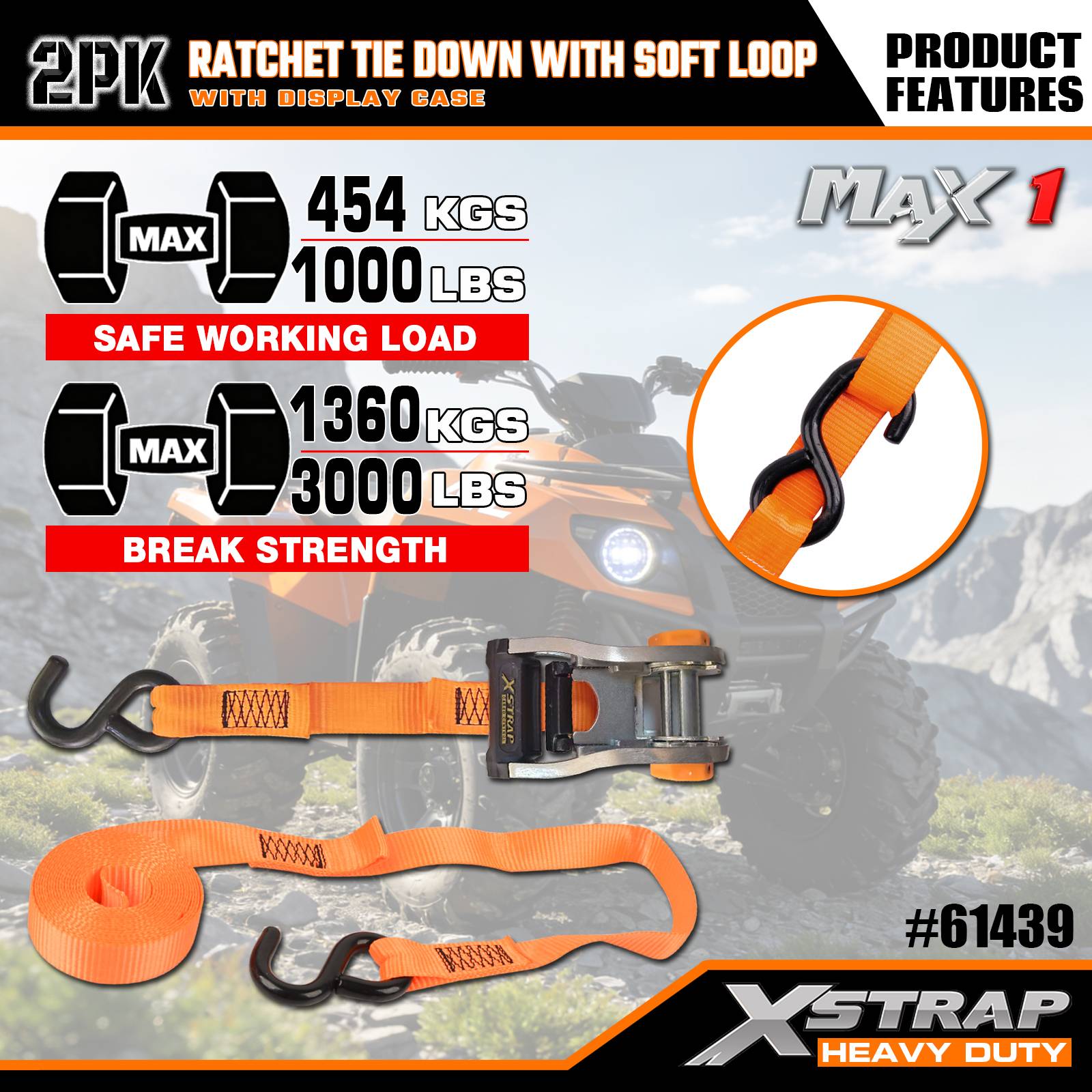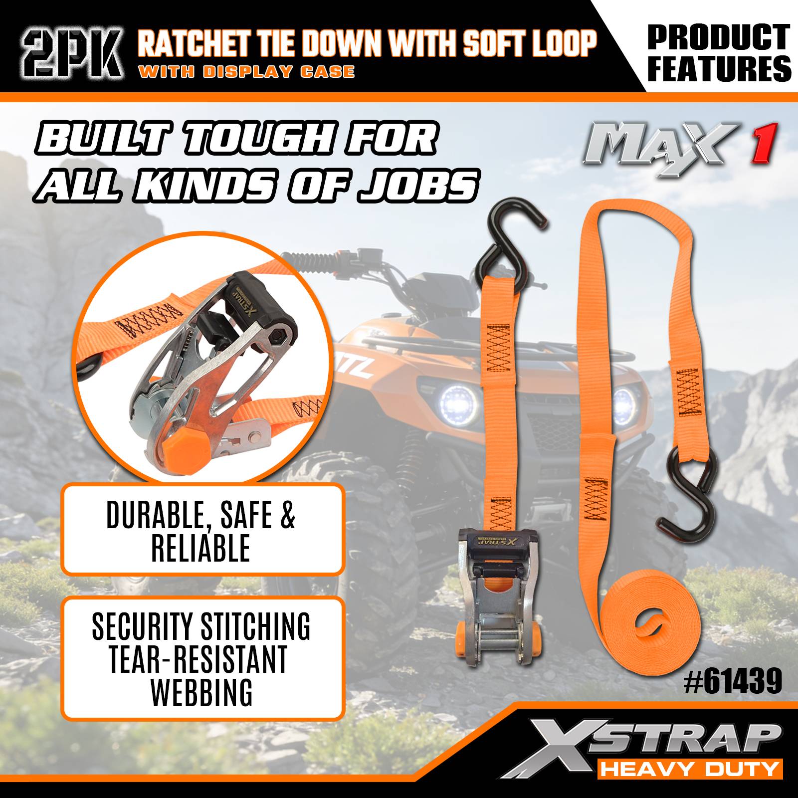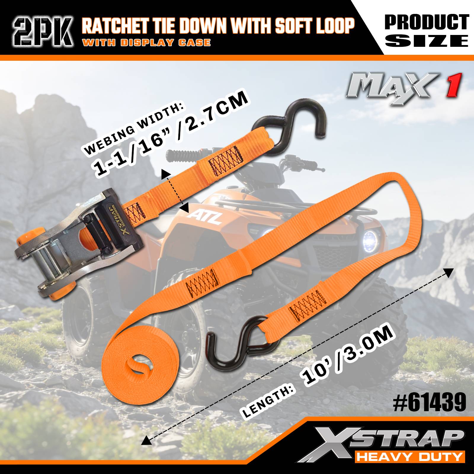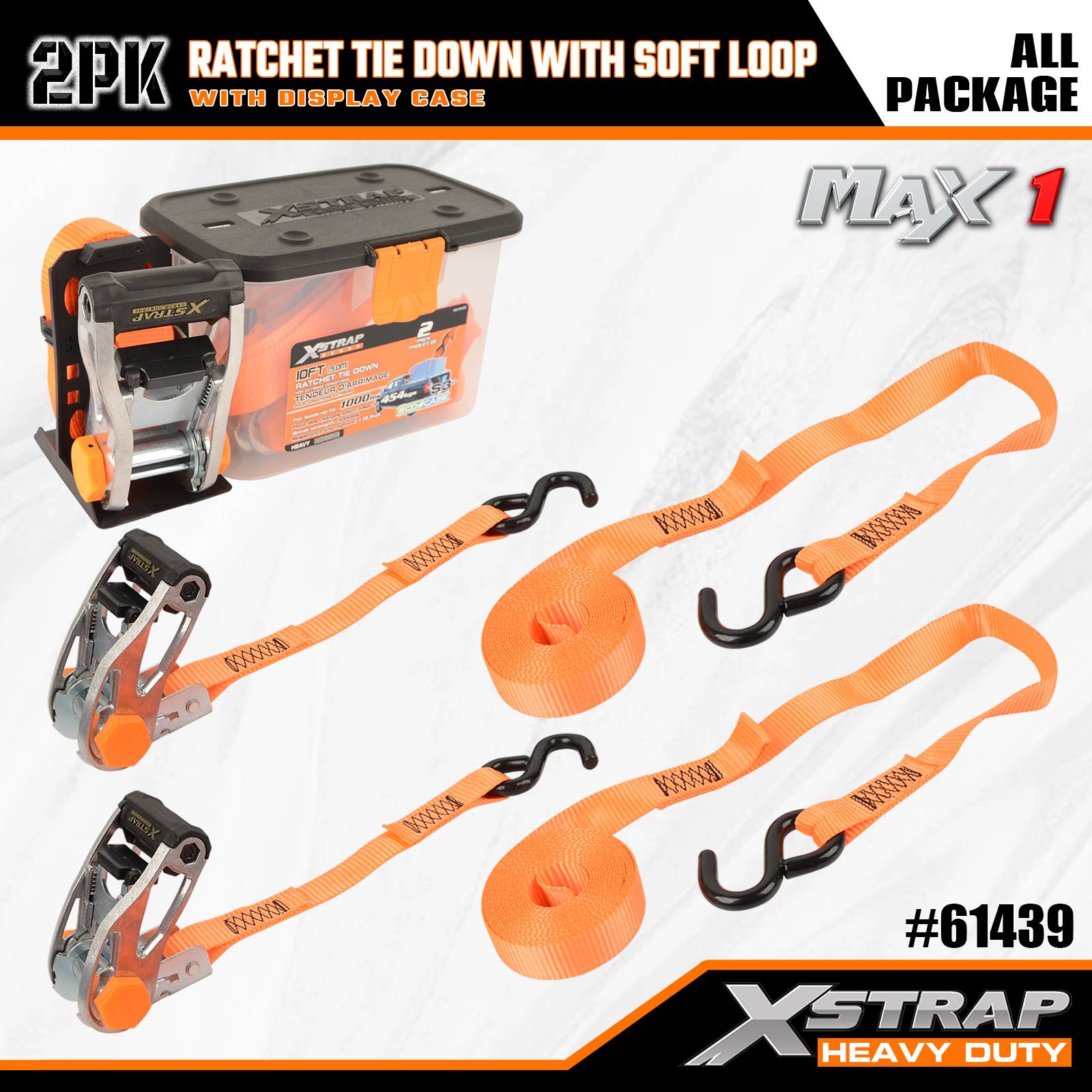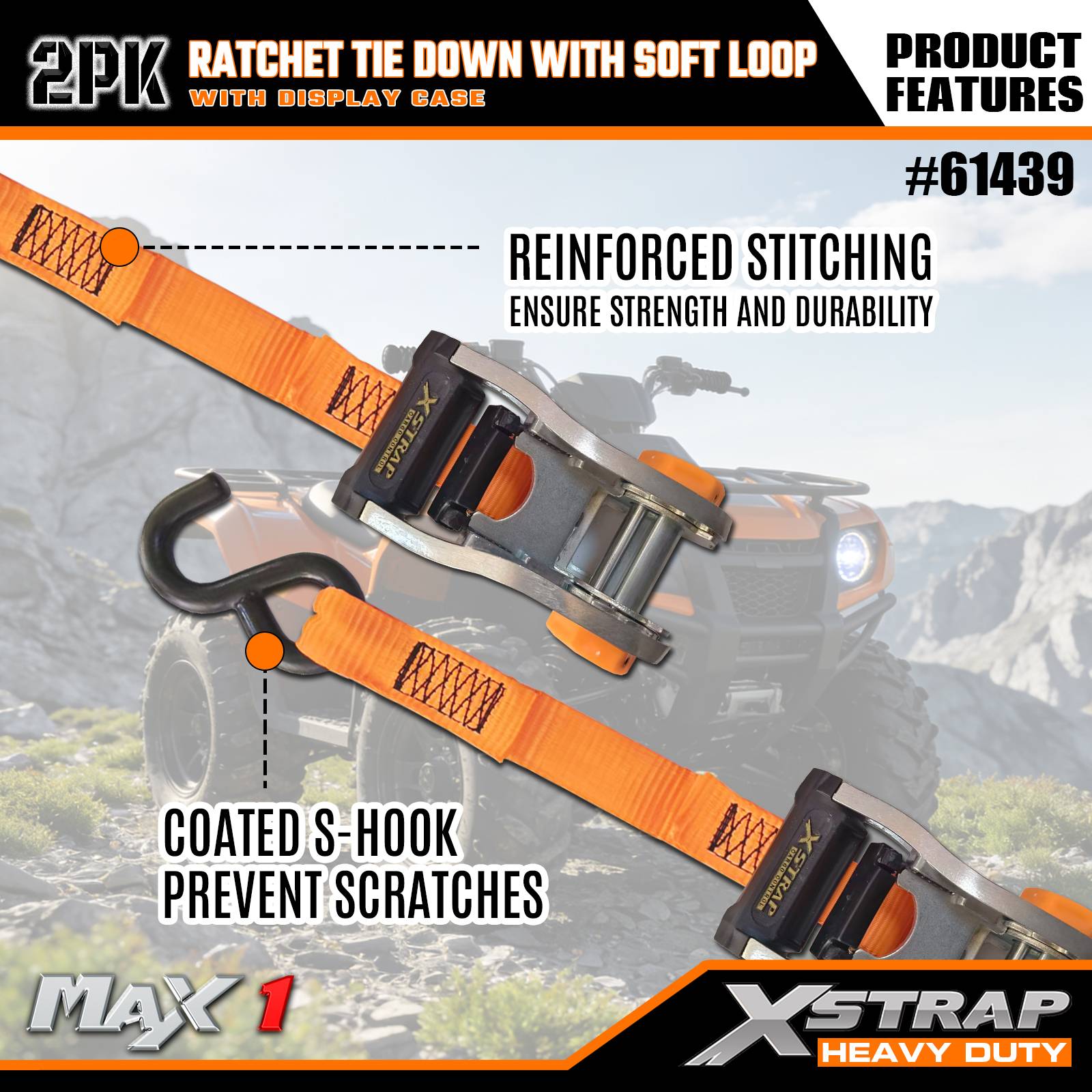 Xstrap 2 csomagos racsnis megkötöző puha hurokkal, 1-1/16” x 10”-es poliészter megkötőszíj, húzható racsnis pánt, 1000 font teherbírású rakományrögzítő rögzítő hevederek S kampókkal teherautókhoz, SUV-okhoz, autóra szerelhető motorkerékpárokhoz.