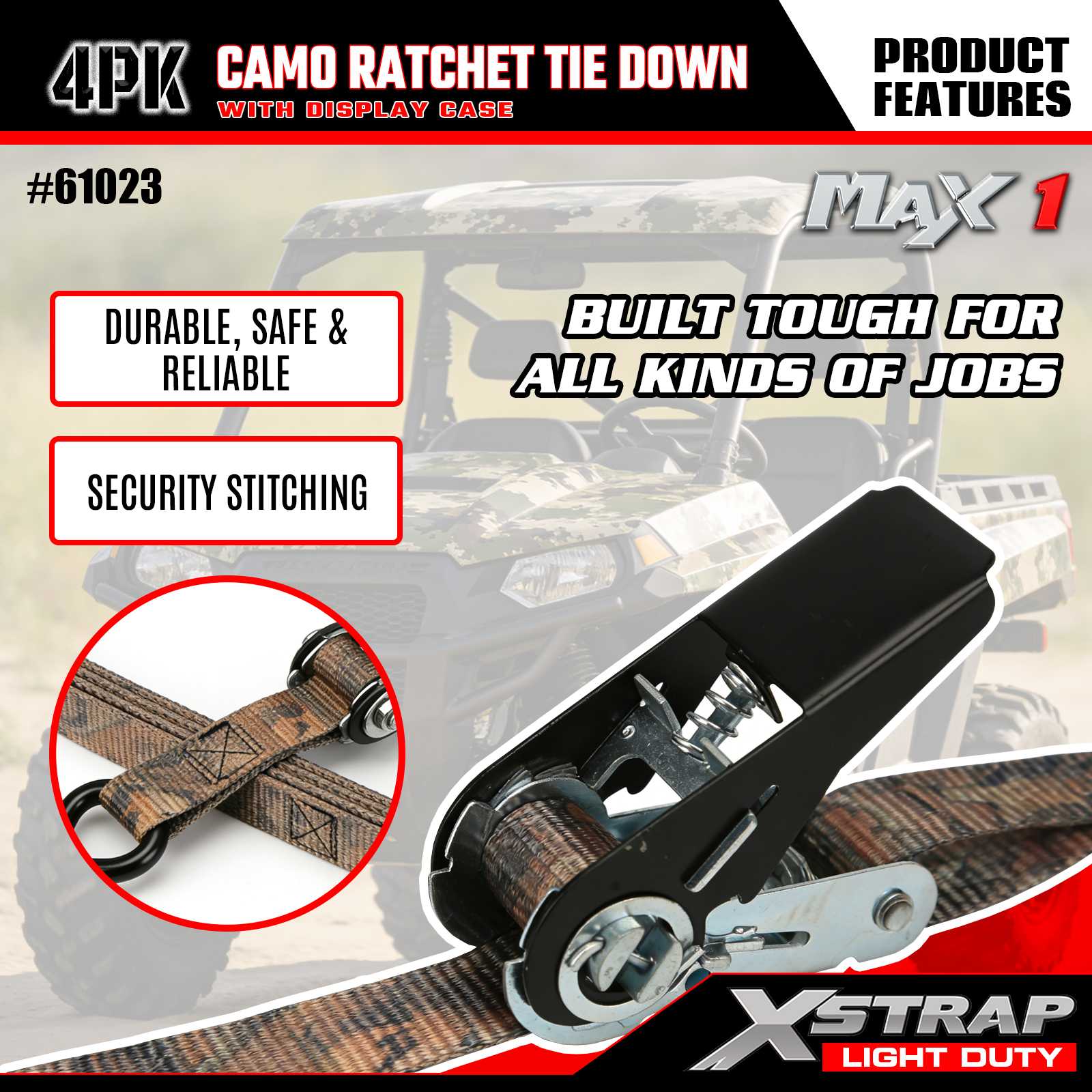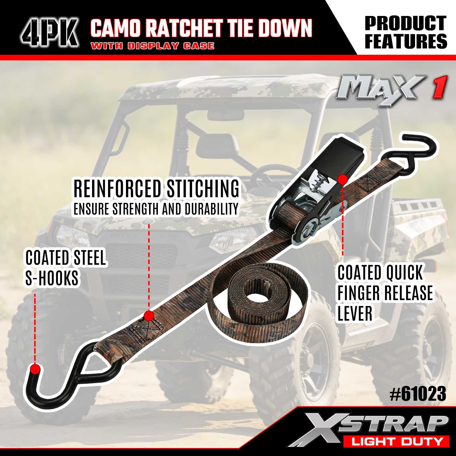 Az Xstrap 4PK CAMO racsnis rögzítőpántok 1 x 10 láb méretűek, a biztonságos munkaterhelés 300 font, a szakítószilárdsága pedig 900 font.