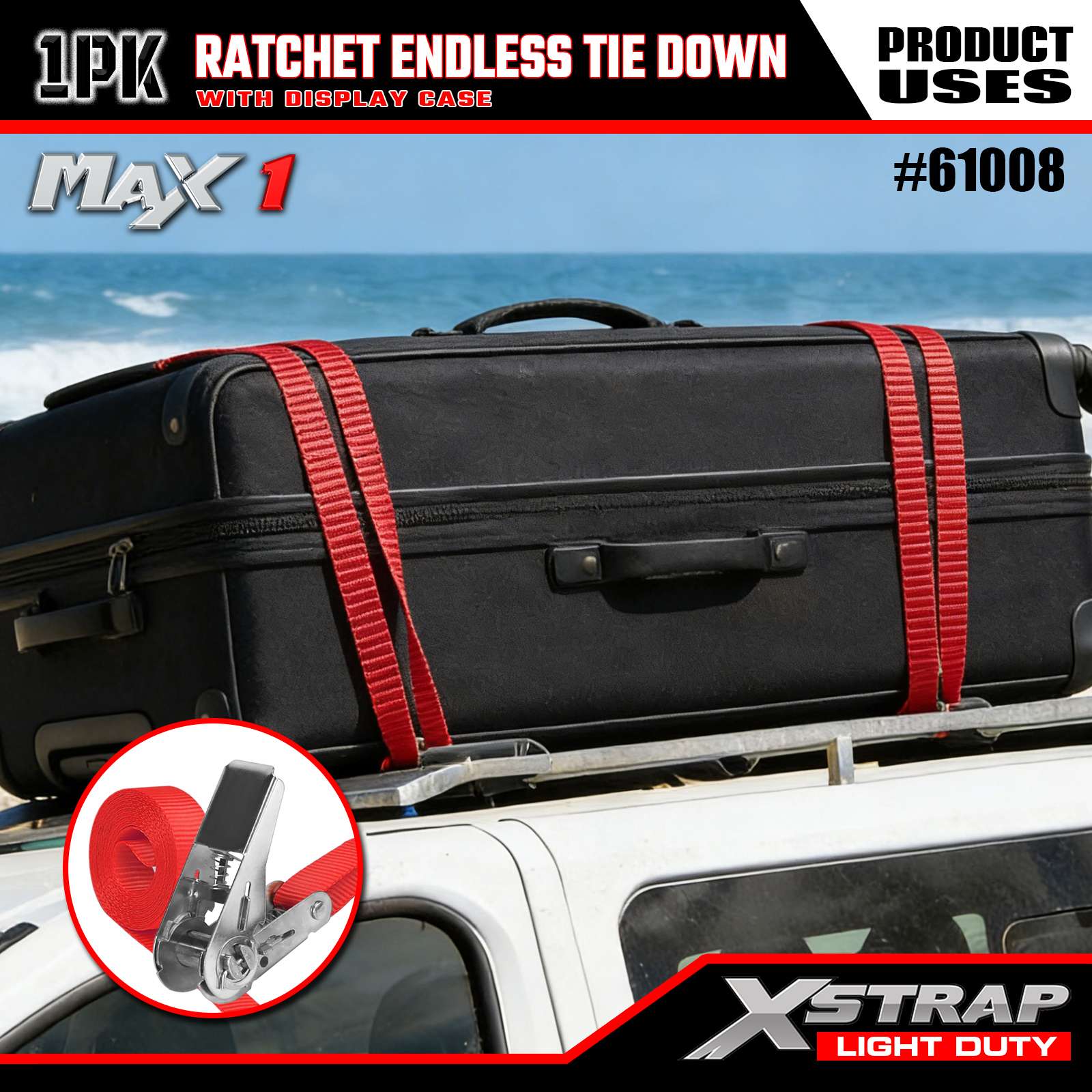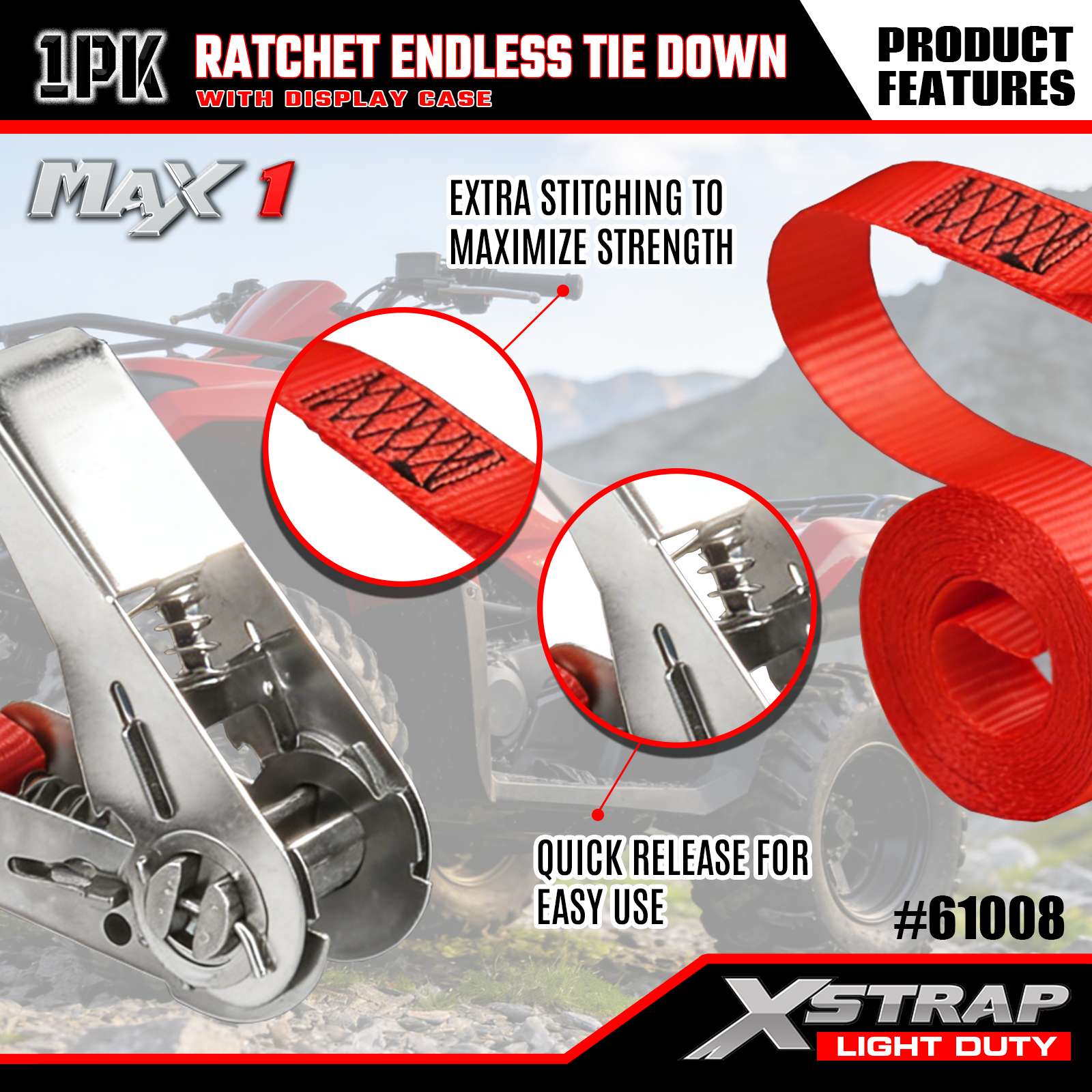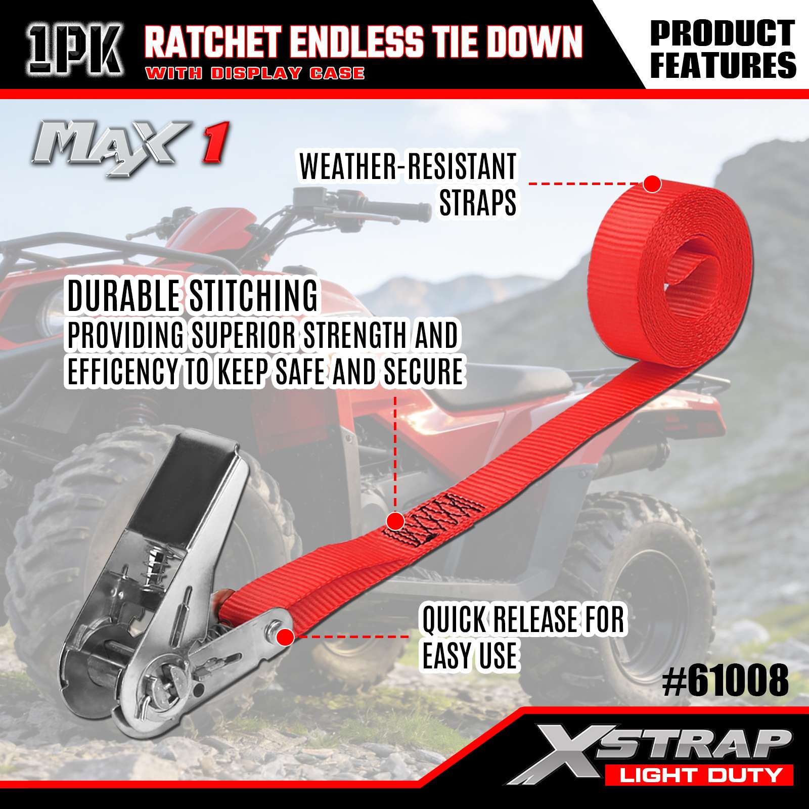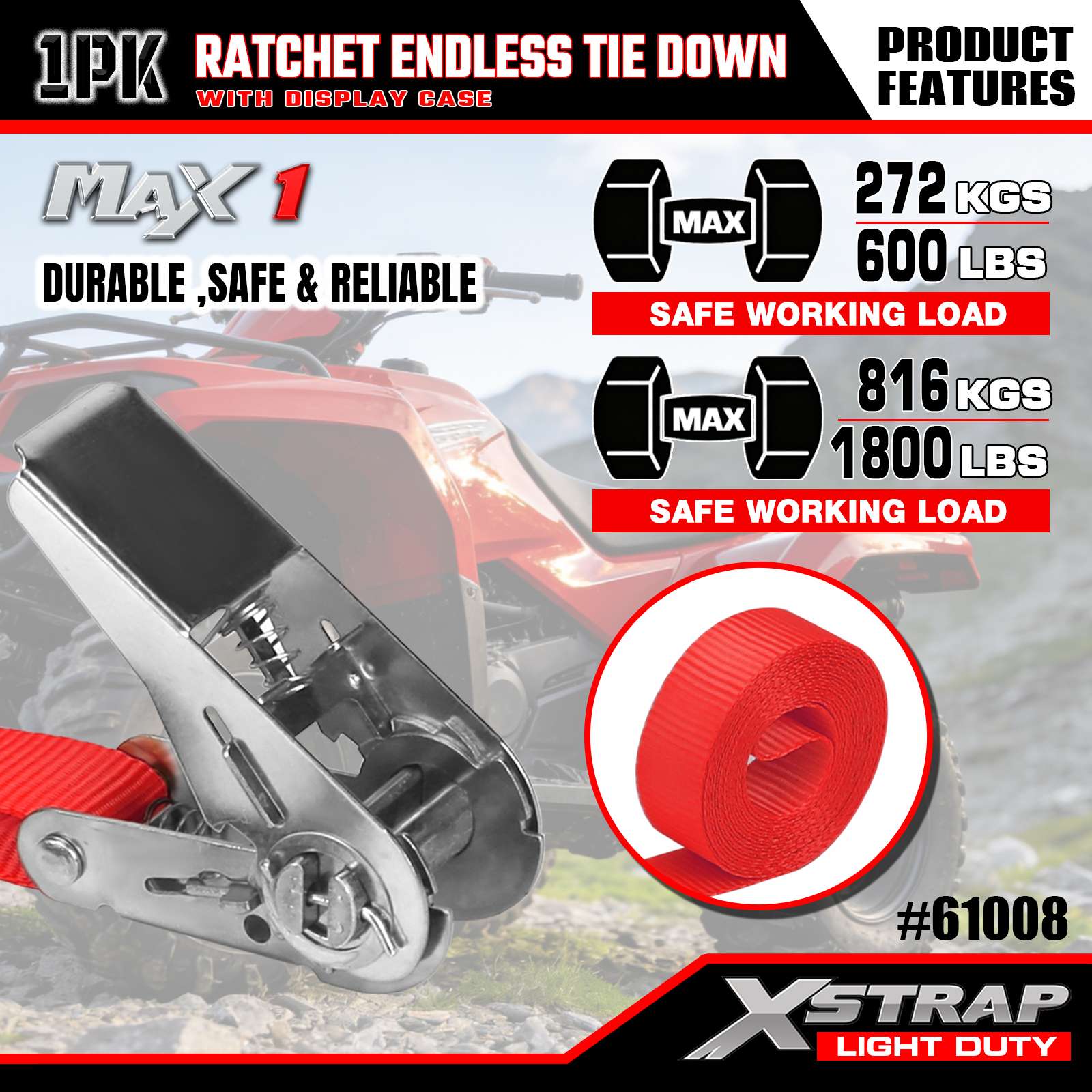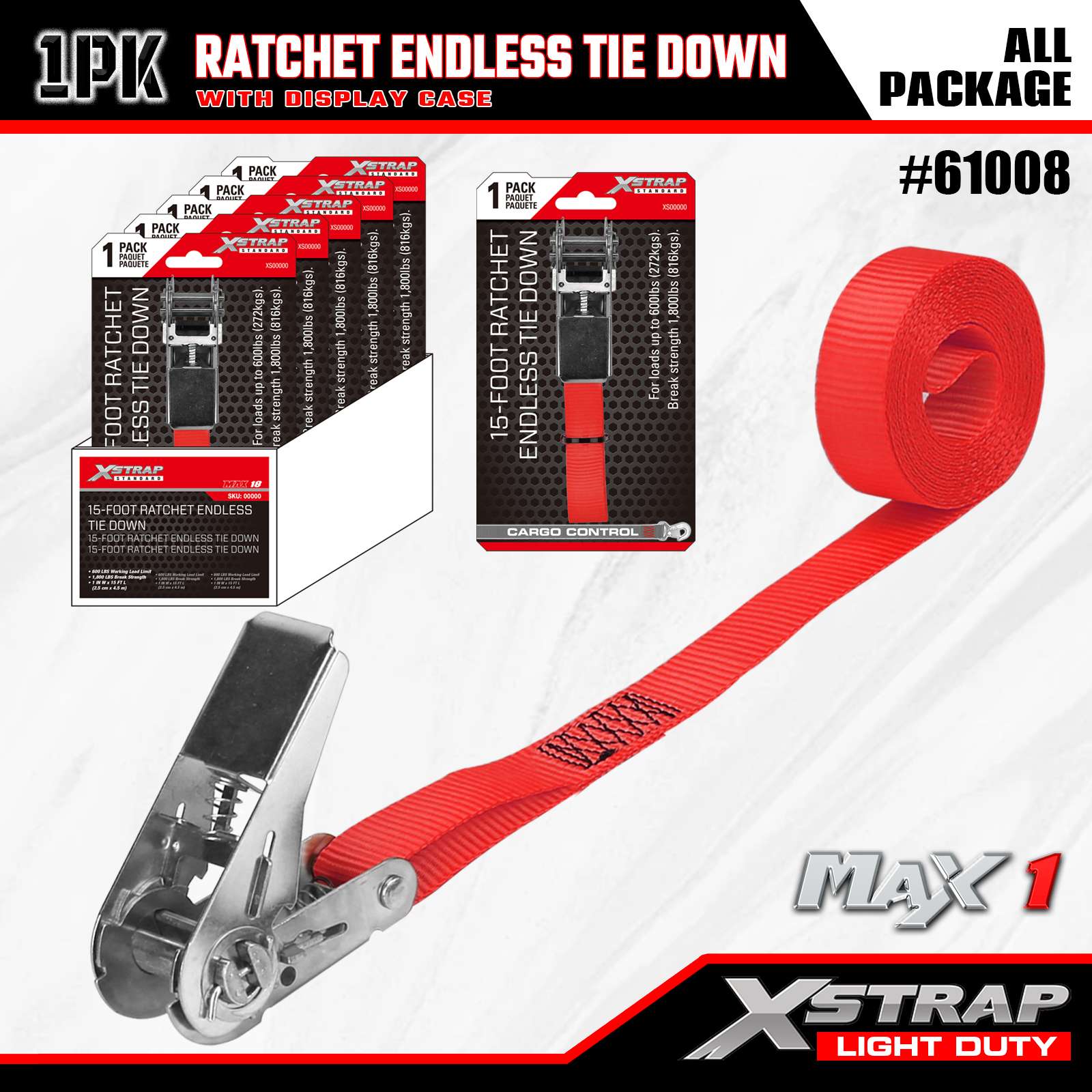 Xstrap 1 csomagos racsnis végtelen rögzítőpántok, 1" x 15" - 600 font teherbírás - 1800 font törési szilárdságú teherszíjak mozgó berendezésekhez, füves felszerelésekhez, motorkerékpárokhoz, terepszínekhez