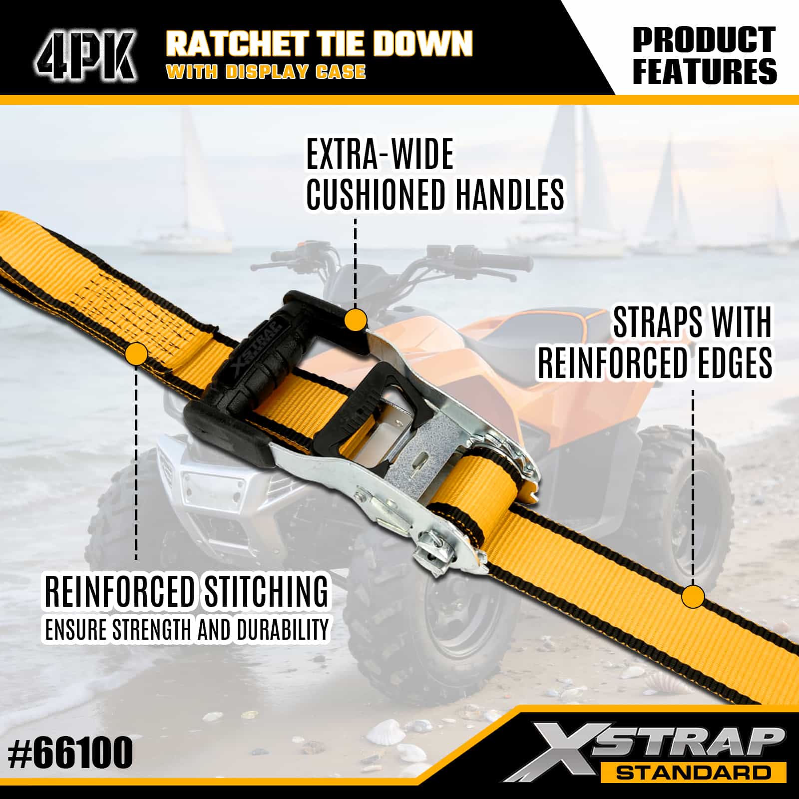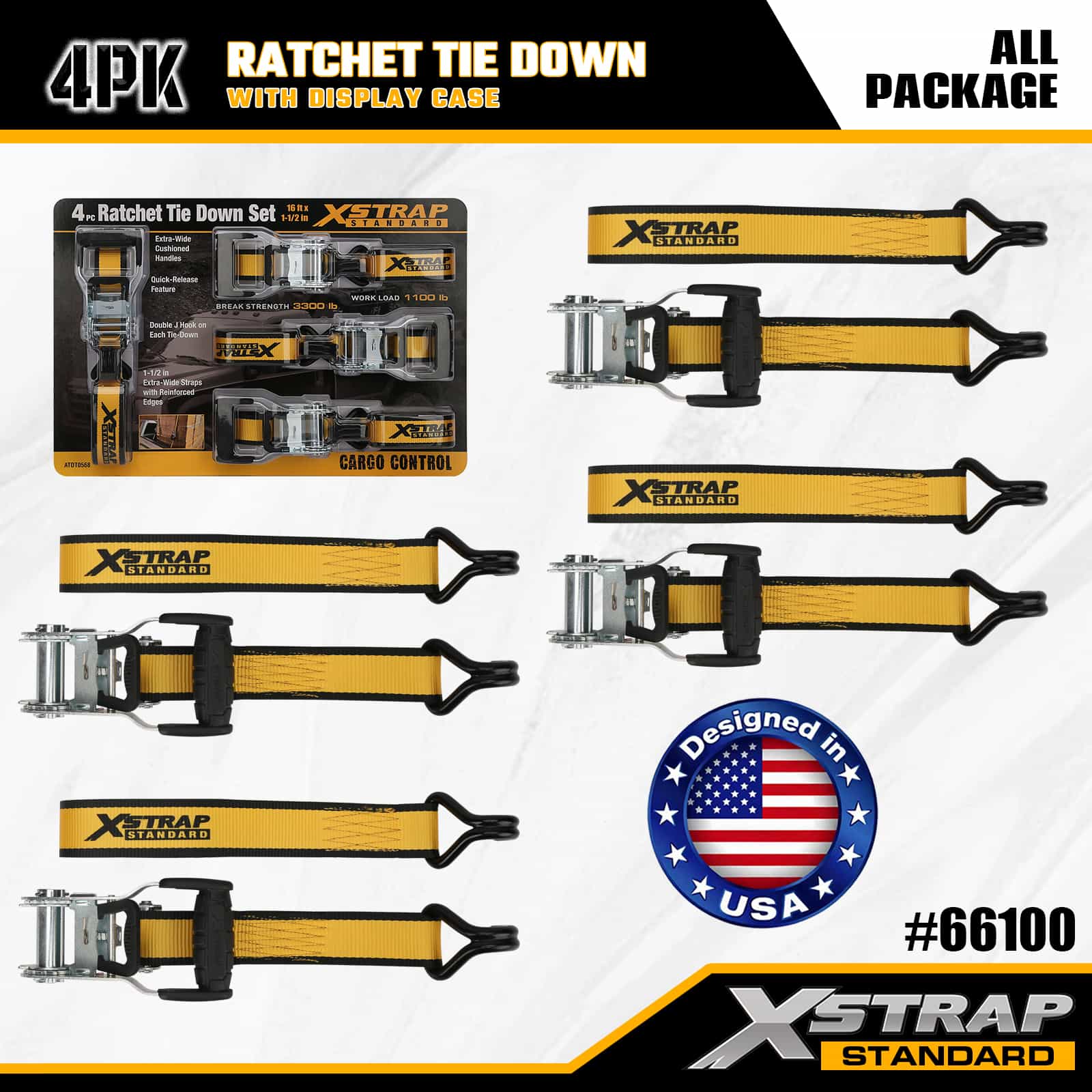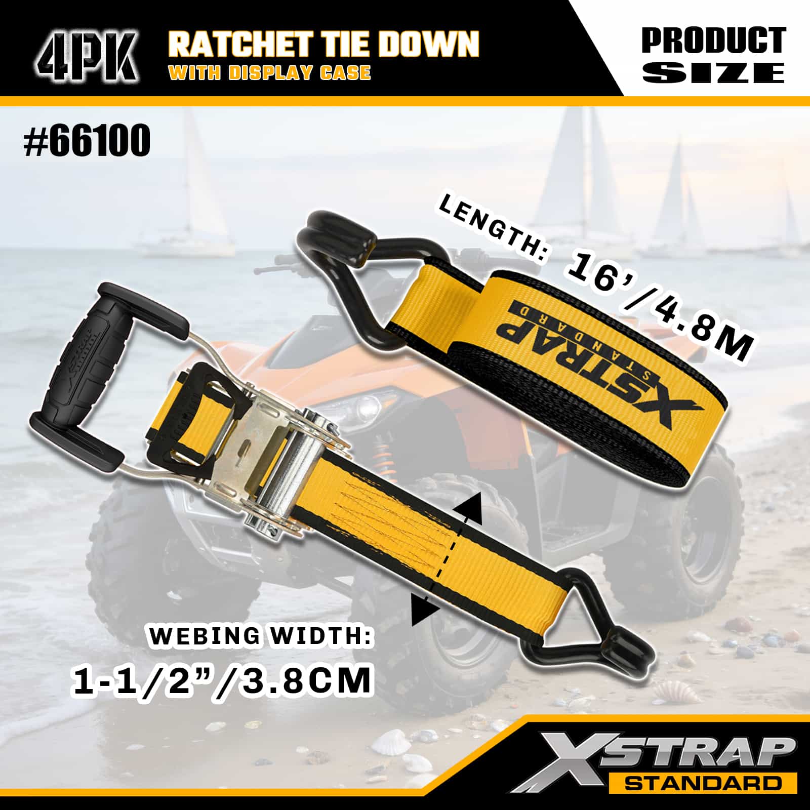 Xstrap 4 csomagos racsnis rögzítés dupla J horgokkal, 1-1/2" x 16" poliészter kötözőpánt húzó racsnis pánt, 1100 font teherbírású rakományrögzítő rögzítő hevederek dupla J horgokkal kisteherautókhoz, terepjárókhoz, autóra szerelhető fogaskerekekhez, motorkerékpárokhoz, Jet horgászcsónakokhoz, hómobilokhoz, könnyű horgászhajókhoz.