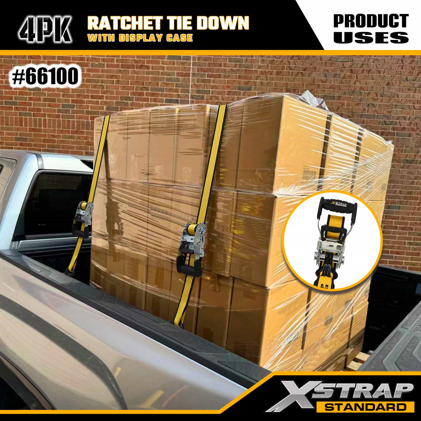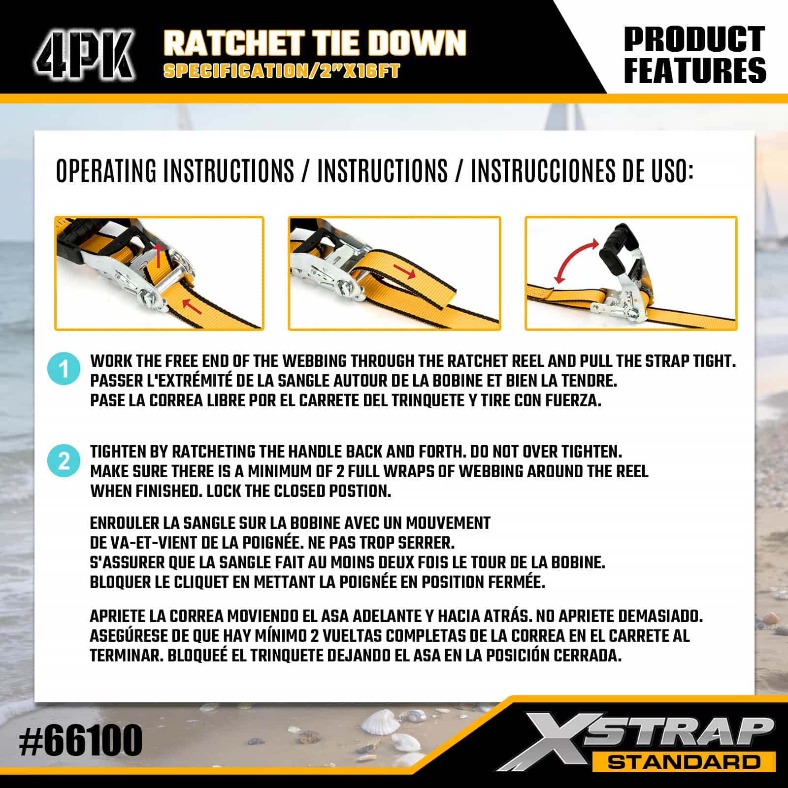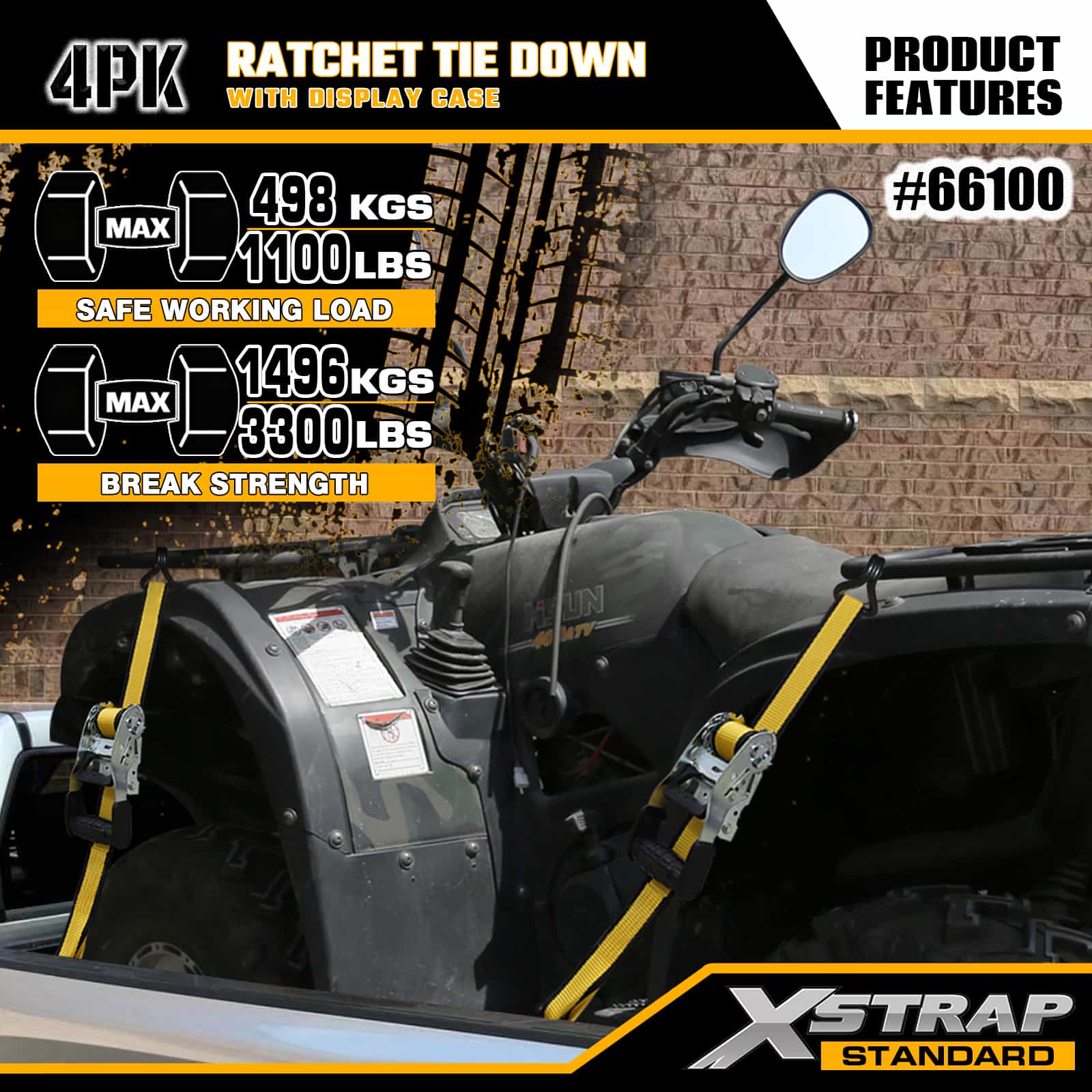 Xstrap 4 csomagos racsnis rögzítés dupla J horgokkal, 1-1/2" x 16" poliészter kötözőpánt húzó racsnis pánt, 1100 font teherbírású rakományrögzítő rögzítő hevederek dupla J horgokkal kisteherautókhoz, terepjárókhoz, autóra szerelhető fogaskerekekhez, motorkerékpárokhoz, Jet horgászcsónakokhoz, hómobilokhoz, könnyű horgászhajókhoz.