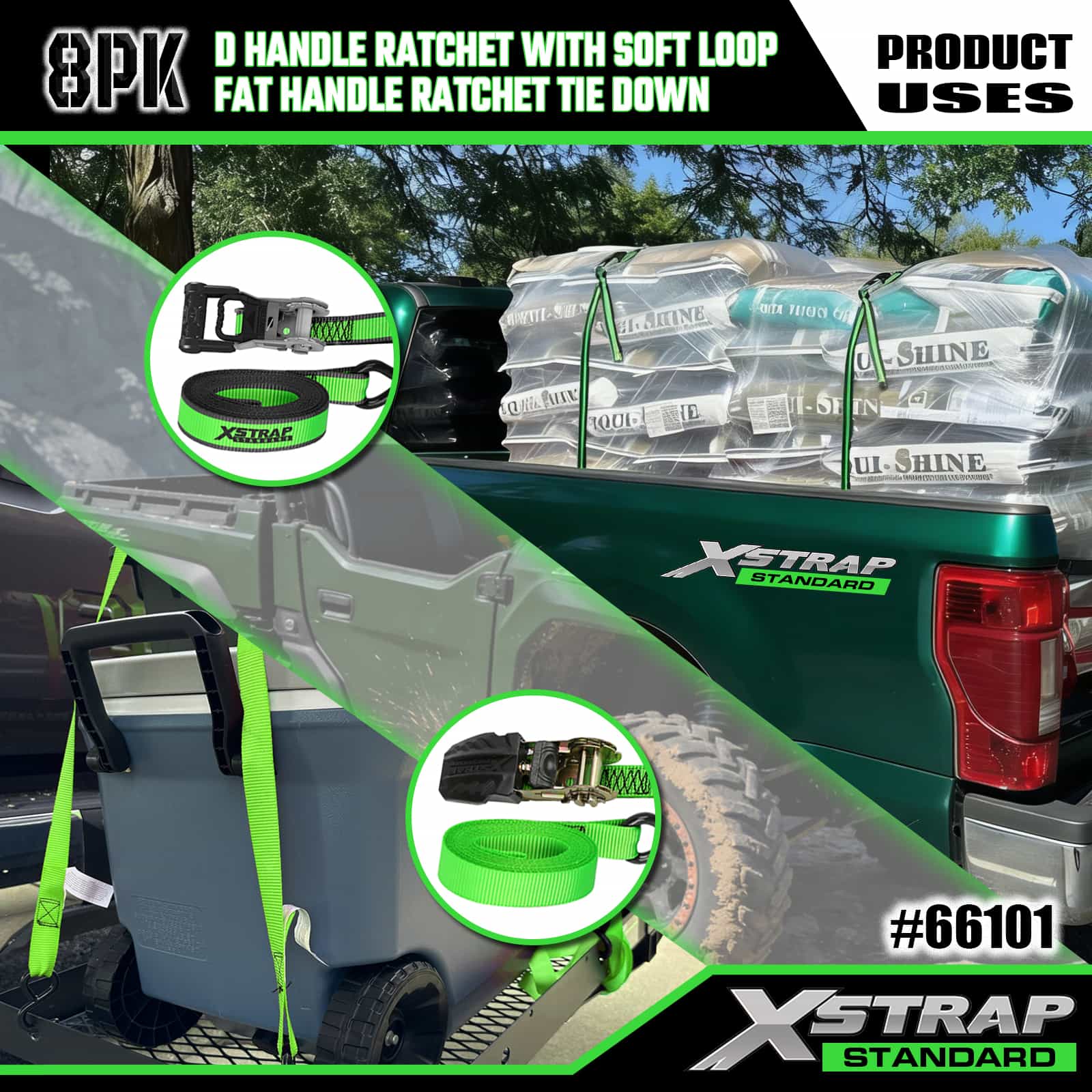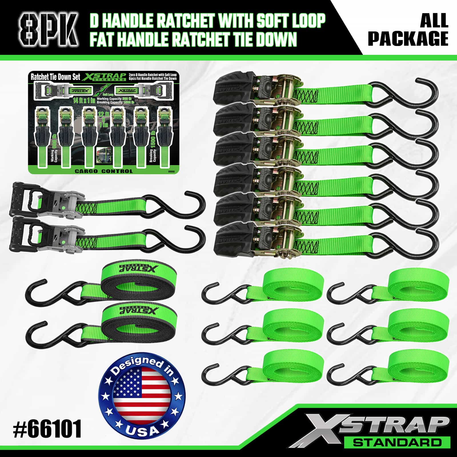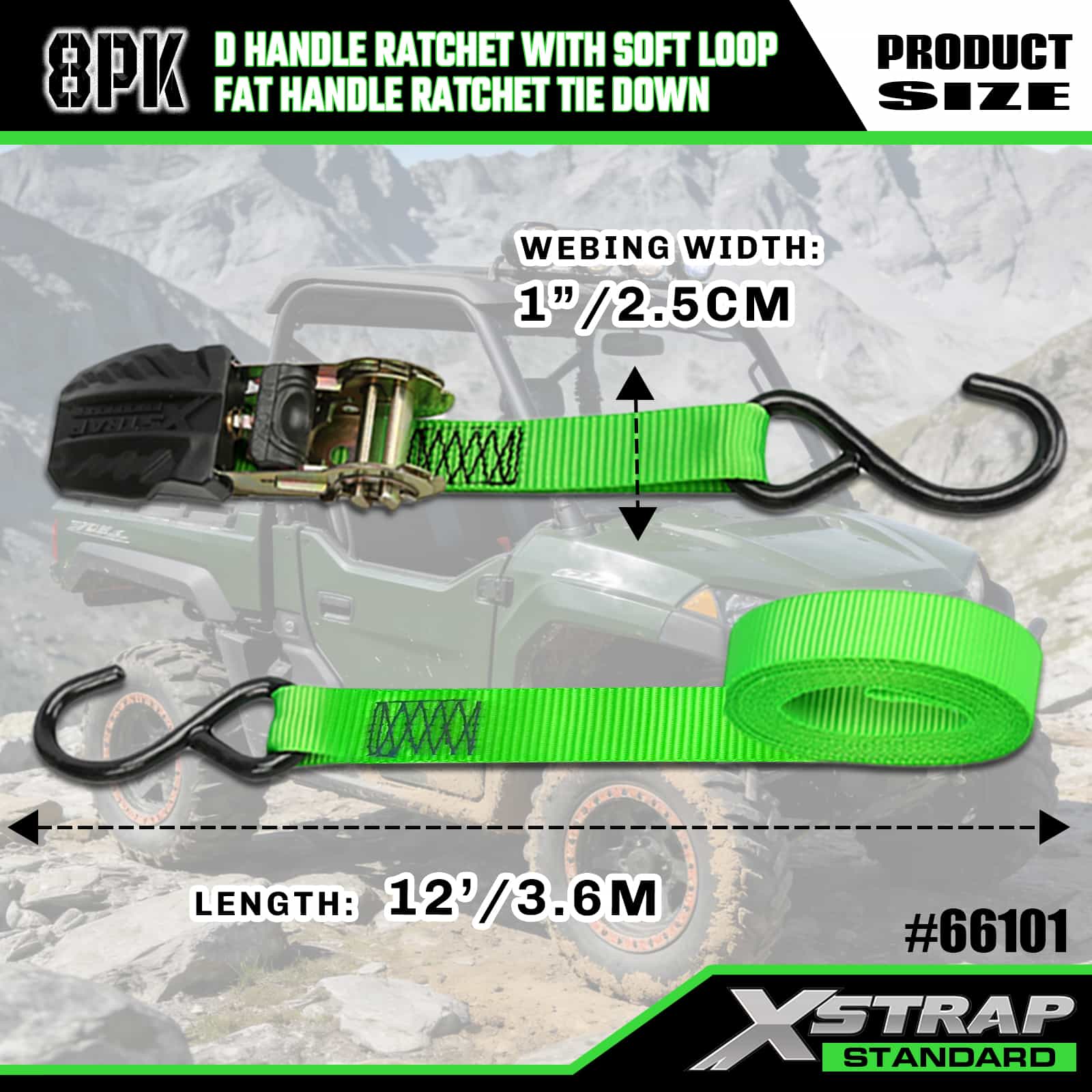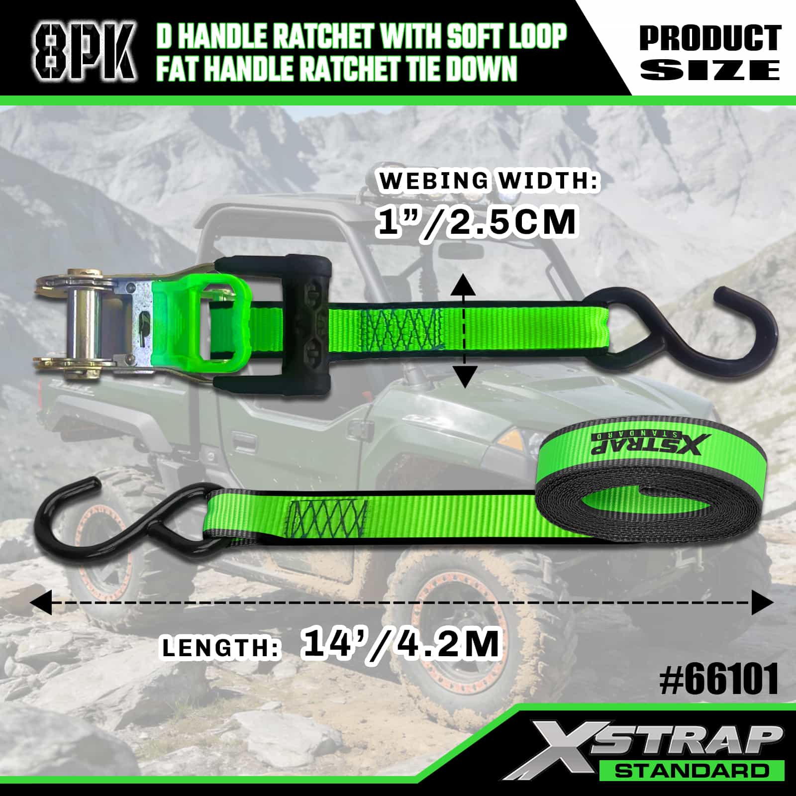Xstrap 8 Pack alumínium racsnis megkötöző, 1” x 14” és 1 x 12 hüvelykes poliészter rögzítőszíj, húzható racsnis szíj, 500 font teherbírású rakományrögzítő rögzítő hevederek S-kampókkal rakományvezérléshez, kisteherautókhoz, motorkerékpárokhoz, terepjárókhoz.