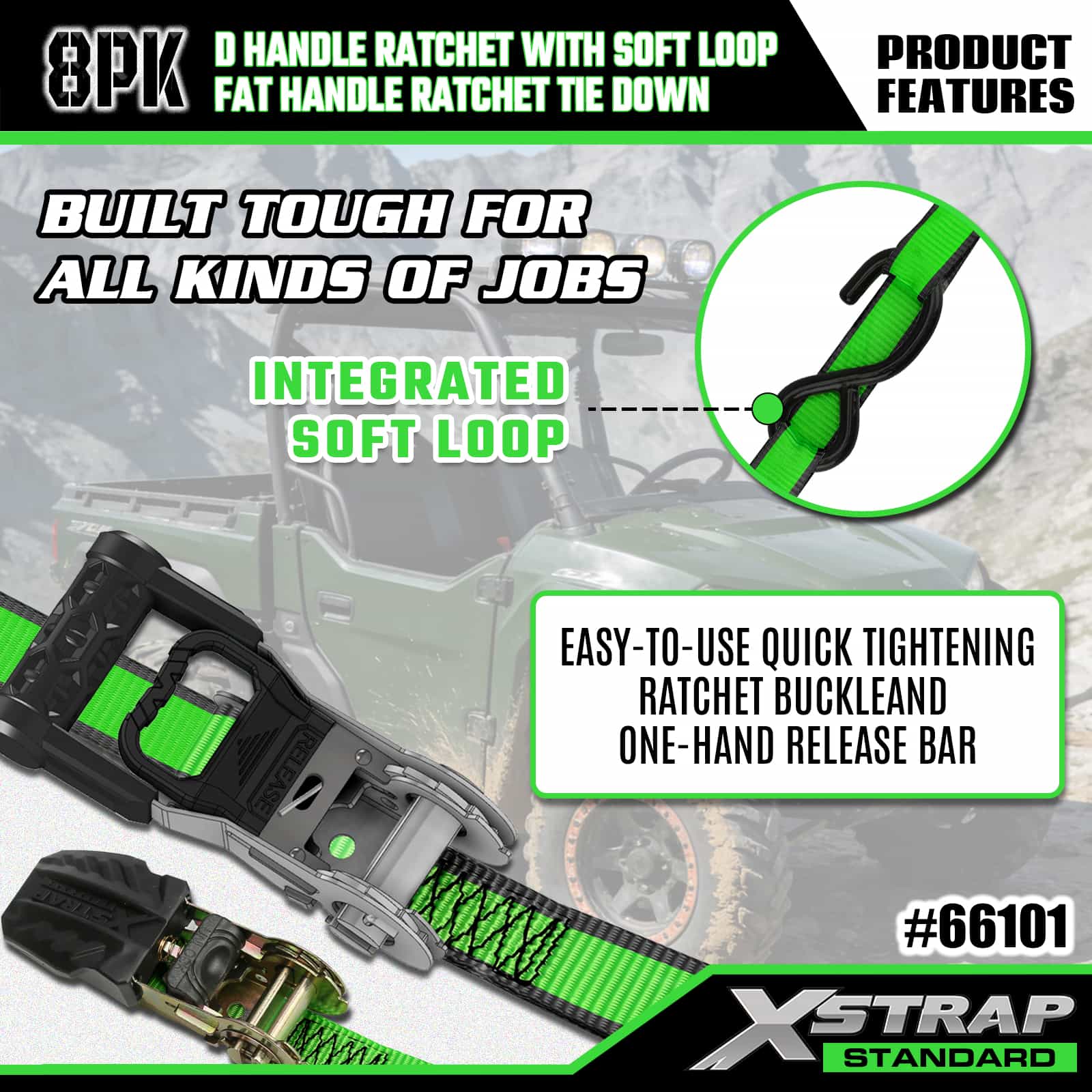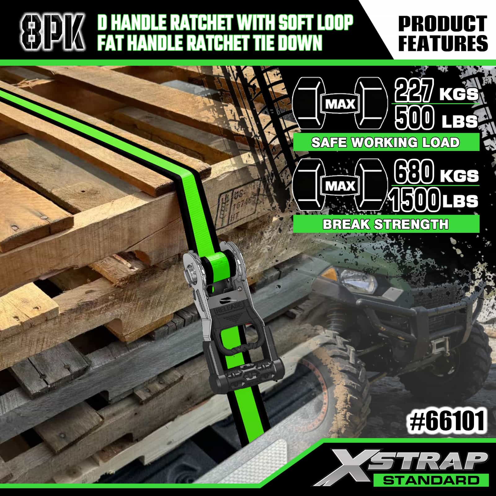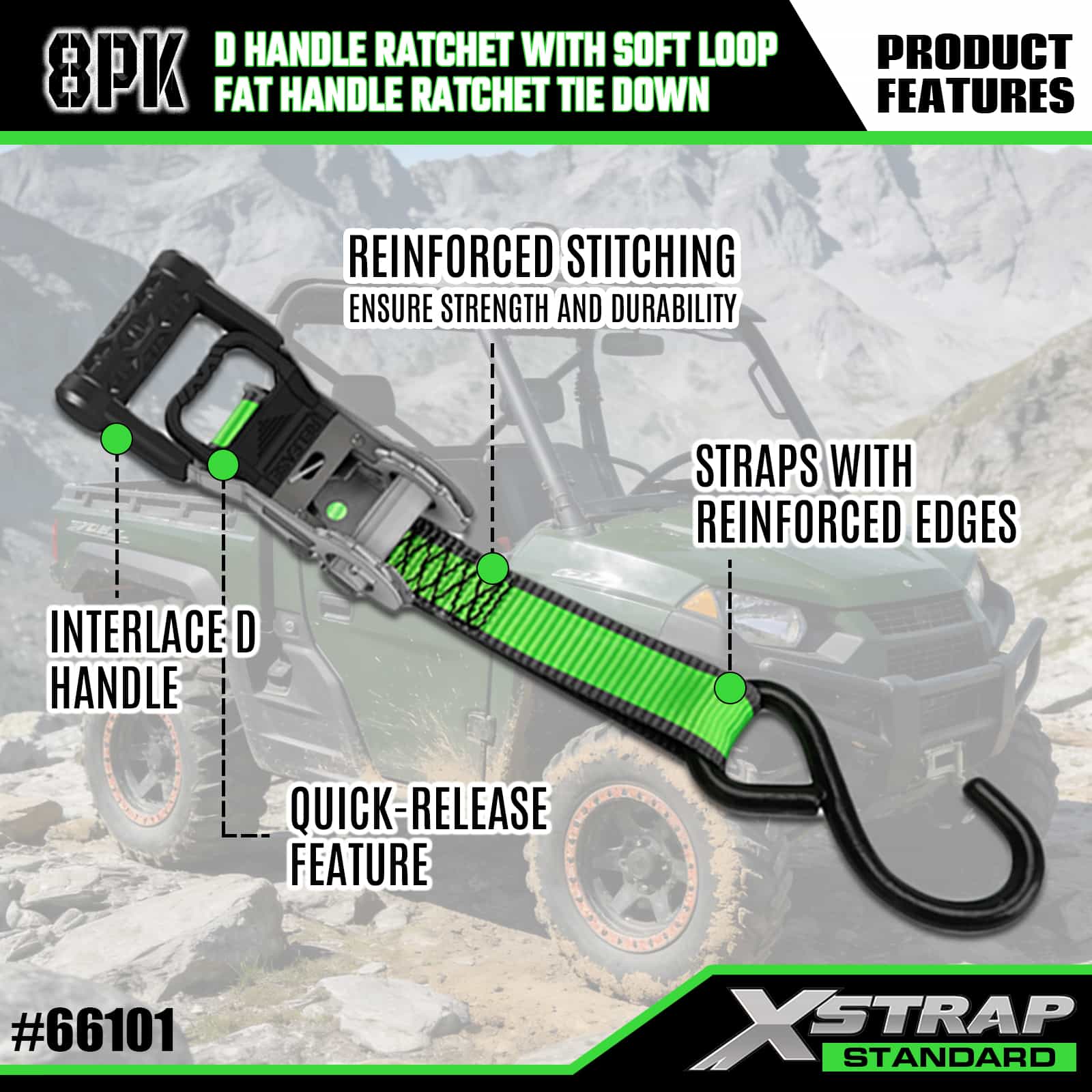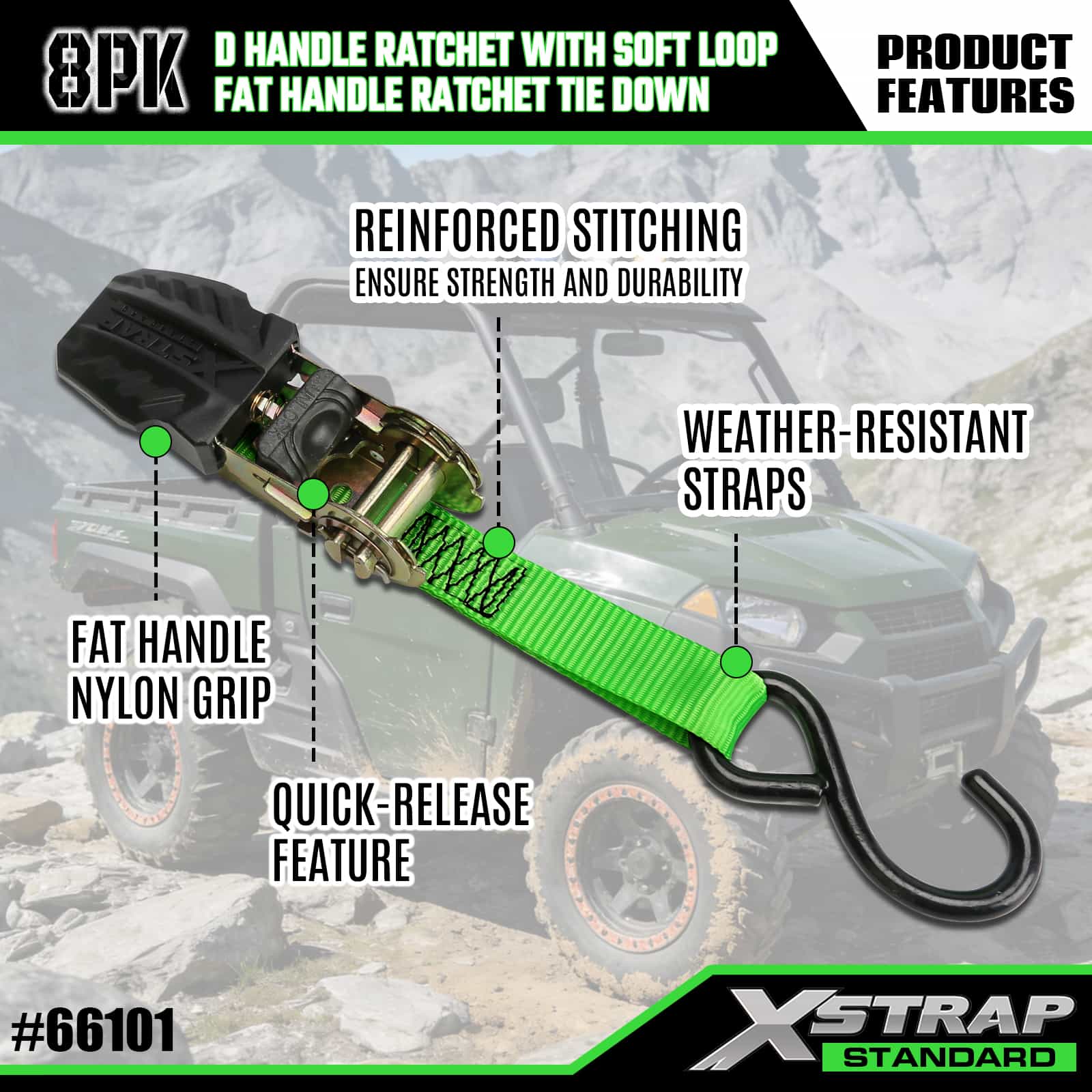 Xstrap 8 Pack alumínium racsnis megkötöző, 1” x 14” és 1 x 12 hüvelykes poliészter rögzítőszíj, húzható racsnis szíj, 500 font teherbírású rakományrögzítő rögzítő hevederek S-kampókkal rakományvezérléshez, kisteherautókhoz, motorkerékpárokhoz, terepjárókhoz.