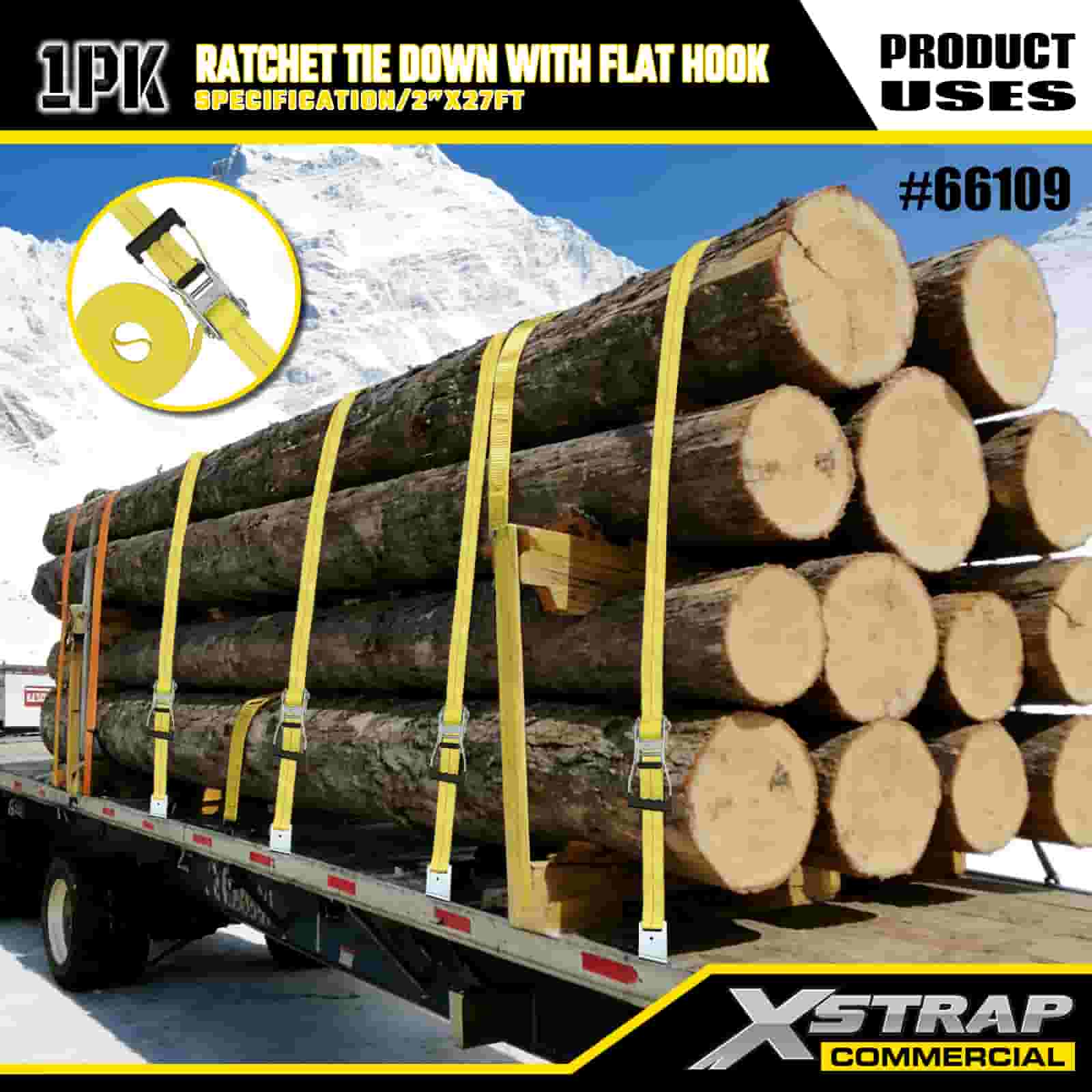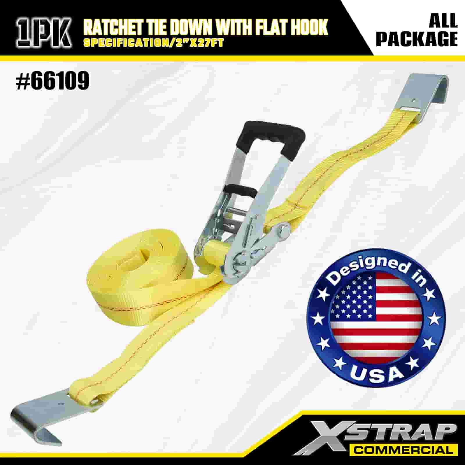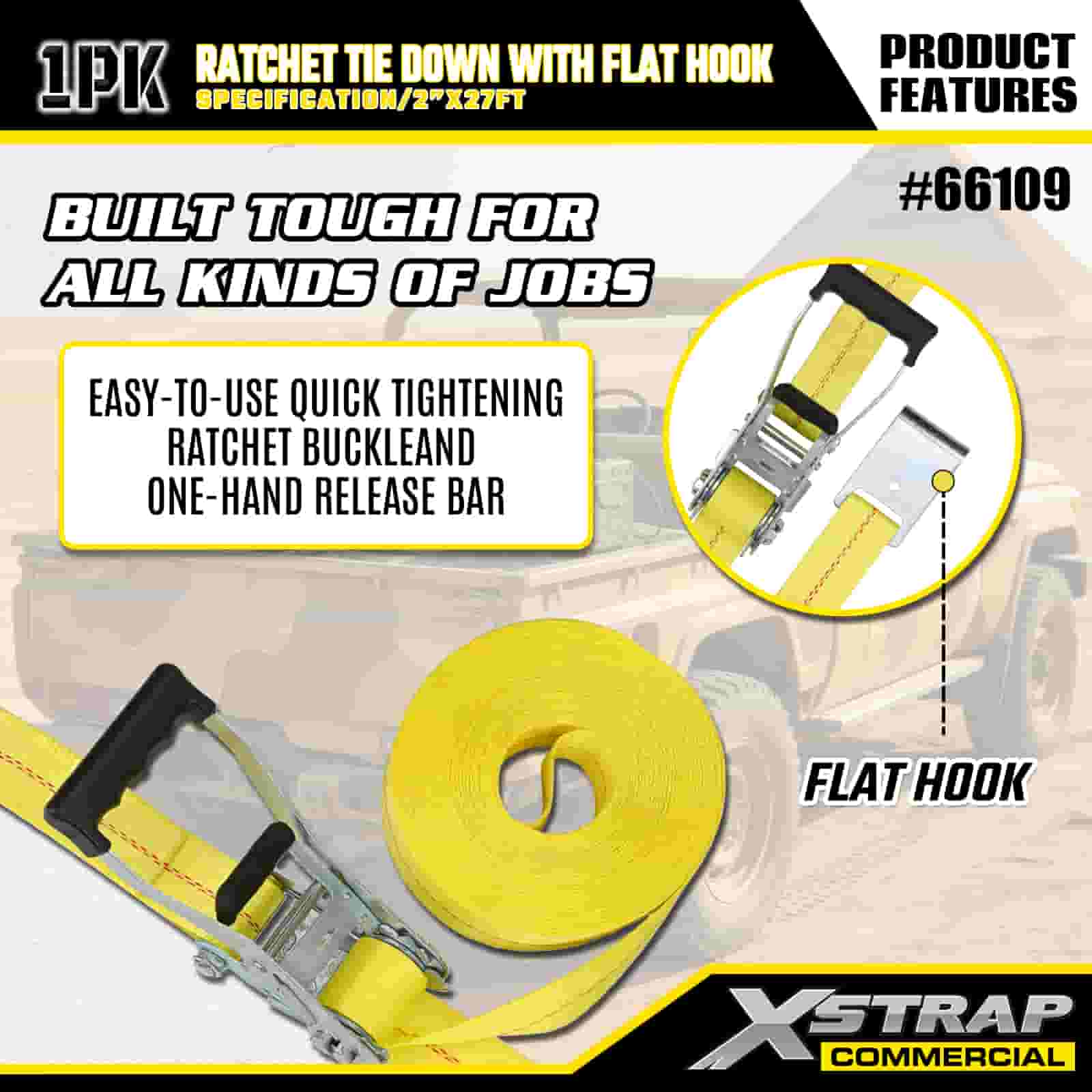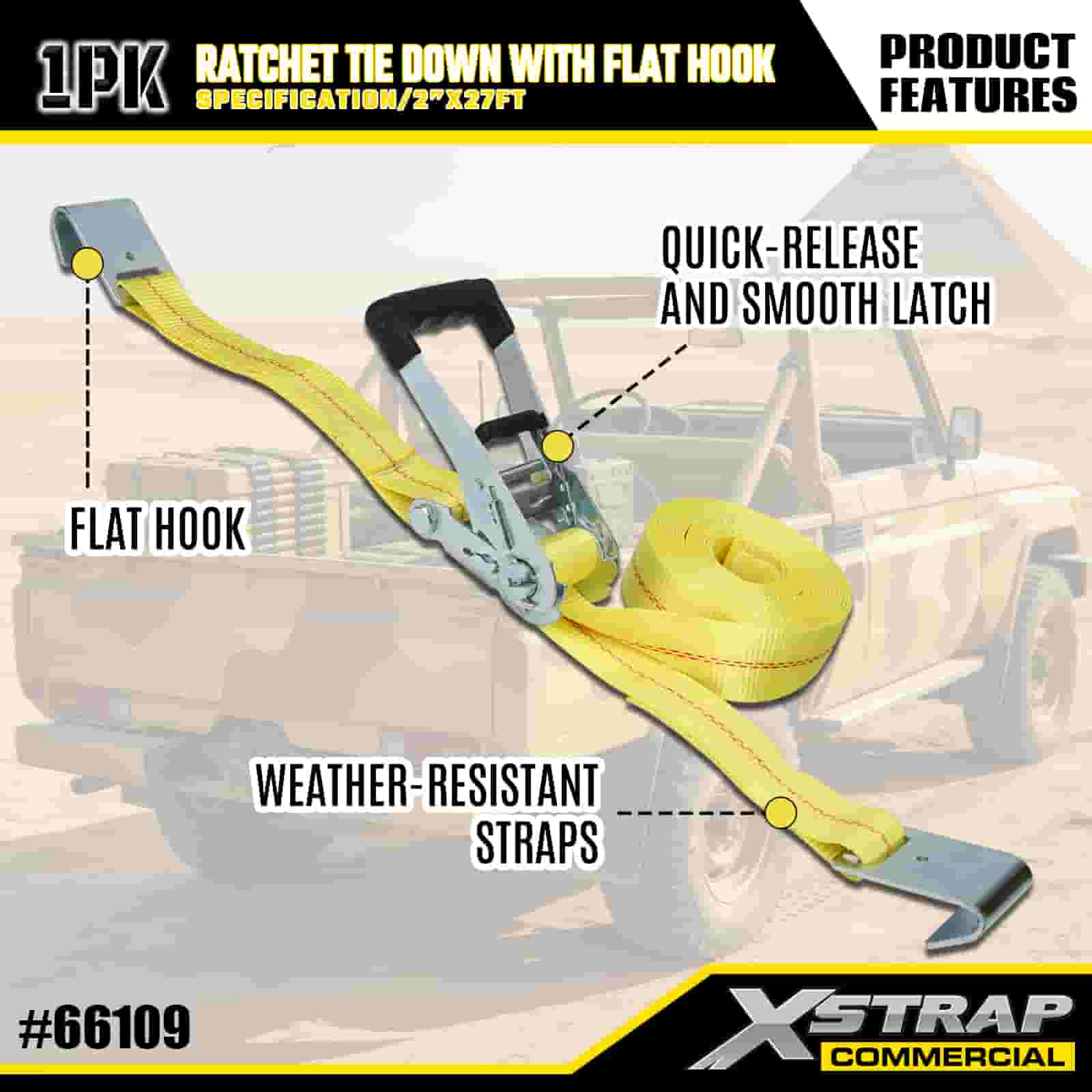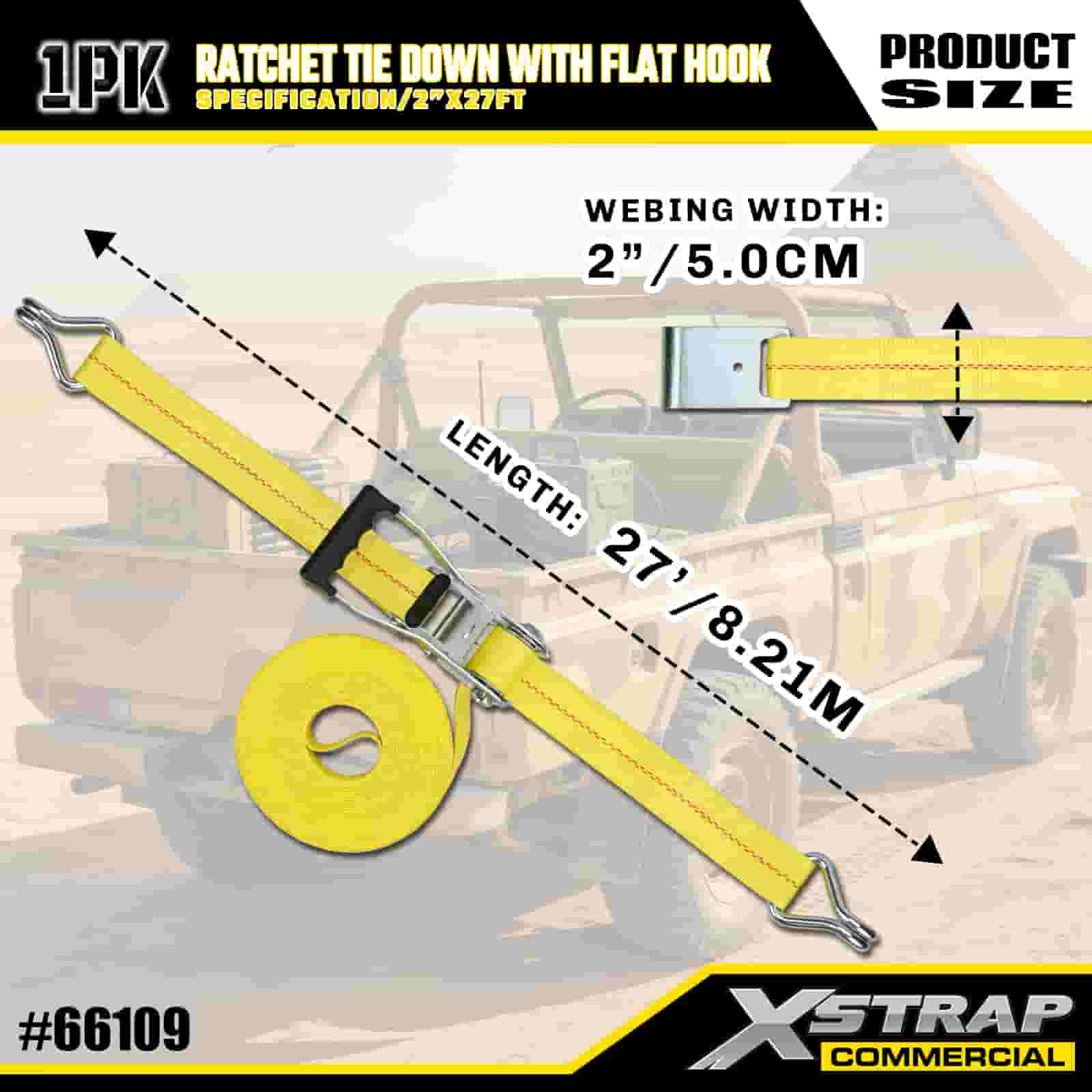 Xstrap Ratchet leköthető lapos horgokkal, 2” x 27” poliészter kötözőszíj húzó racsnis heveder, 3333 font kapacitású rakományrögzítő rögzítő hevederek lapos horgokkal rakományvezérlő kisteherautókhoz, terepjárókhoz, autós felső fogaslécekhez motorkerékpárhoz,.