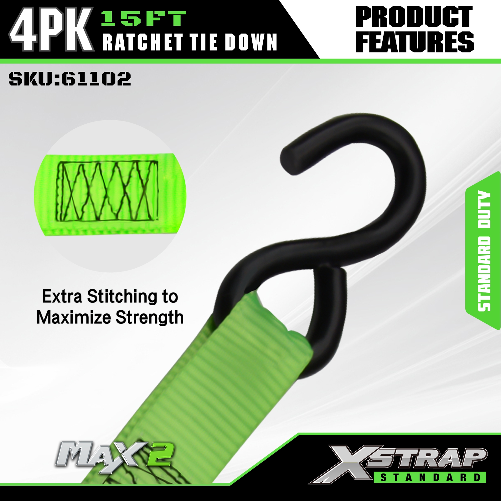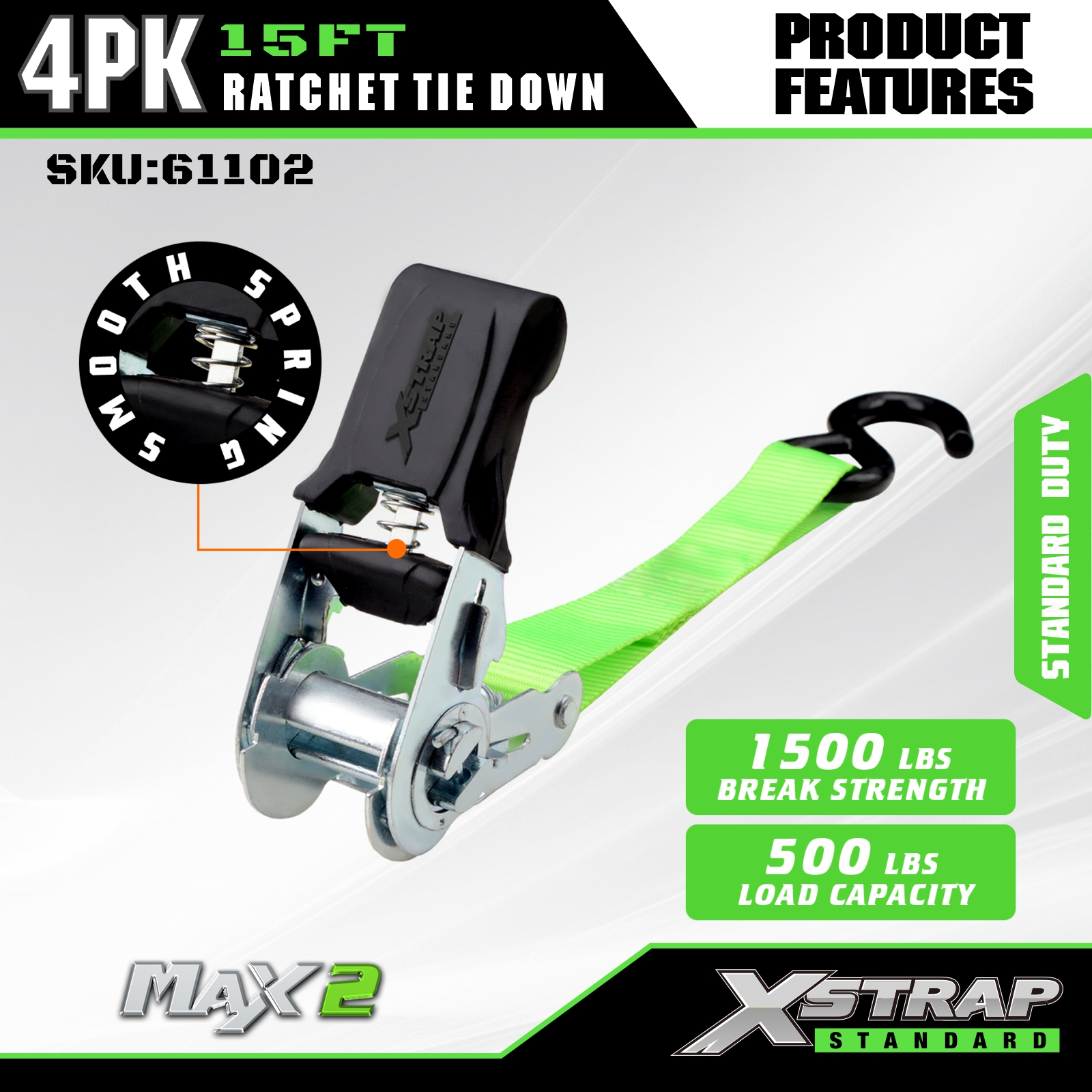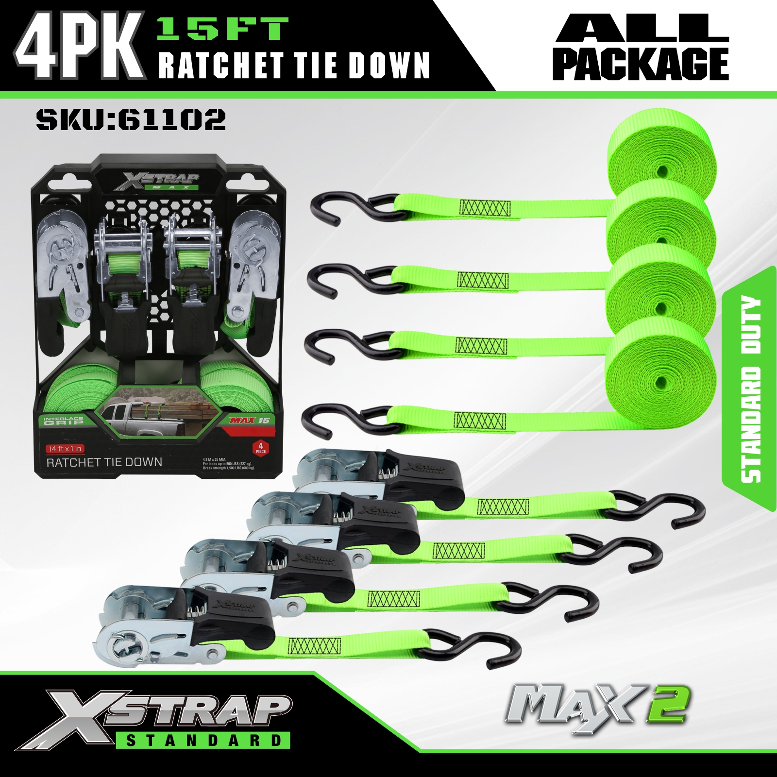Xstrap Ratchet lekötő hevederek 4 PK 15Ft- 500 Lbs Terhelhetőség 1500 Lbs Szakadási szilárdságú teherszíjak mozgatható készülékekhez, füves felszerelésekhez, motorkerékpárokhoz.