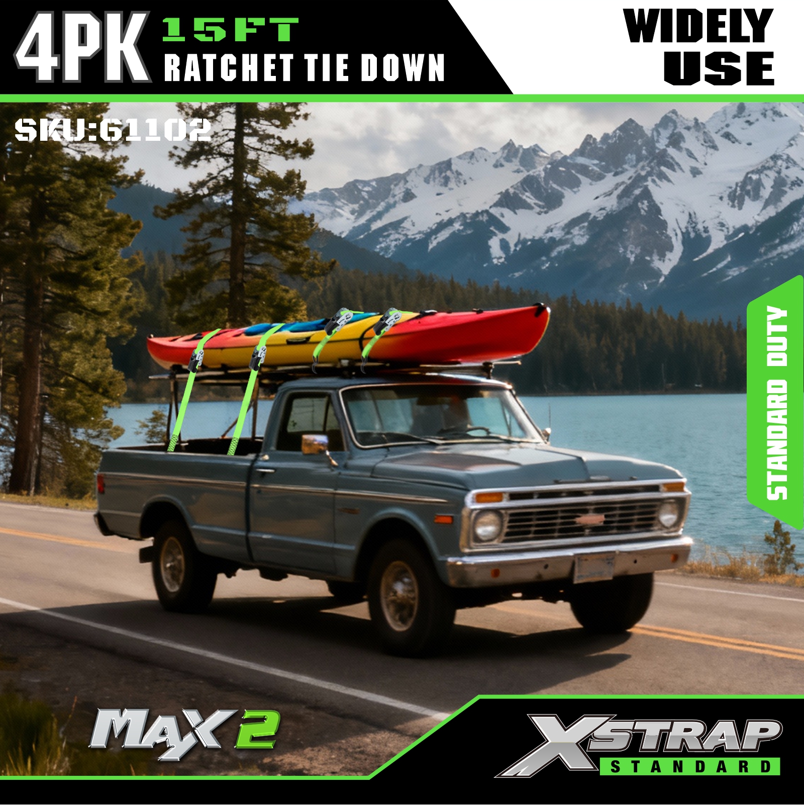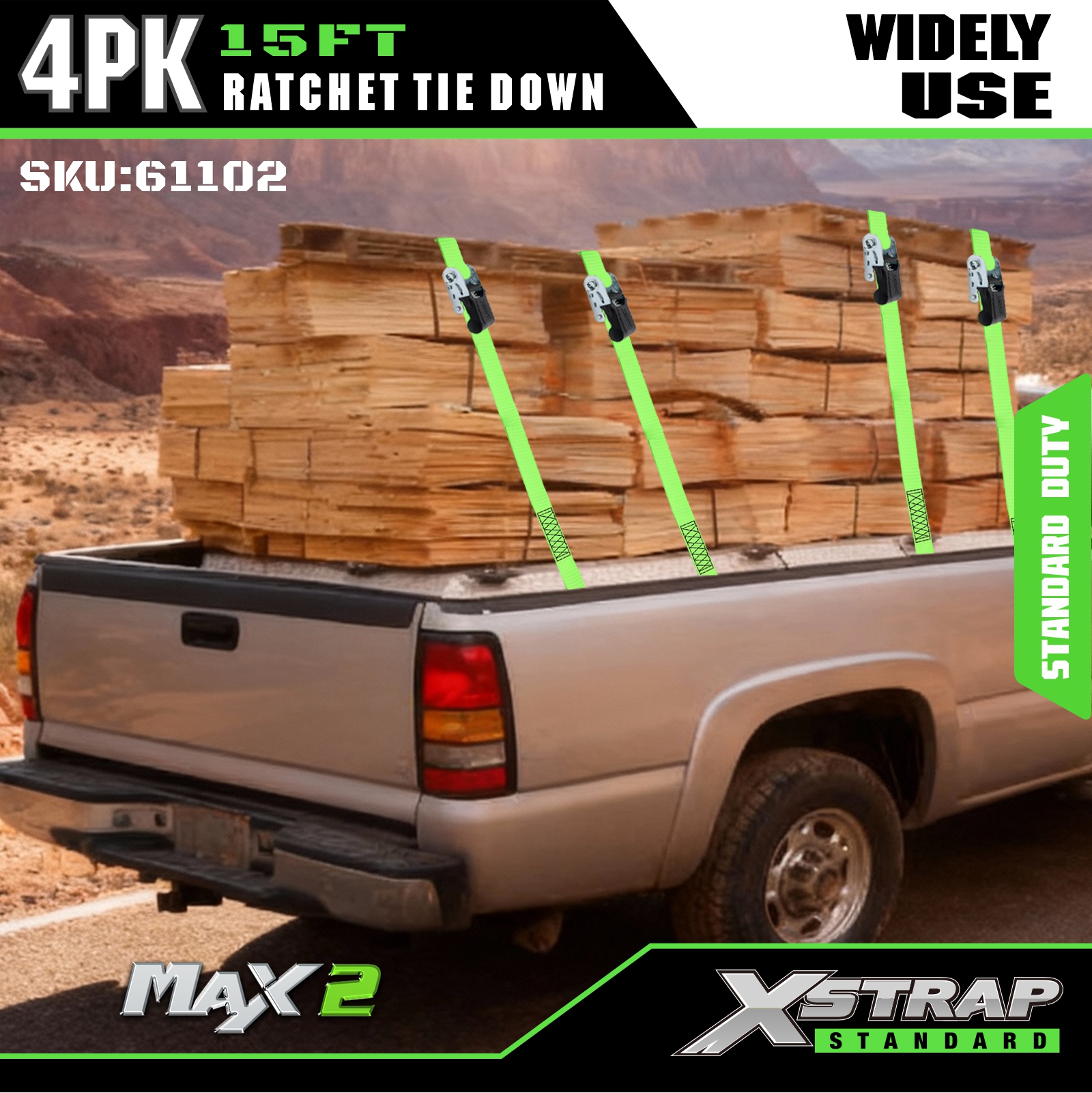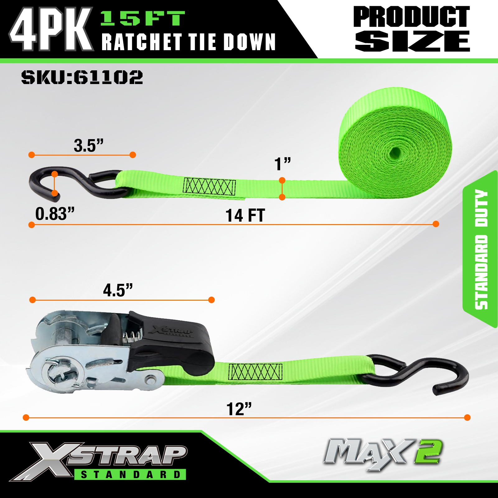 Xstrap Ratchet lekötő hevederek 4 PK 15Ft- 500 Lbs Terhelhetőség 1500 Lbs Szakadási szilárdságú teherszíjak mozgatható készülékekhez, füves felszerelésekhez, motorkerékpárokhoz.