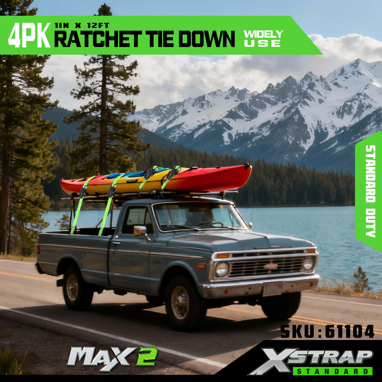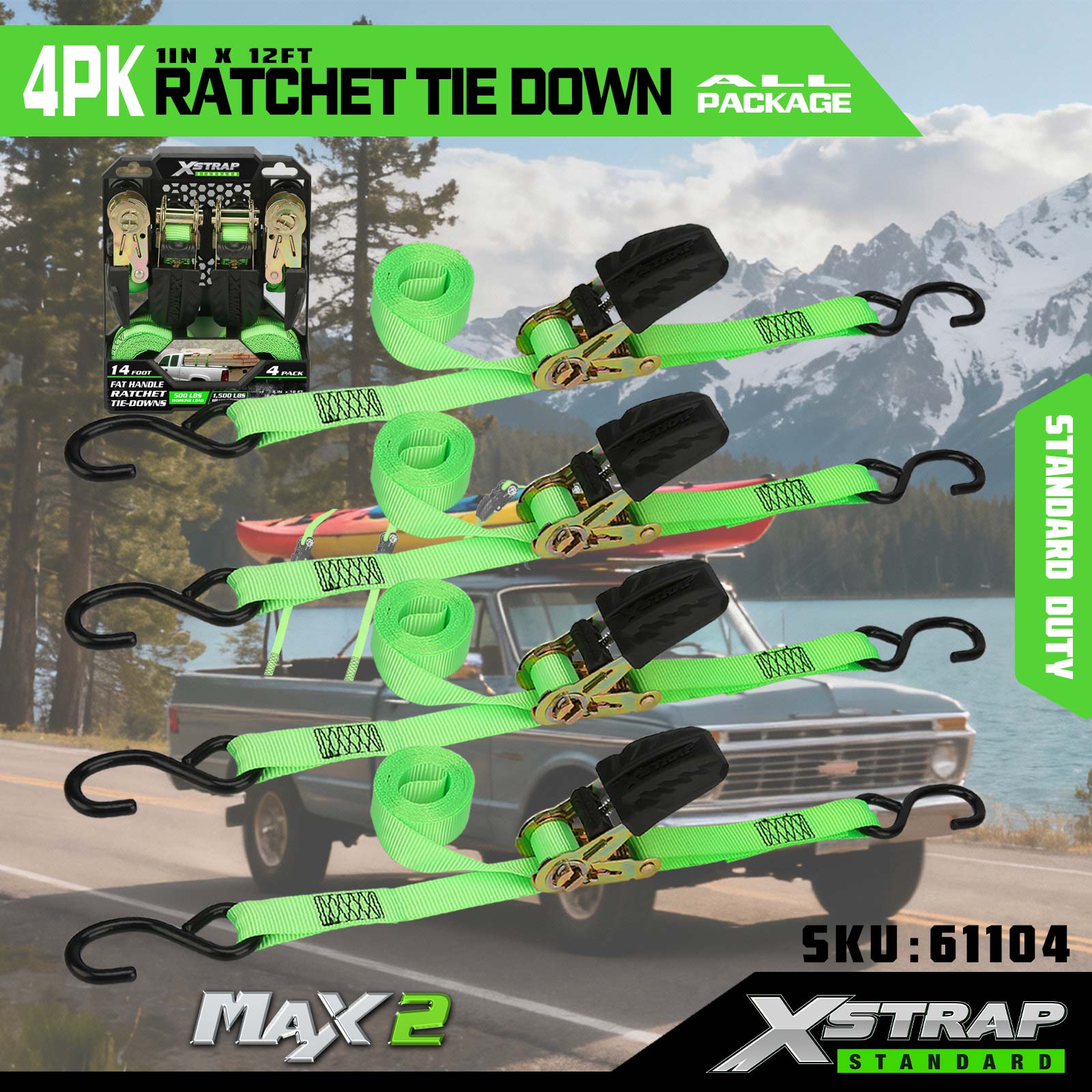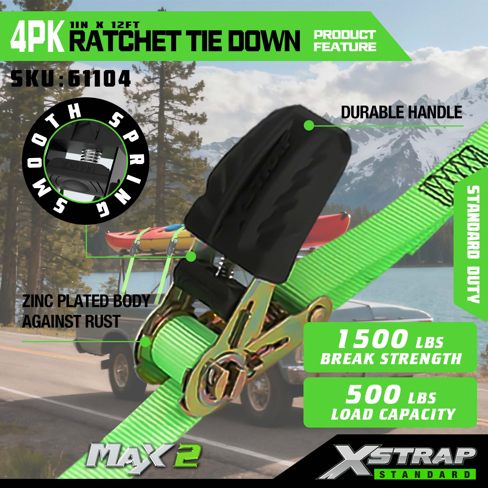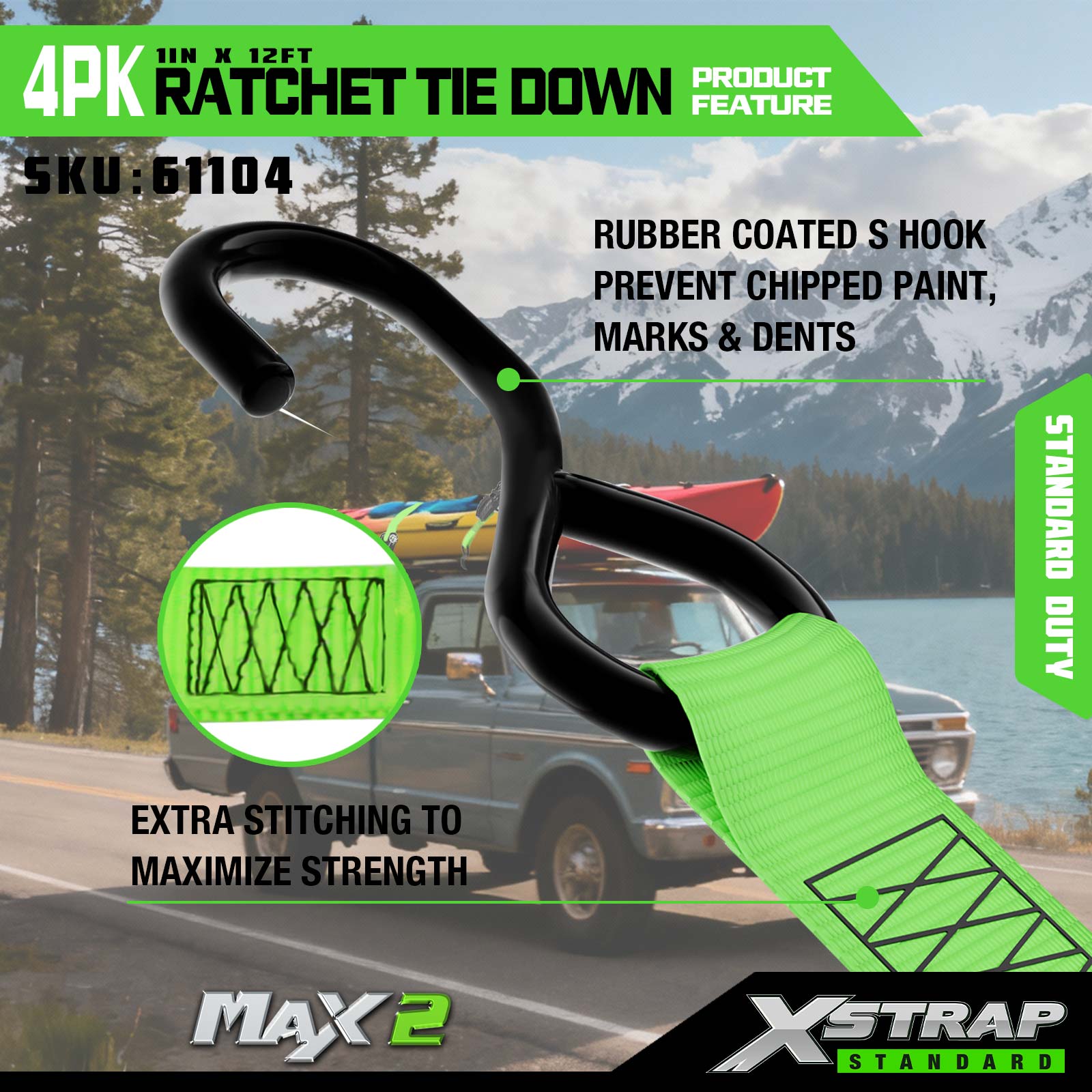 Xstrap 4 csomagos racsnis megkötöző, 1” x 12 hüvelykes poliészter rögzítőszíj, húzható racsnis heveder, 500 font teherbírású rakományrögzítő rögzítő hevederek S horgokkal teherautóhoz, könnyű utánfutó motorkerékpárhoz, könnyű horgászcsónakhoz, jet-skihez, motoros szánhoz.