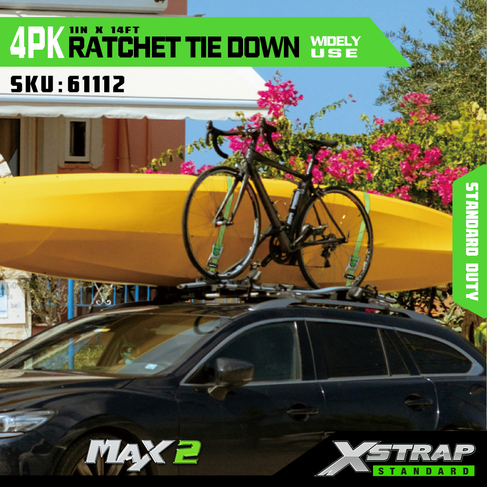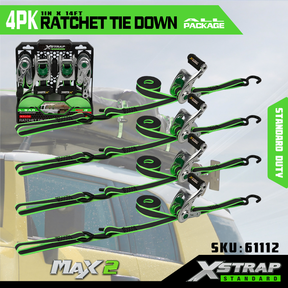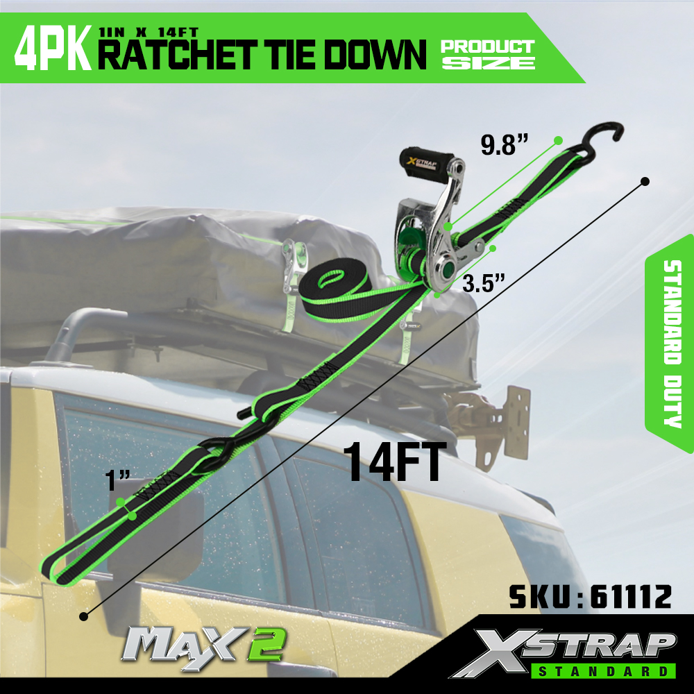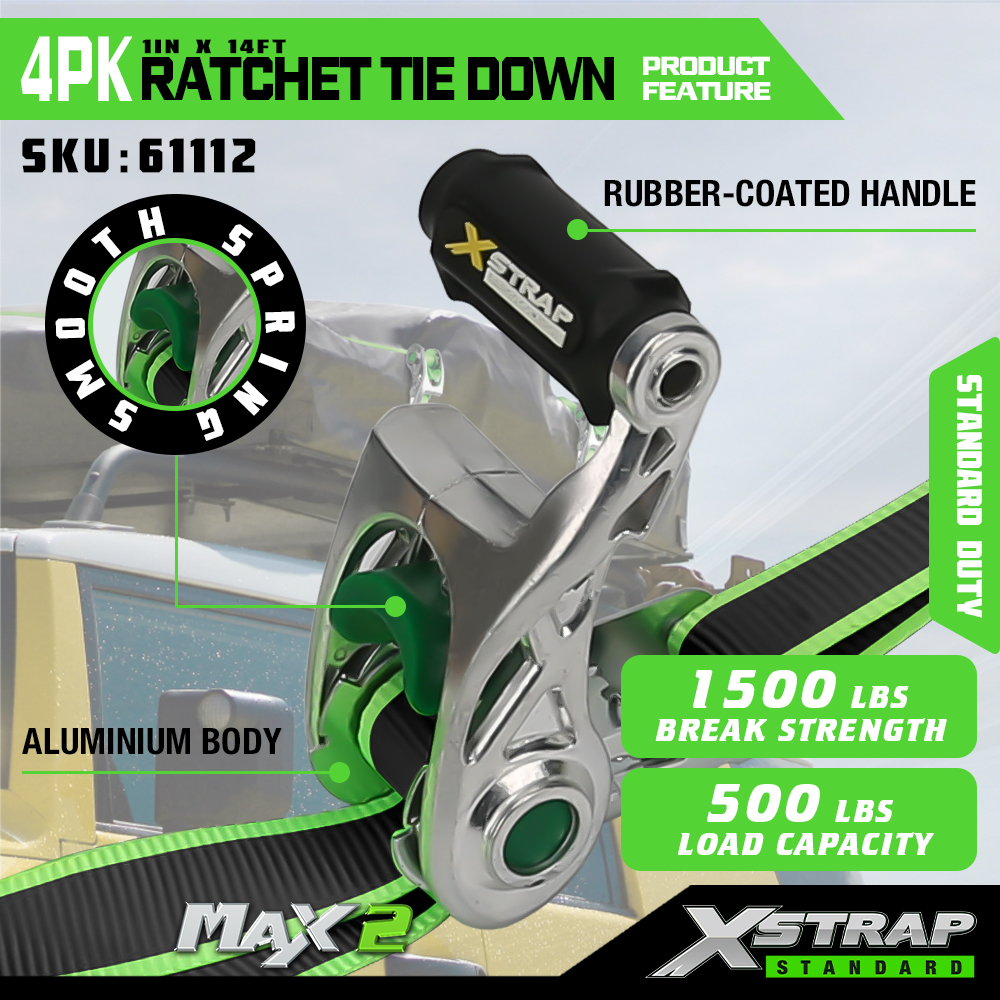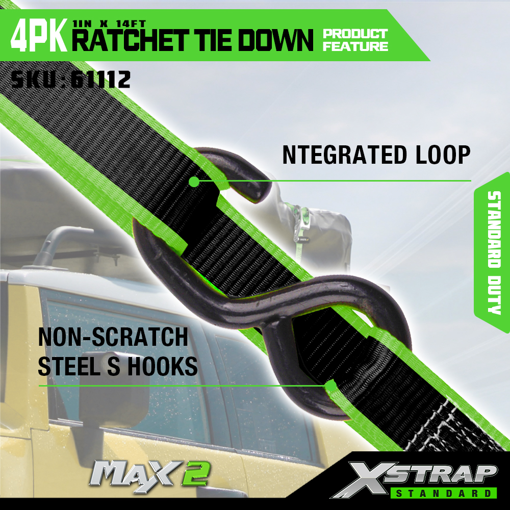 Xstrap 4 csomagban megköthető, nyitott fogantyús racsnis hevederek, 1"x 14" poliészter racsnis rögzítőszíj puha hurokkal, 1500 font (500 font) teherbírású rakományrögzítő rögzítő hevederek alumínium racsnis és S horgokkal, Mower, ATV-khez