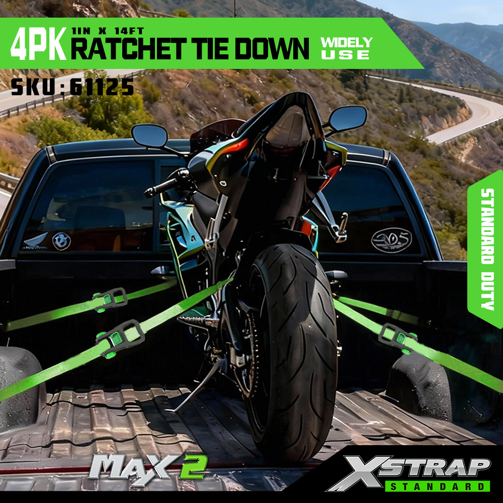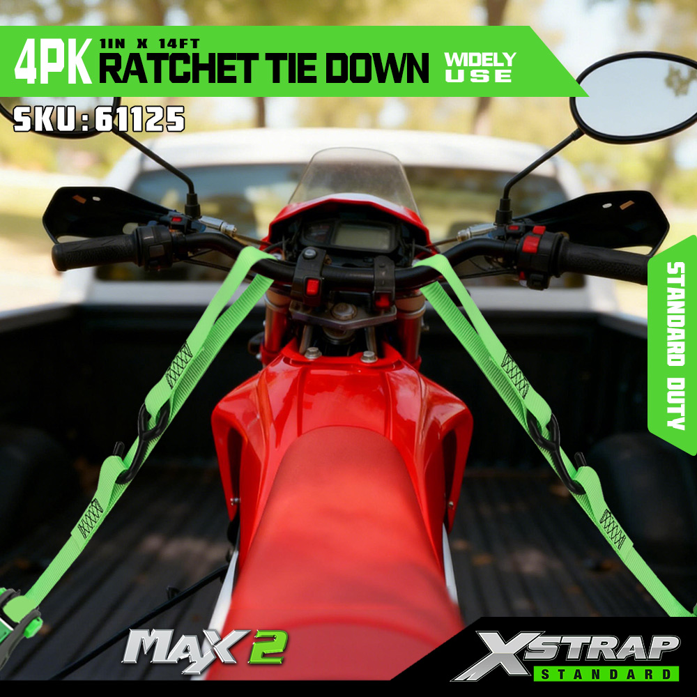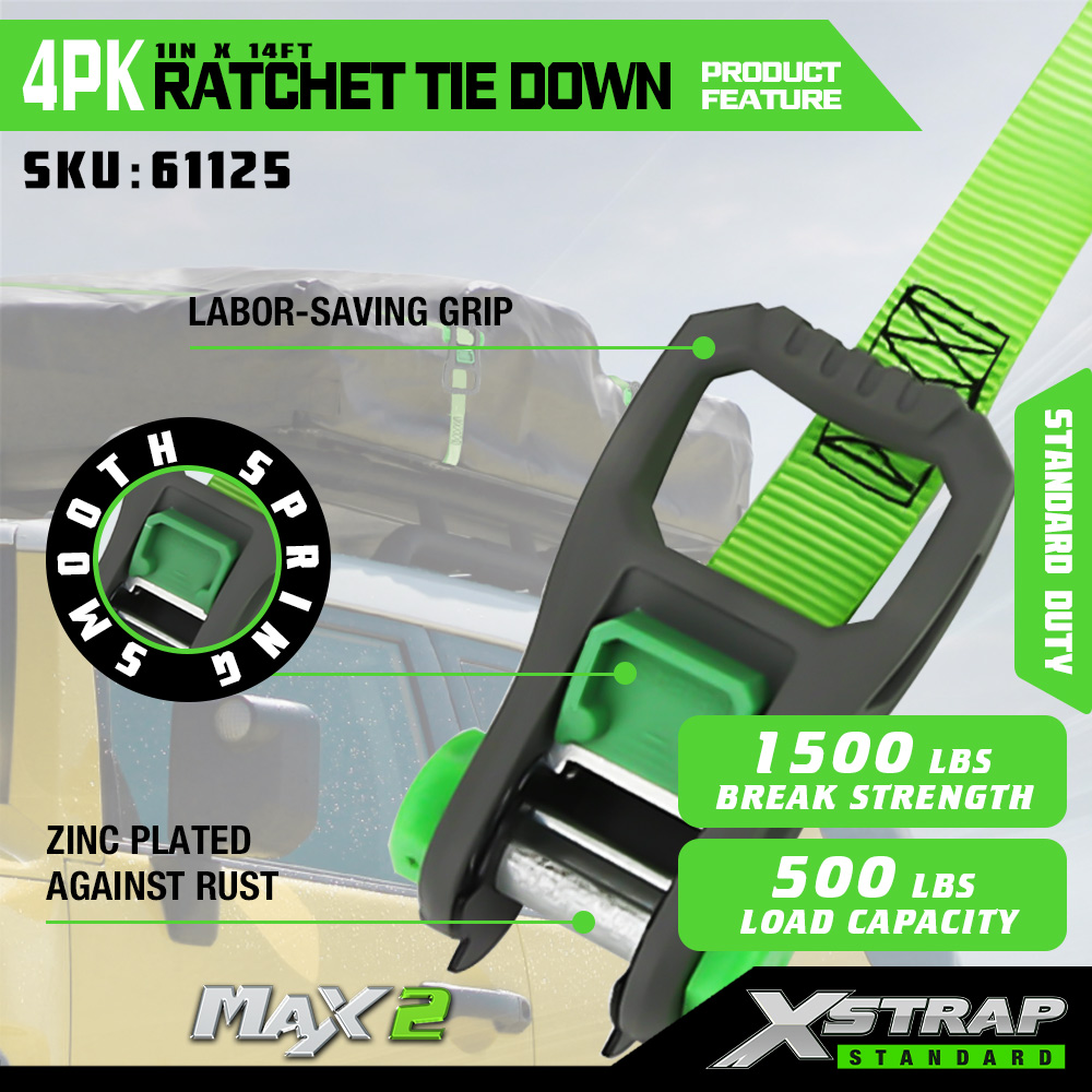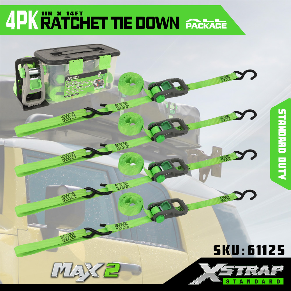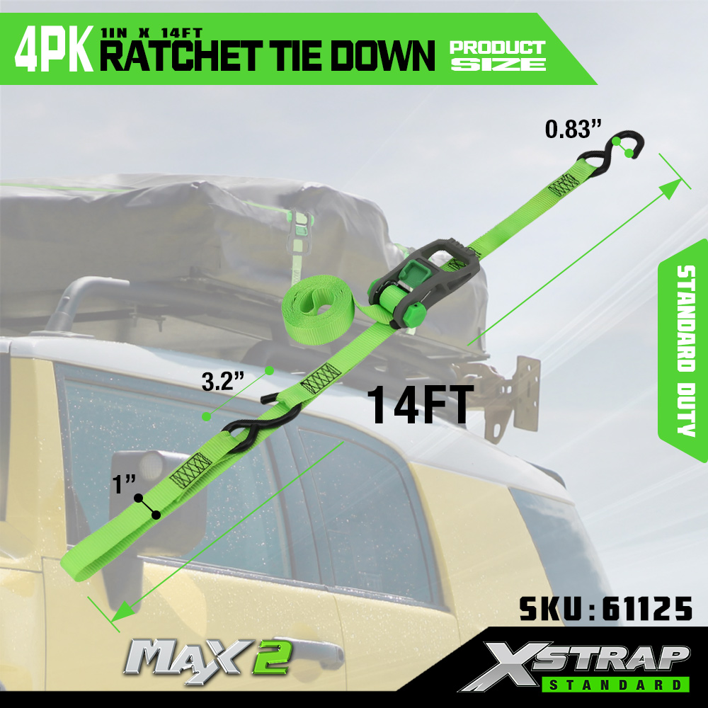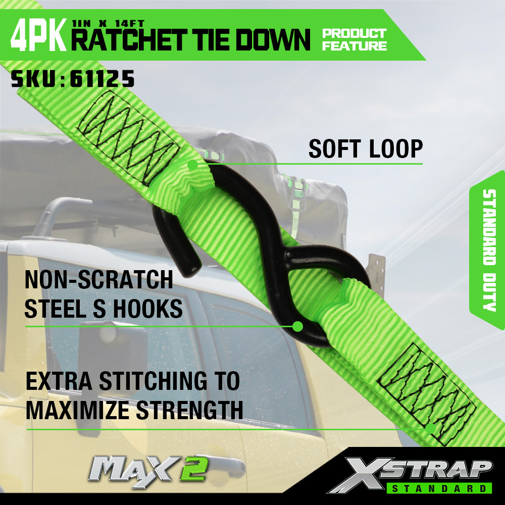 Xstrap 4 csomagos racsnis rögzítőpánt, 1 x 14 colos poliészter rögzítőszíj puha hurokkal, húzható racsnis pánttal, 500 font teherbírású rakományrögzítő rögzítő hevederek S horgokkal kisteherautókhoz, terepjárókhoz, autós fogaskerekekhez, motorkerékpárokhoz, könnyű horgászcsónakokhoz, hómobilokhoz, jetekhez.