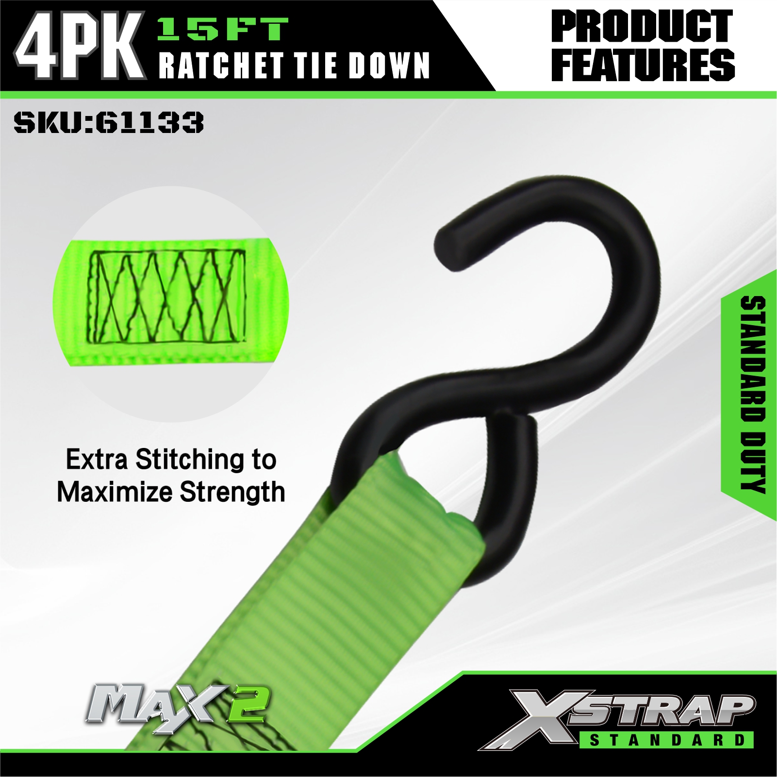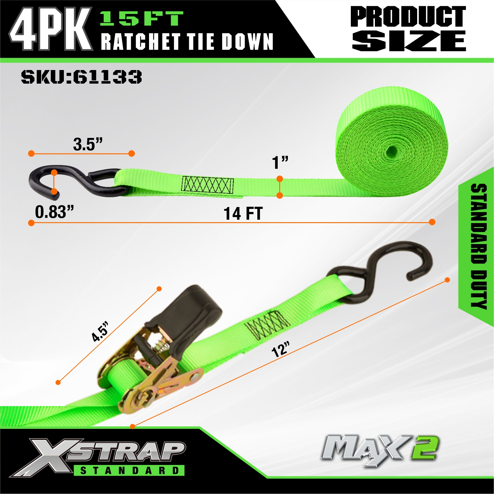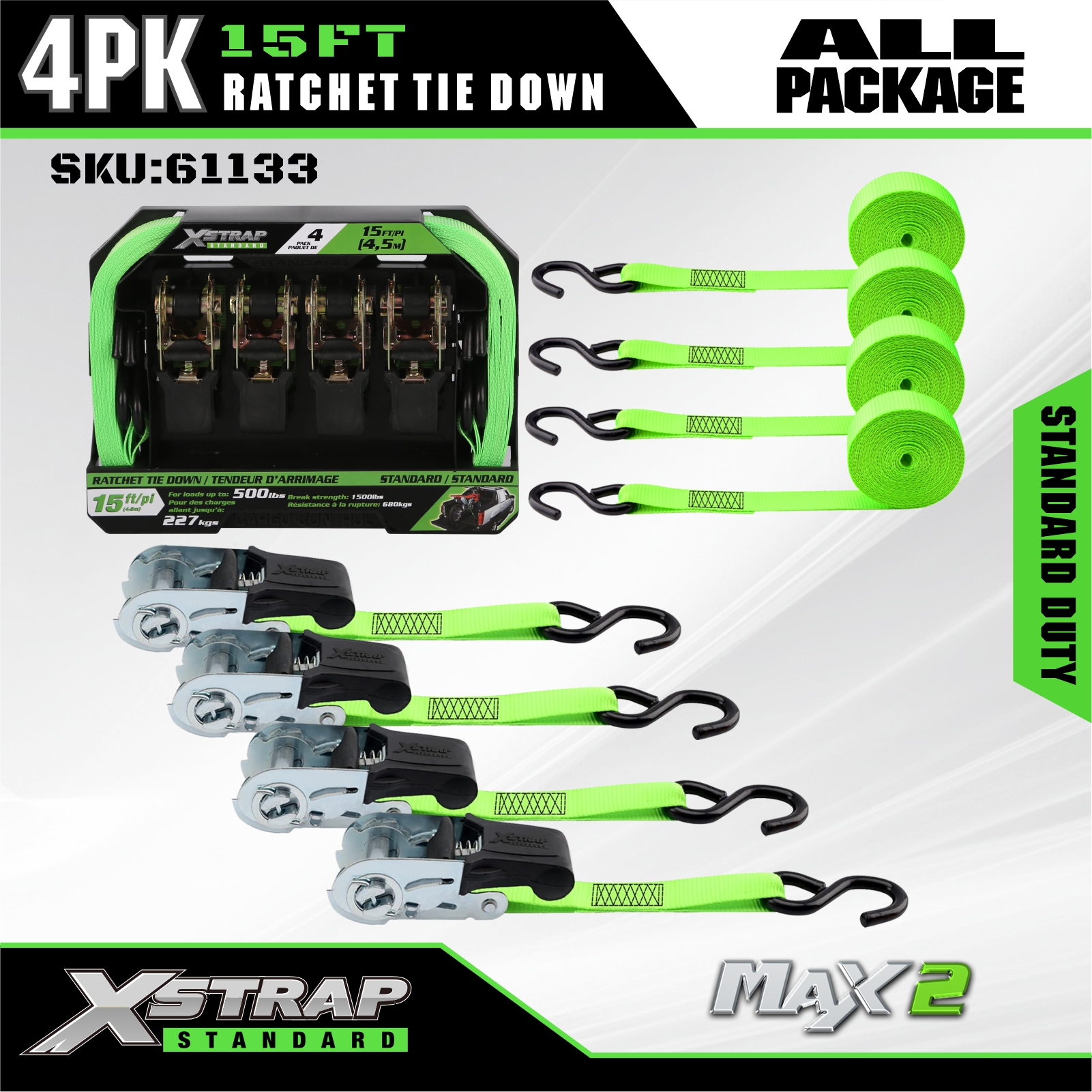 Xstrap 4 Pack Ratchet Tie Down, 1” x 15 colos poliészter megkötőszíj, húzható racsnis heveder, 500 font teherbírású rakományrögzítő rögzítő hevederek S-kampókkal teherautókhoz, SUV-okhoz, autós fogaskerekekhez, motorkerékpárokhoz, könnyű horgászcsónakokhoz, jet-ski-hez, hómobilhoz.