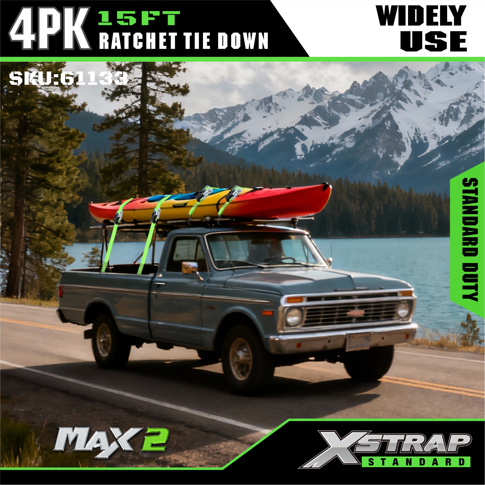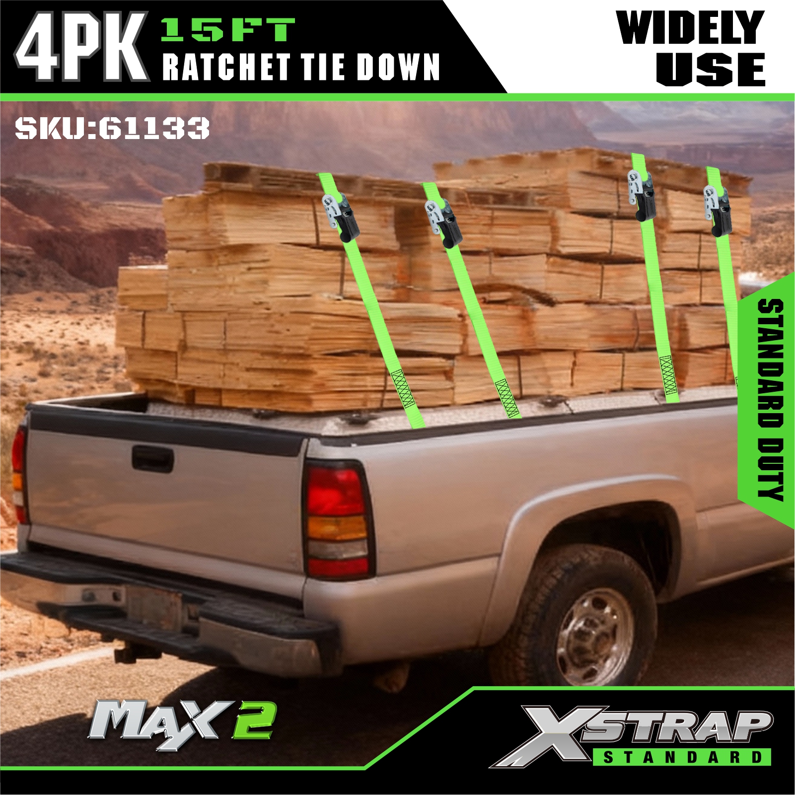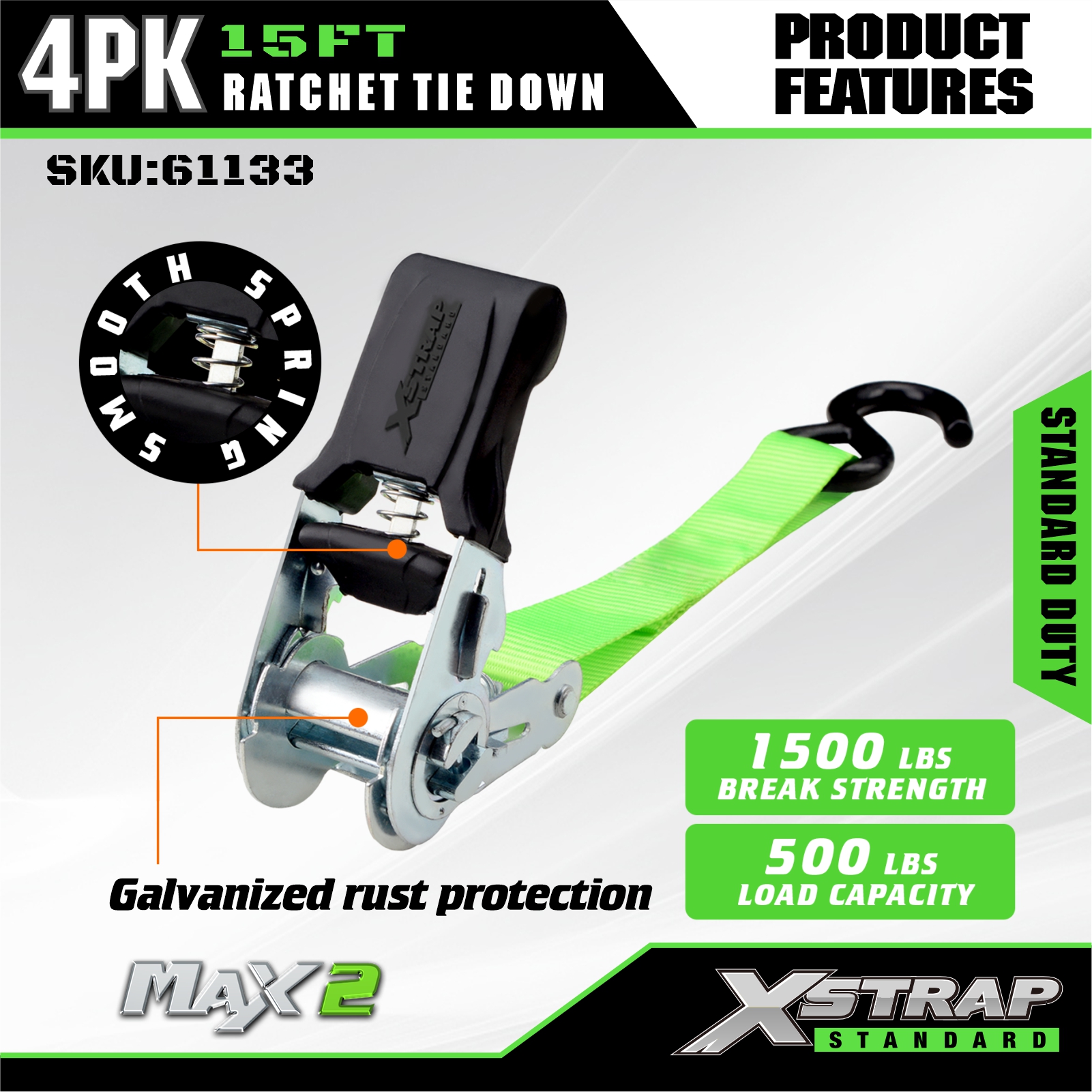 Xstrap 4 Pack Ratchet Tie Down, 1” x 15 colos poliészter megkötőszíj, húzható racsnis heveder, 500 font teherbírású rakományrögzítő rögzítő hevederek S-kampókkal teherautókhoz, SUV-okhoz, autós fogaskerekekhez, motorkerékpárokhoz, könnyű horgászcsónakokhoz, jet-ski-hez, hómobilhoz.