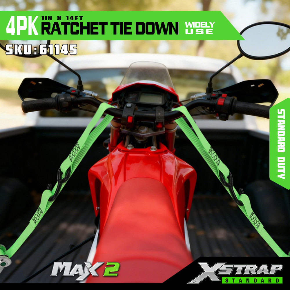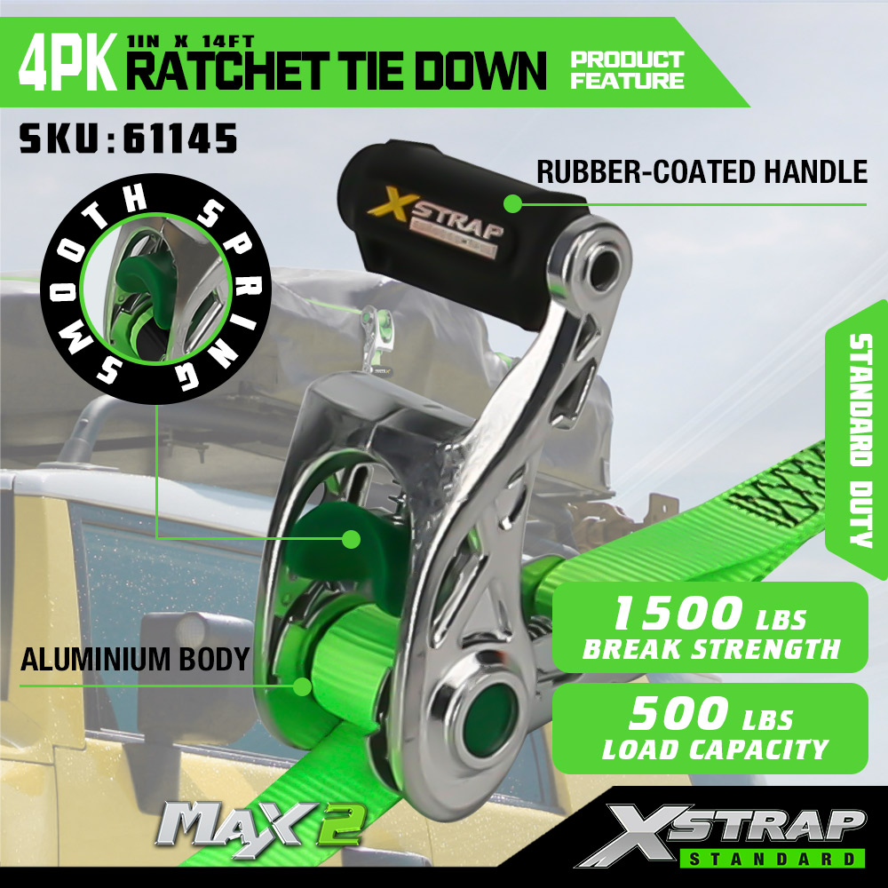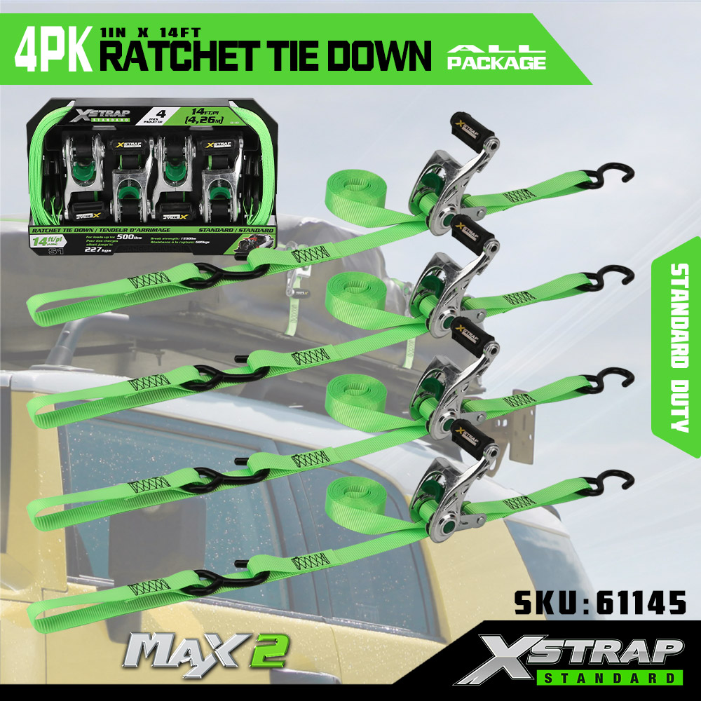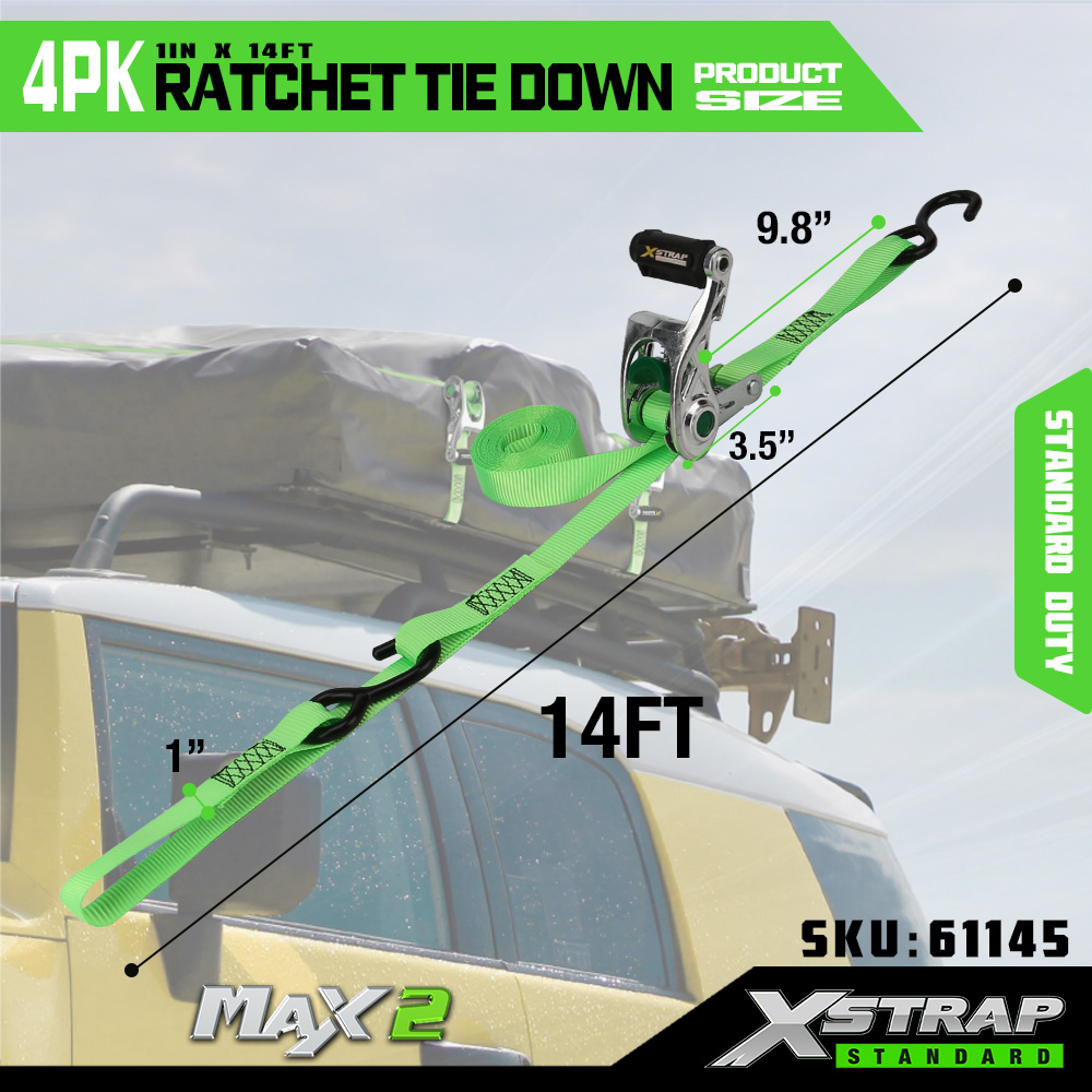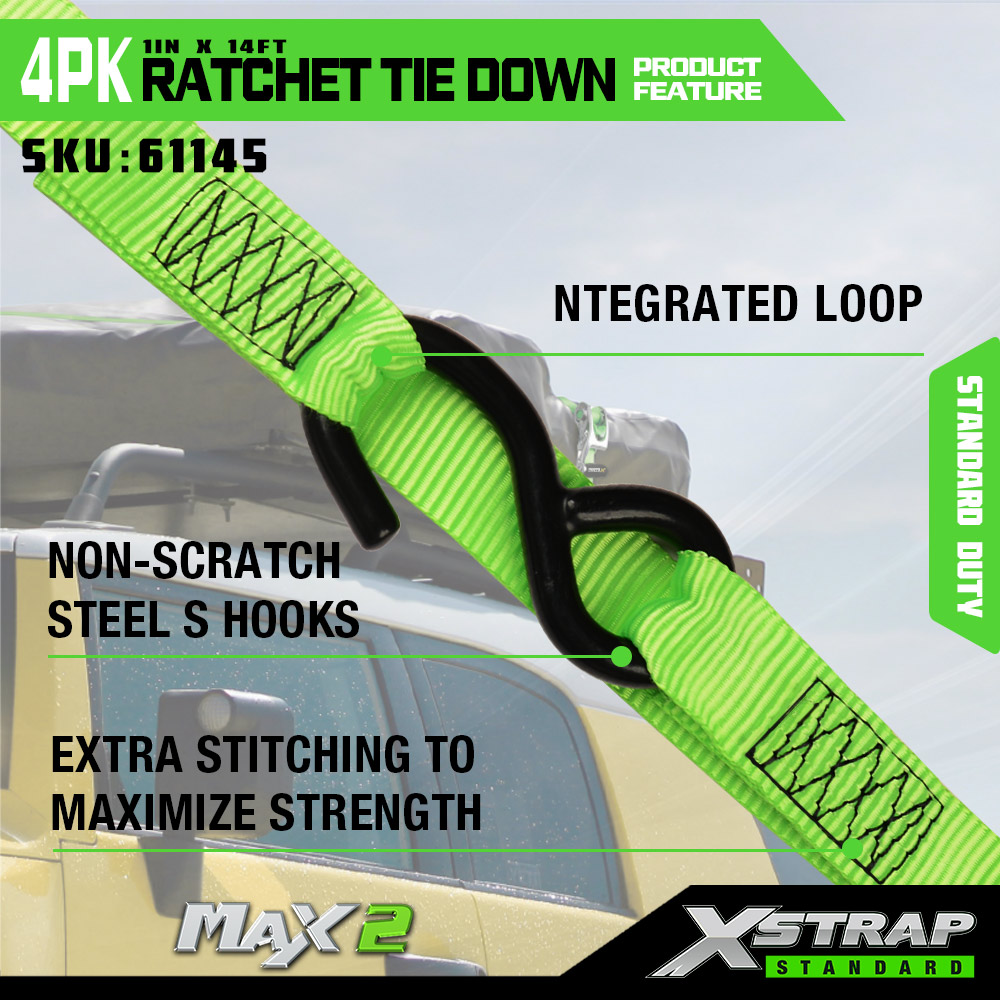 Xstrap 4 csomagos racsnis rögzítés puha hurokkal, 1” x 14” poliészter megkötő heveder, kihúzható racsnis heveder, 1000 font teherbírású rakományrögzítő rögzítő hevederek S horgokkal teherautóhoz, SUV-hoz, autós motorkerékpárhoz.