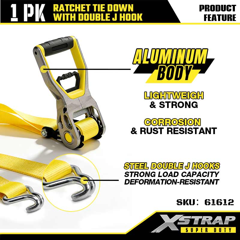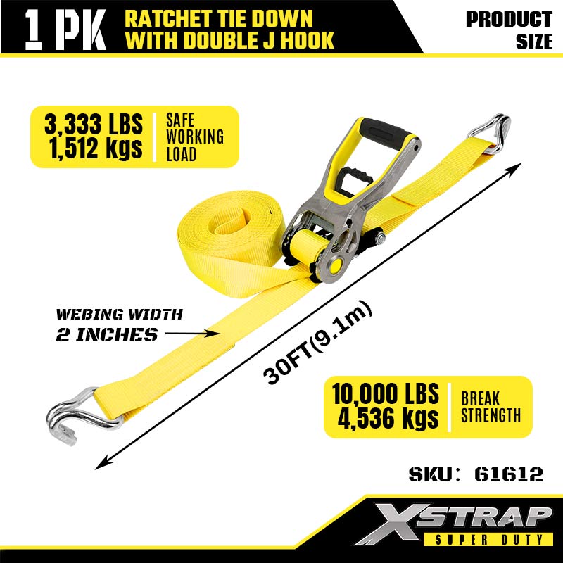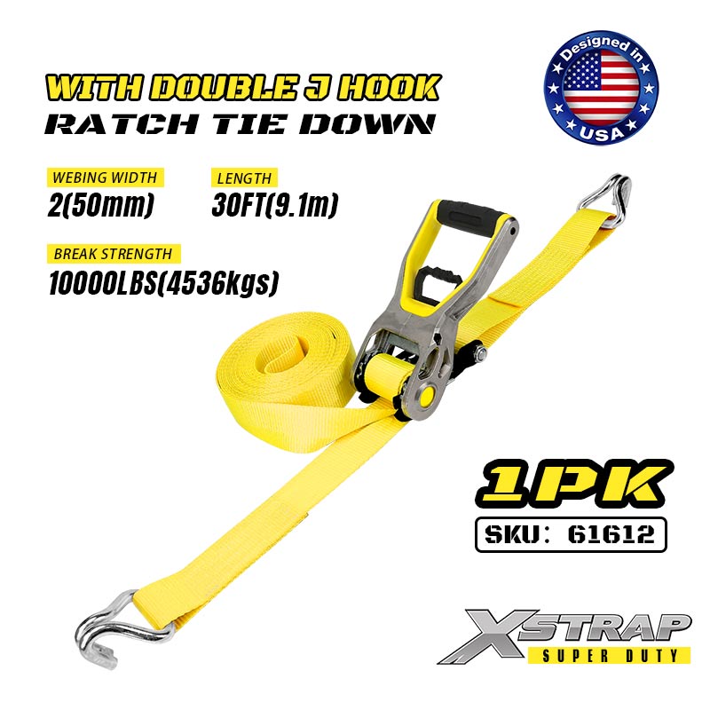 Xstrap 2PK Ratcet lekötő dupla J horgokkal, 2” x 30” poliészter rögzítőszíj racsnis heveder, 3333 font teherbírású rakományrögzítő rögzítő hevederek dupla J horgokkal nagy teherbírású utánfutókhoz, síkágyas utánfutóhoz, sícsónakhoz, kisautóhoz, nehéz felszereléshez.